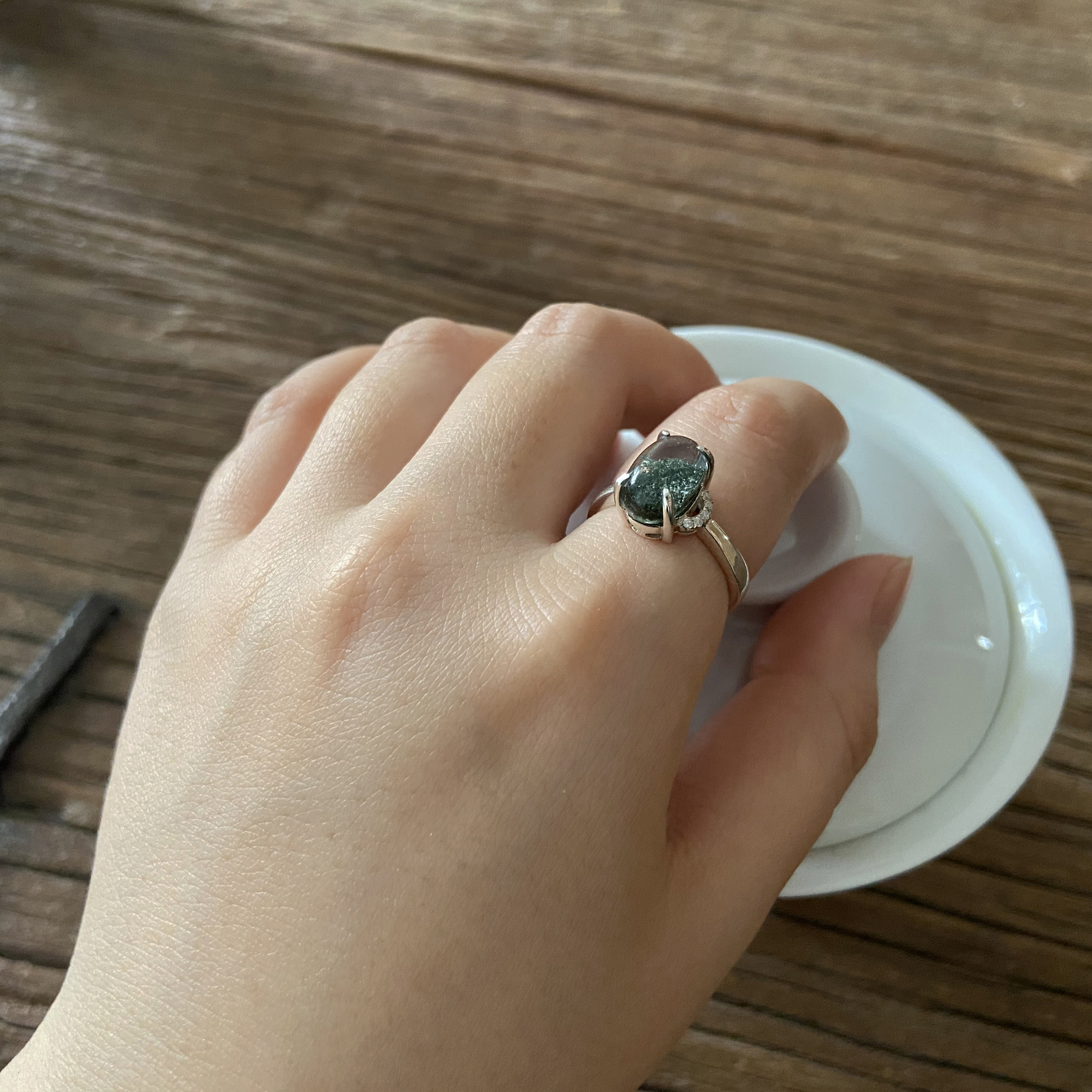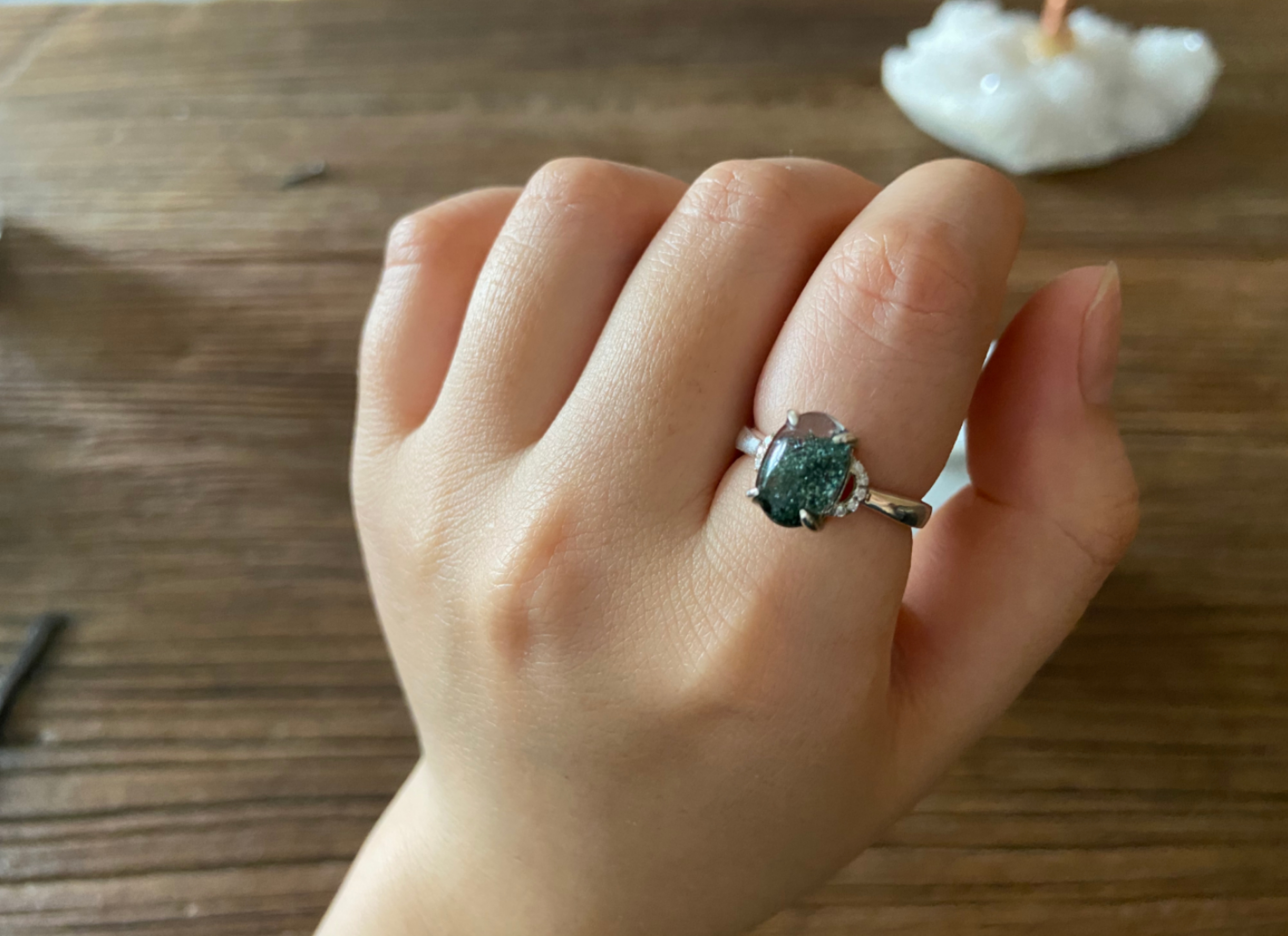 绿幽灵里含有绿泥石矿物质,在通透的白水晶内部,呈现出形如聚宝盘、水草、漩涡、金字塔、满天星等天然图纹,因此绿幽灵又被称为“异象水晶”,这款戒指里面的矿物质为聚宝盘形状。