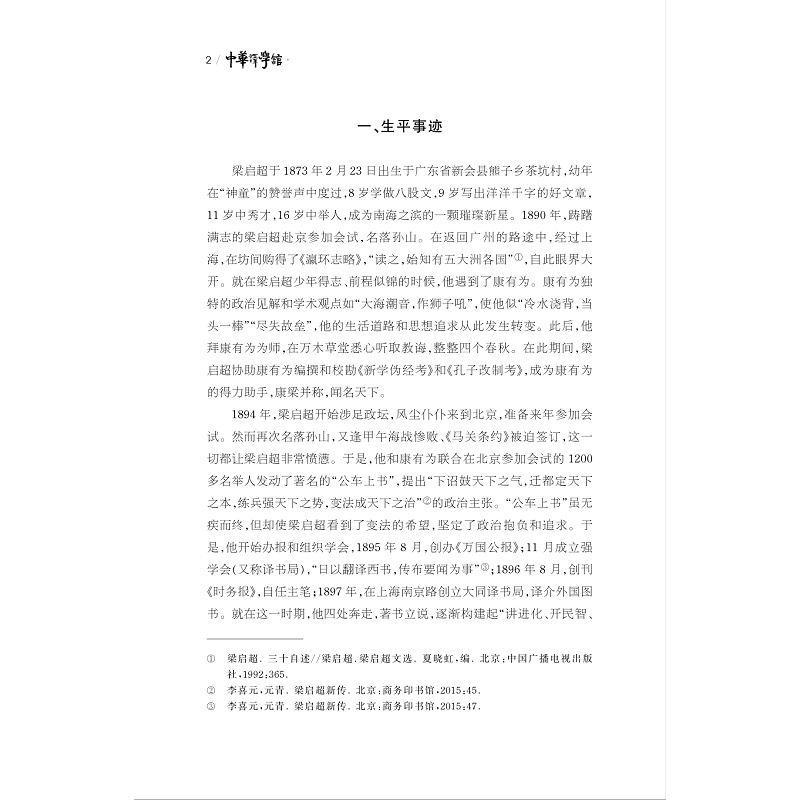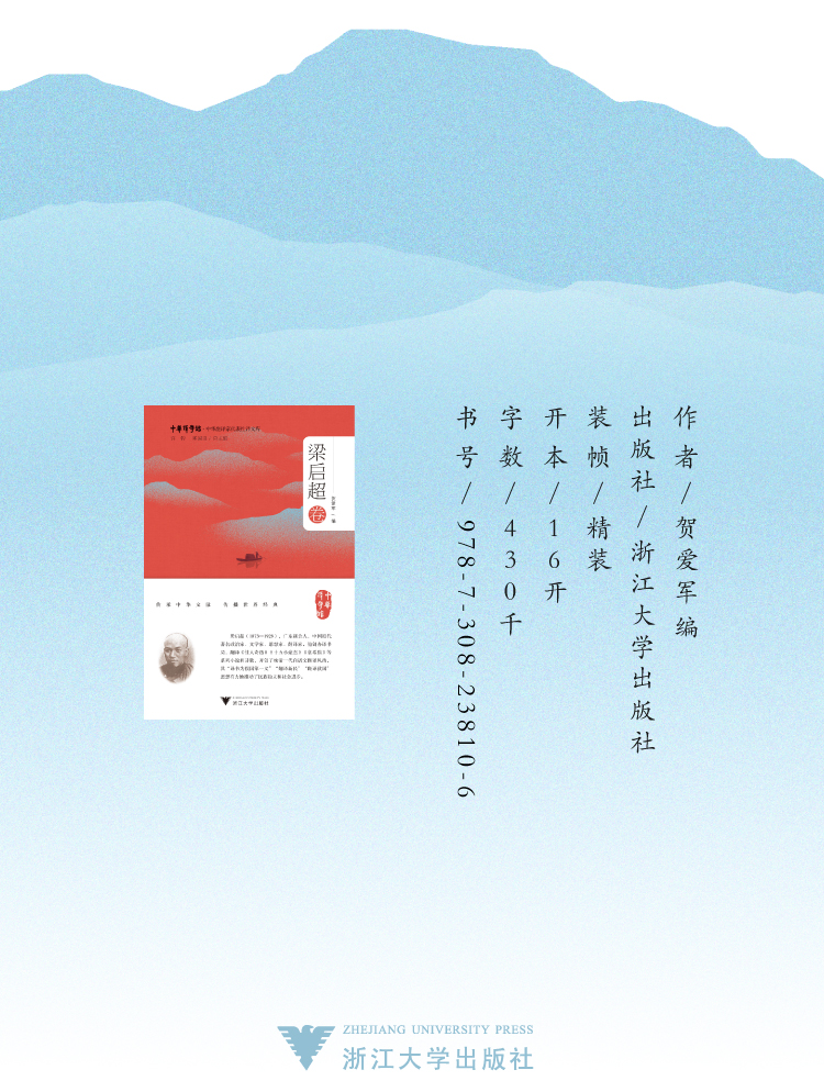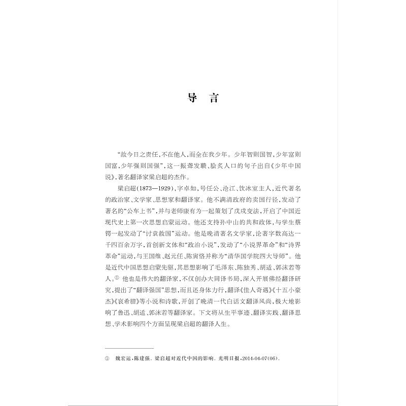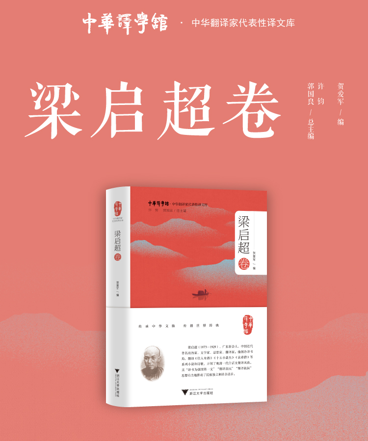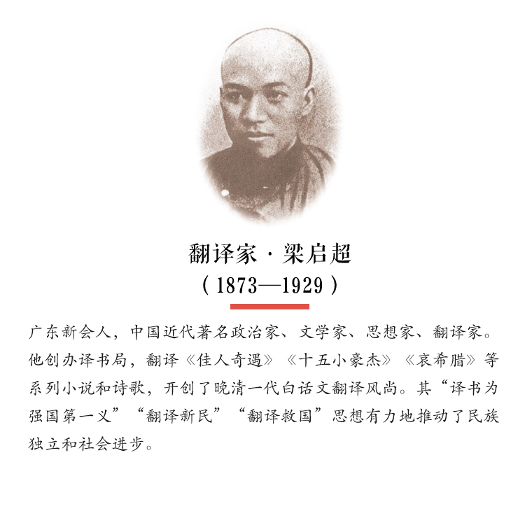 翻译家梁启超(1873—1929),广东新会人,中国近代著名政治家、文学家、思想家、翻译家。他创办译书局,翻译《佳人奇遇》《十五小豪杰》《哀希腊》等系列小说和诗歌,开创了晚清一代白话文翻译风尚。其“译书为强国第一义”“翻译新民”“翻译救国”思想有力地推动了民族独立和社会进步。