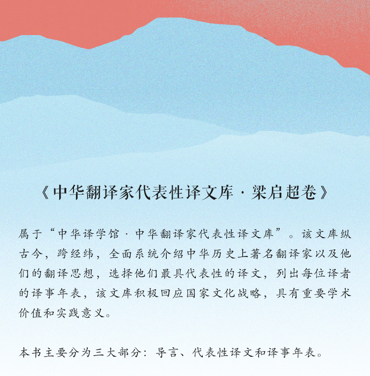 《中华翻译家代表性译文库·梁启超卷》属于“中华译学馆·中华翻译家代表性译文库”。该文库纵古今,跨经纬,全面系统介绍中华历史上著名翻译家以及他们的翻译思想,选择他们最具代表性的译文,列出每位译者的译事年表,该文库积极回应国家文化战略,具有重要学术价值和实践意义。本书主要分为三大部分:导言、代表性译文和译事年表。导言包括梁启超生平介绍、翻译思想、对梁启超的研究、代表性译文选择的原因、对所选译文的介绍与研究,以及编选说明等。第二部分为梁启超代表性译文。第三部分为梁启超译事年表,把梁启超所有的翻译实践活动按时间顺序排列,包括年代与发表渠道。