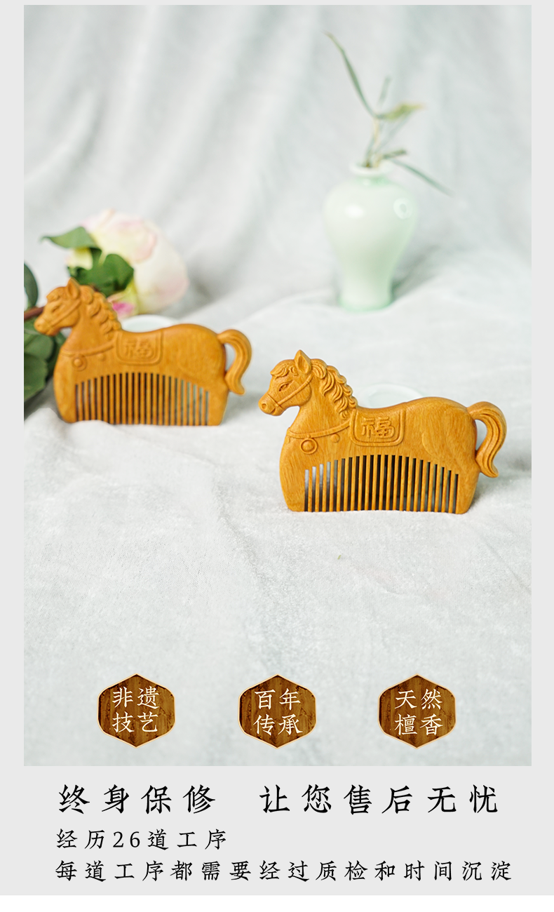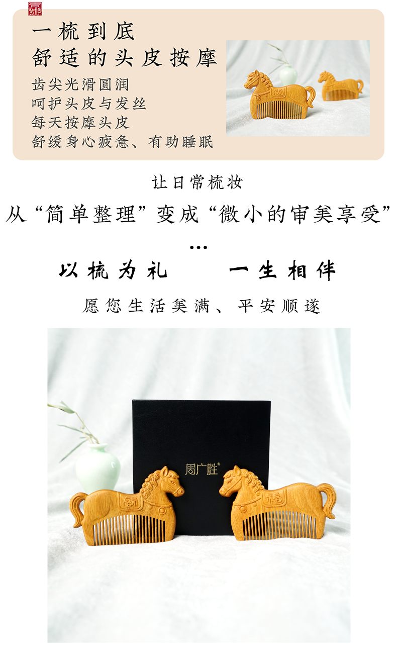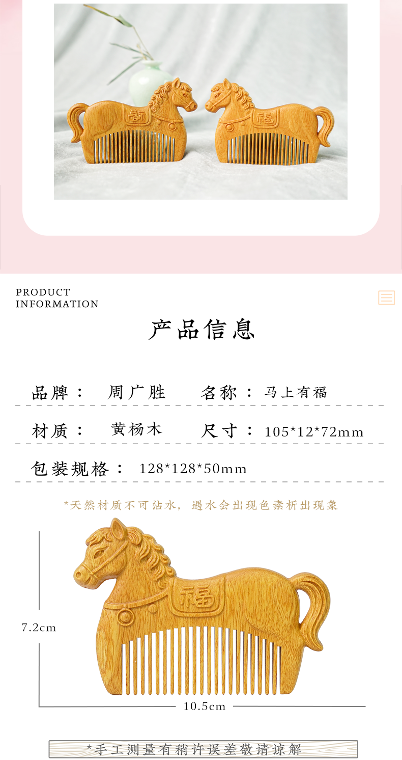 周广胜马年限定黄杨木雕刻马上有福便携实木梳子男女通用创意礼品