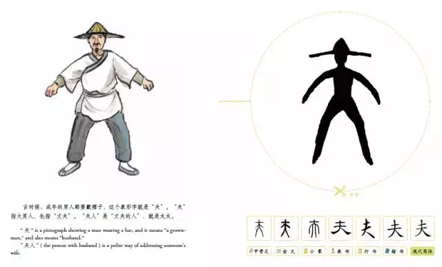 比如, “夫”字,图画是一个戴着帽子的男人,而下面的文字是: