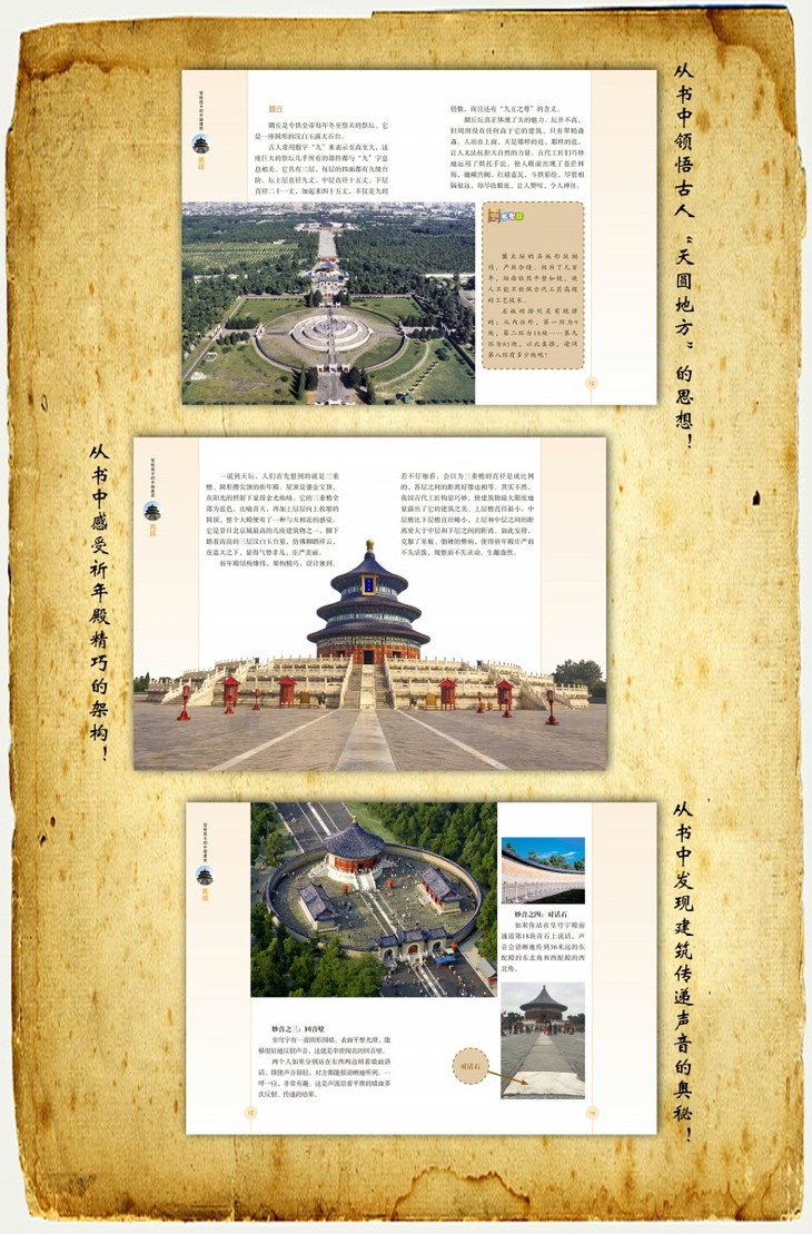 从天坛的历史轨迹开始了它的观光之旅,以“一道线、三道墙、五组房子、七座峰、九扇门”勾勒出了天坛的轮廓,用铜人亭、望柱、排水、三足鼎炉、殿前丹陛等装饰了天坛的细节,将世界上最大的祭天建筑群天坛尽善尽美、亦庄亦谐地展示出来,将处处体现的文化内涵和古人的建筑智慧书写出来。
