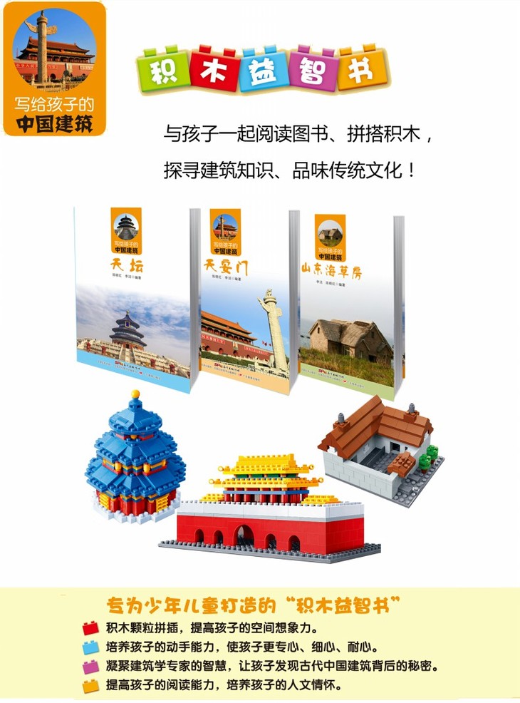 《写给孩子的中国建筑》系列丛书将积木和书结合,产生多重作用,对孩子们的身心发展都颇有益处。积木颗粒拼插,提高孩子的空间想象力; 培养孩子的动手能力,使孩子更专心、细心、耐心;凝聚建筑学专家的智慧,让孩子发现古代中国建筑背后的秘密;提高孩子的阅读能力,培养孩子的人文情怀。