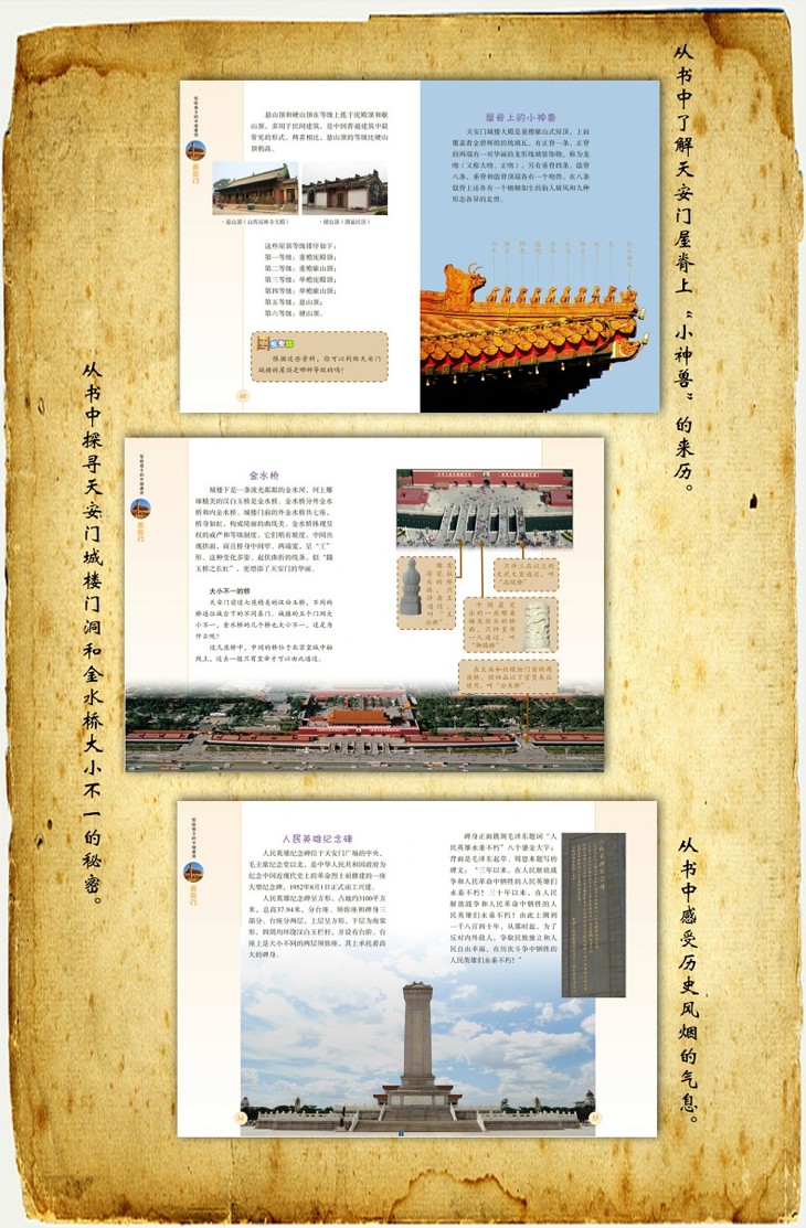 从天安门的历史轨迹开始,到天安门的组成——城楼、金水桥、华表、石狮等,再到天安门的建筑装饰——屋顶、小神兽、彩画、梁枋等,最后到其周边的广场建筑群——人民英雄纪念碑、毛主席纪念堂、人民大会堂和国家博物馆等,较为系统、全面又不失趣味地介绍了我国古代城楼中最杰出的代表作——天安门。