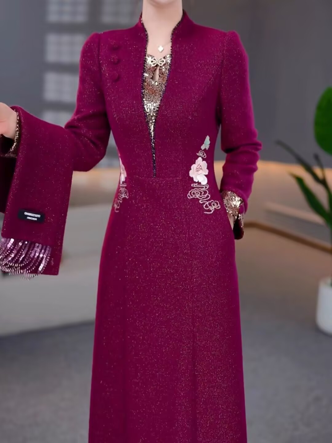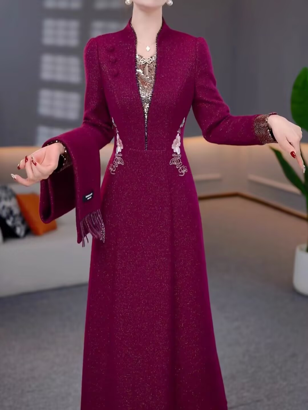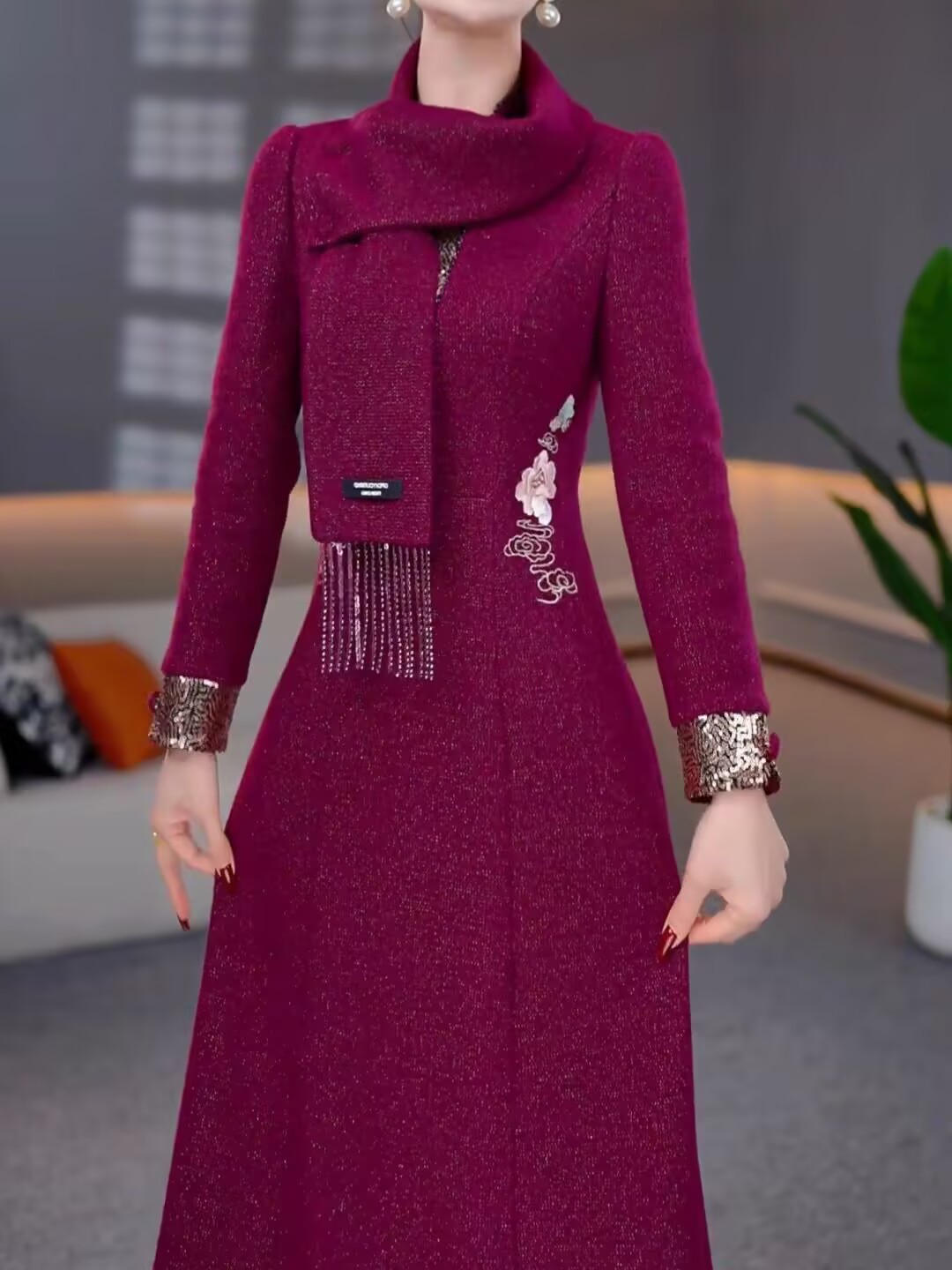 新中式刺绣连衣裙围巾款2025秋冬季女士长袖中长款时尚裙子