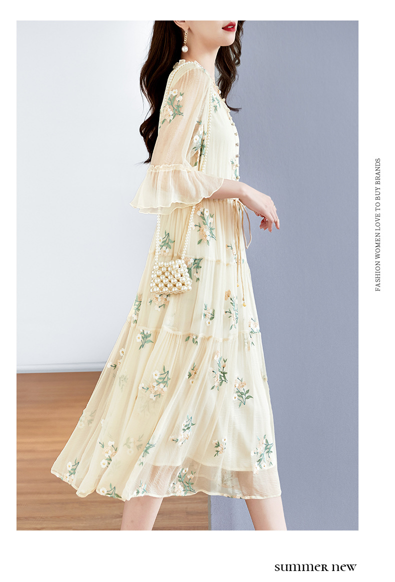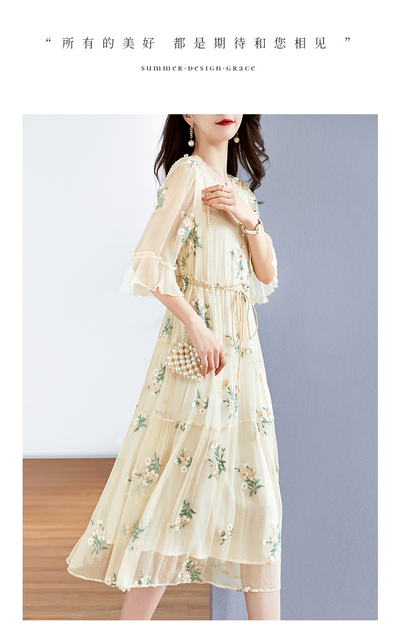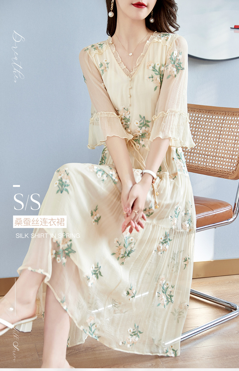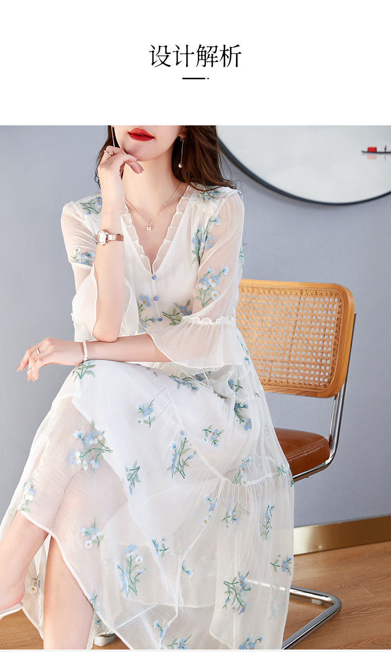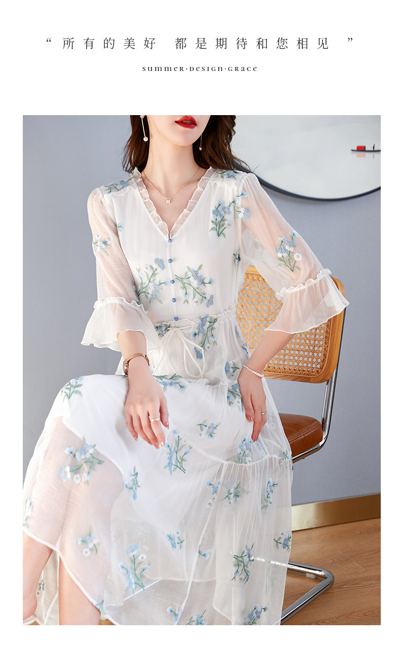 TC82399875 真丝连衣裙女重工刺绣2024新款度假V领收腰桑蚕丝中长款沙滩裙子