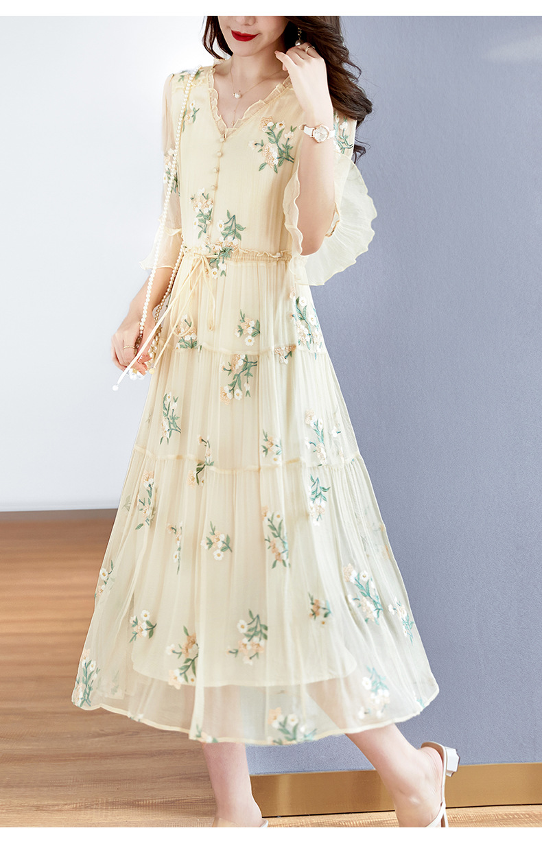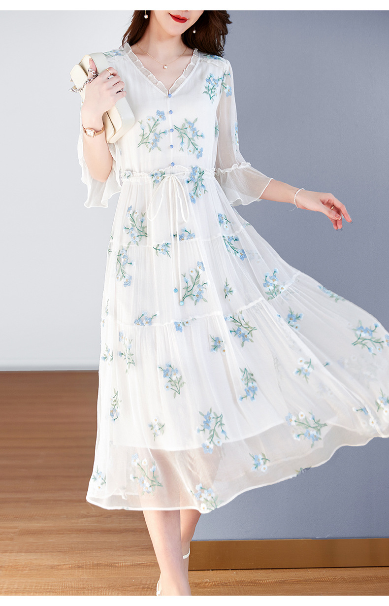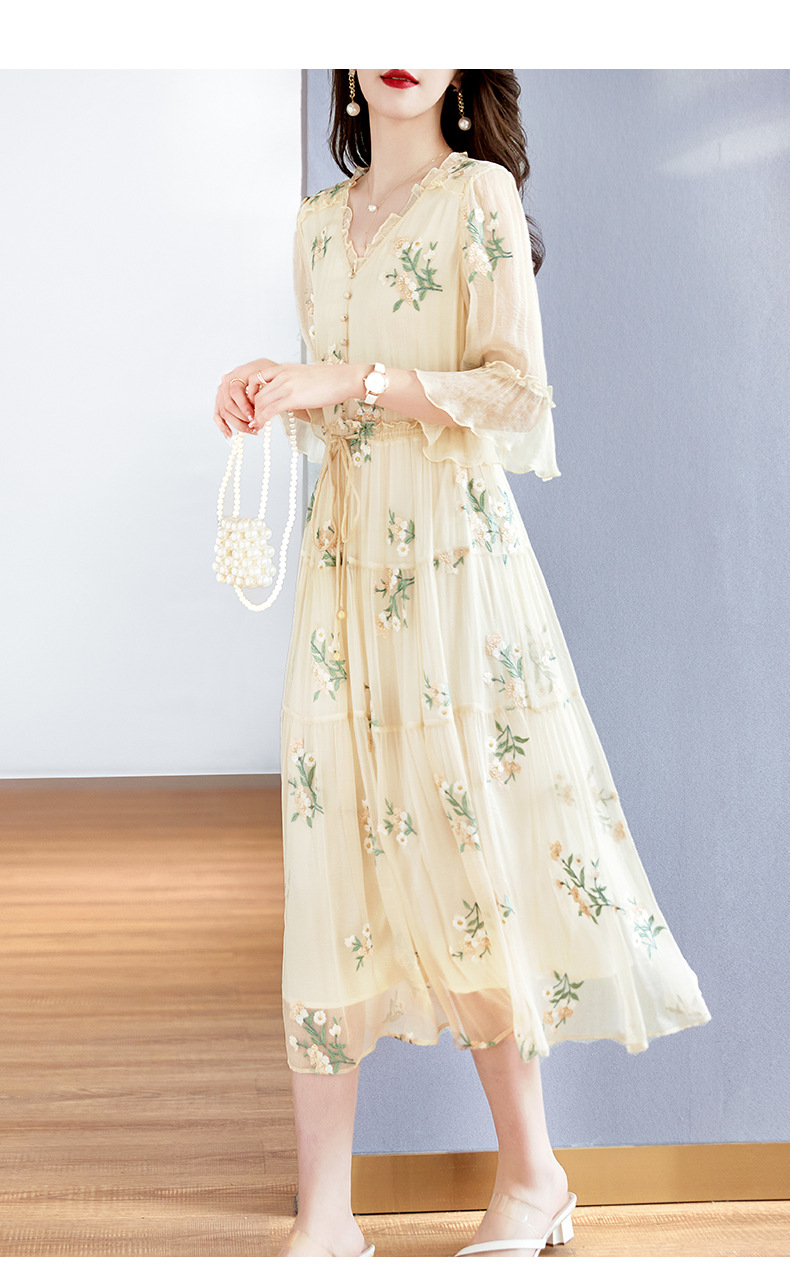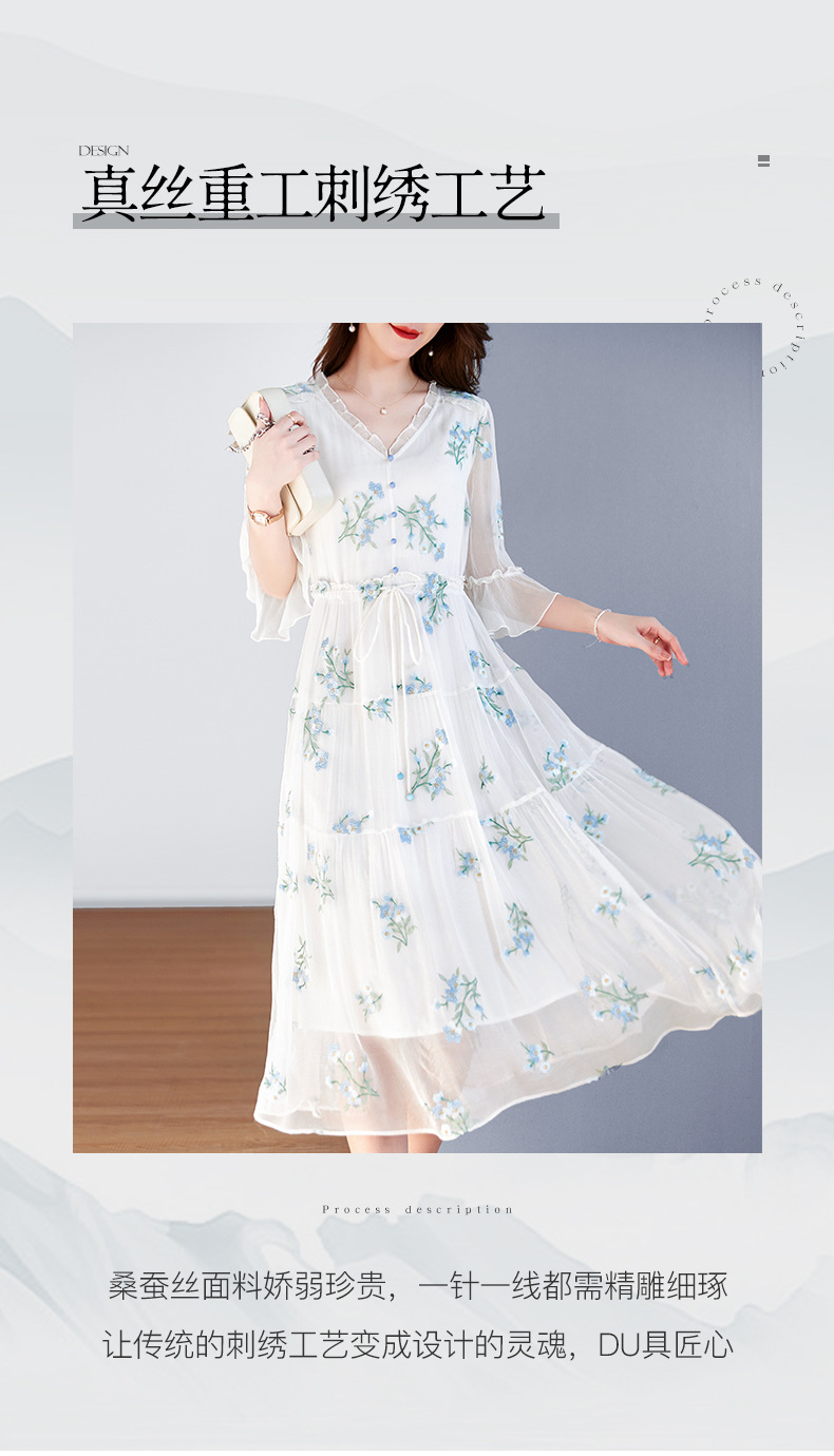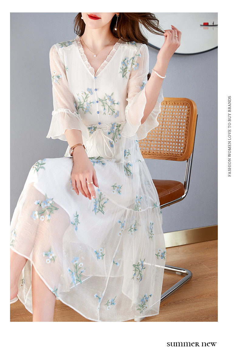 TC82399875 真丝连衣裙女重工刺绣2024新款度假V领收腰桑蚕丝中长款沙滩裙子