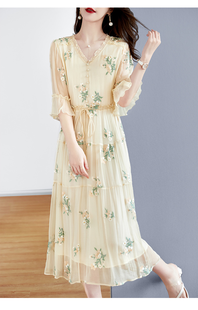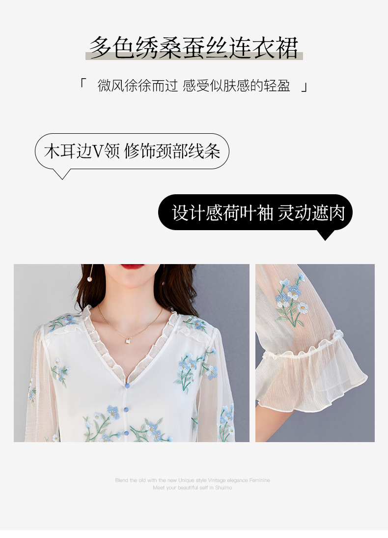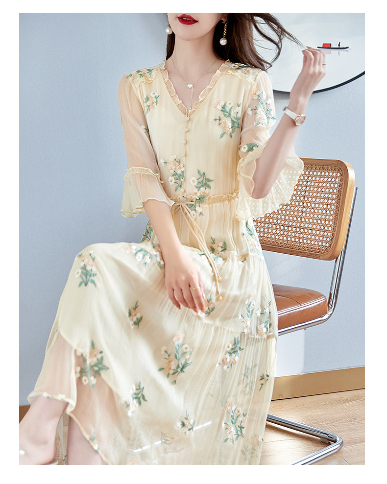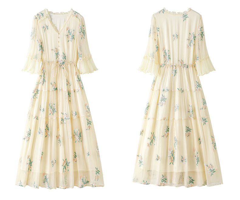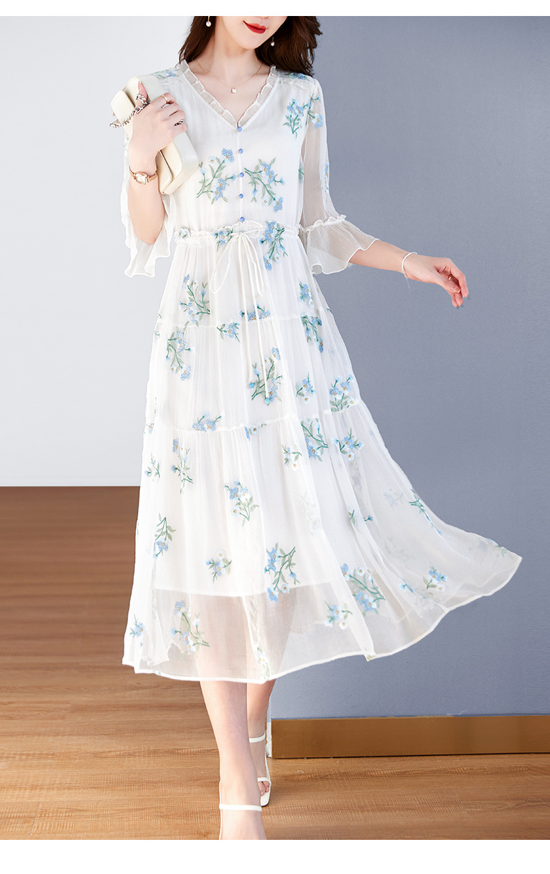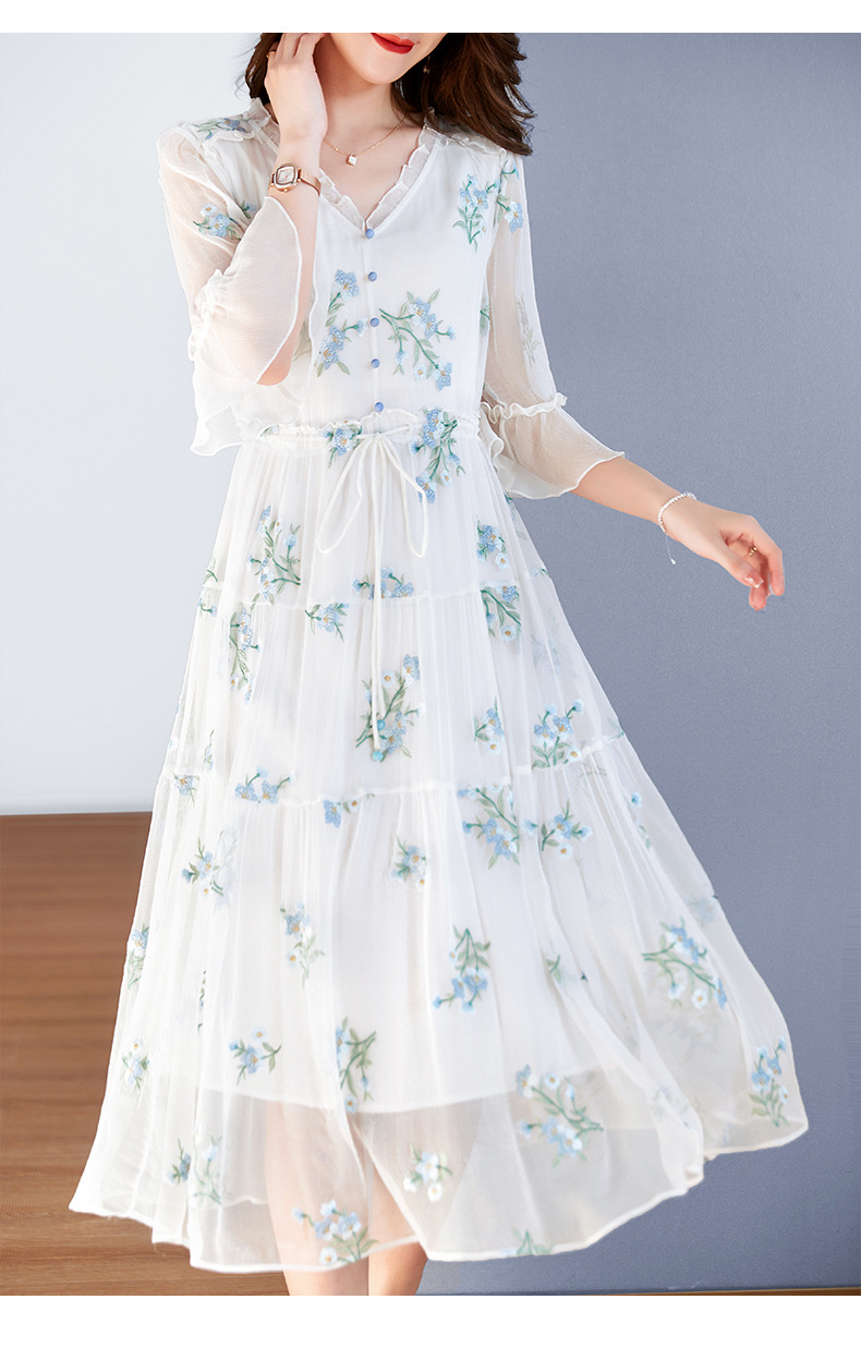 TC82399875 真丝连衣裙女重工刺绣2024新款度假V领收腰桑蚕丝中长款沙滩裙子