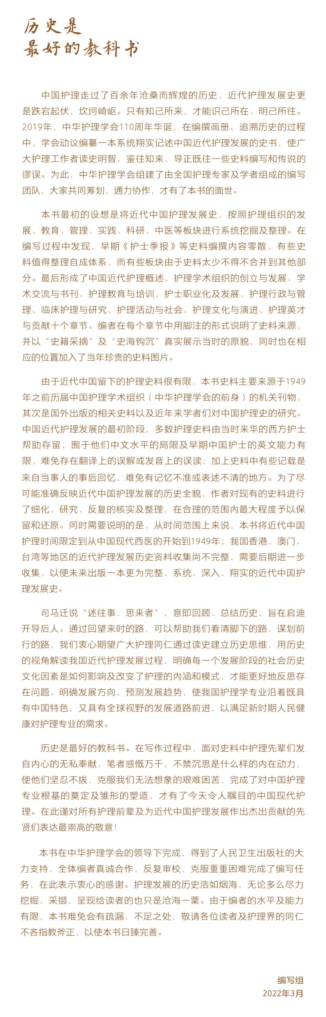 期望广大护理人通过阅读本书建立历史思维,用历史的视角解读我国近代护理发展过程,明确每一个发展阶段的社会、历史、文化因素是如何影响及改变了护理的内涵和模式,帮助中国护理人回望来时路,看清脚下路,坚定前行路,从历史中汲取力量,使我国护理学专业沿着既具有中国特色,又具有全球视野的发展道路前进,以满足新时期人民健康对护理专业的需求。