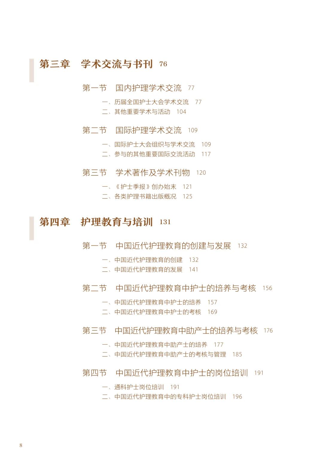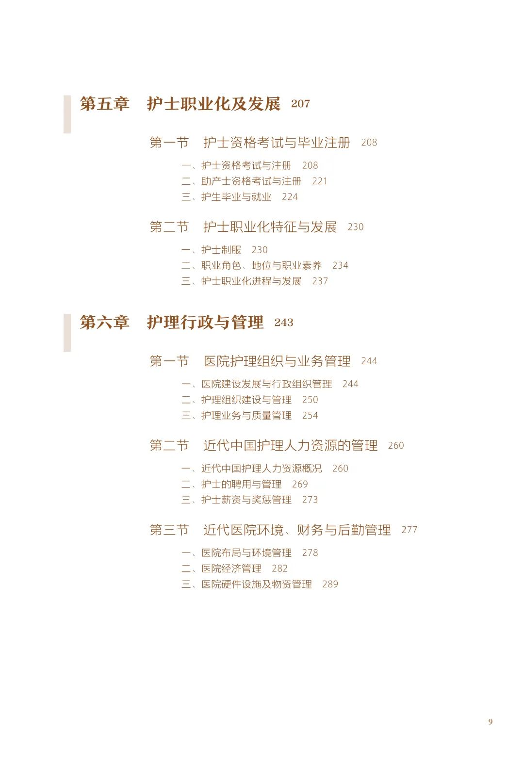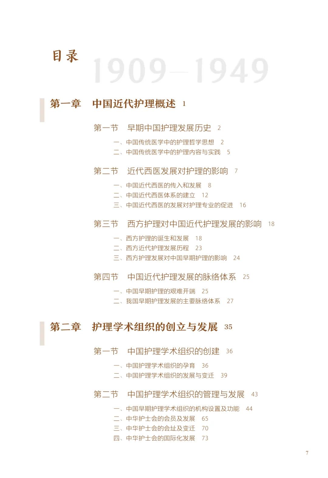 《中国护理发展史(1909—1949)》以护理学科范畴为基础,形成了概述、护理学术组织的创立与发展、学术交流与书刊、护理教育与培训、护士职业化及发展、护理行政与管理、临床护理与研究、护理活动与社会、护理文化与演进、护理英才与贡献十个章节。编者在每个章节中用脚注的形式说明了史料来源,并以“史籍采摘”的方式真实记载了时代的原貌,同时也展示了当年珍贵的史料图片。