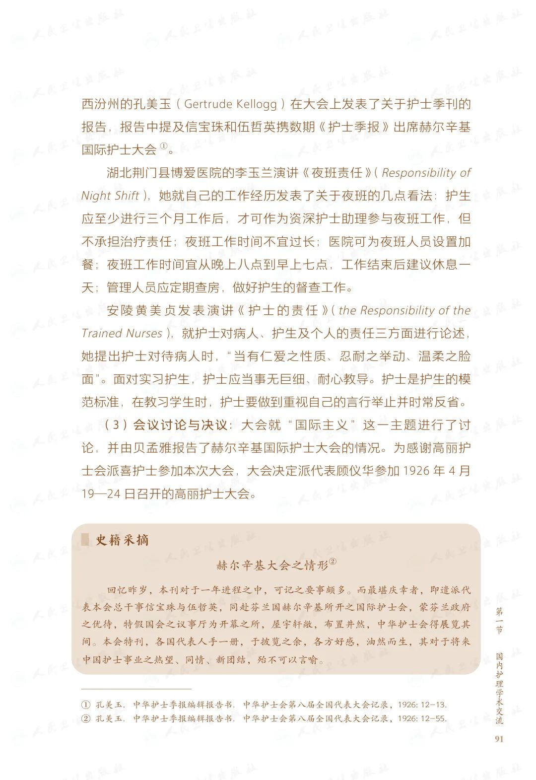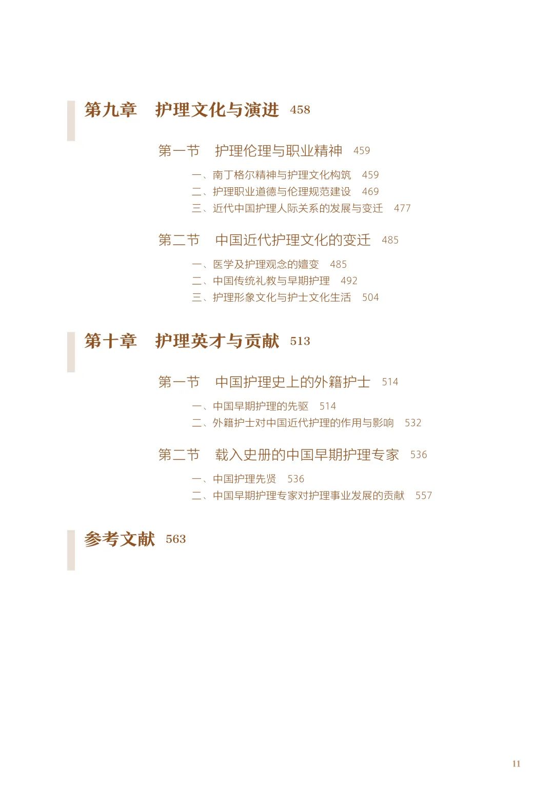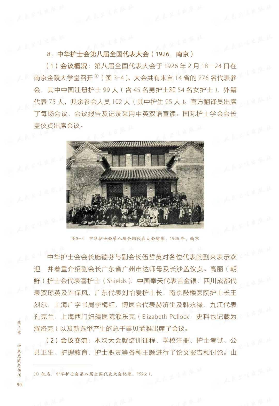 《中国护理发展史(1909—1949)》以护理学科范畴为基础,形成了概述、护理学术组织的创立与发展、学术交流与书刊、护理教育与培训、护士职业化及发展、护理行政与管理、临床护理与研究、护理活动与社会、护理文化与演进、护理英才与贡献十个章节。编者在每个章节中用脚注的形式说明了史料来源,并以“史籍采摘”的方式真实记载了时代的原貌,同时也展示了当年珍贵的史料图片。