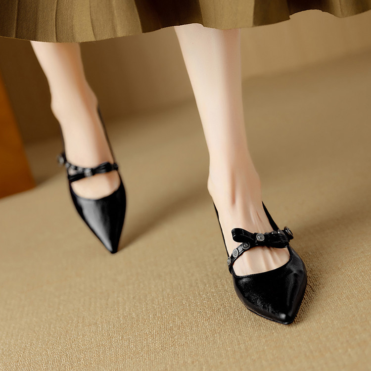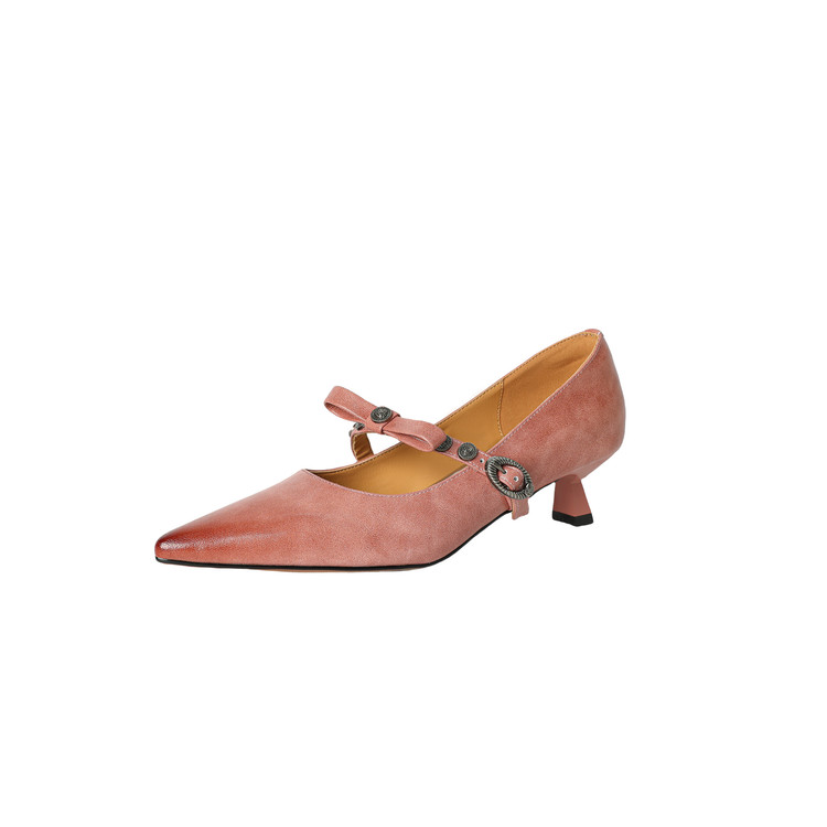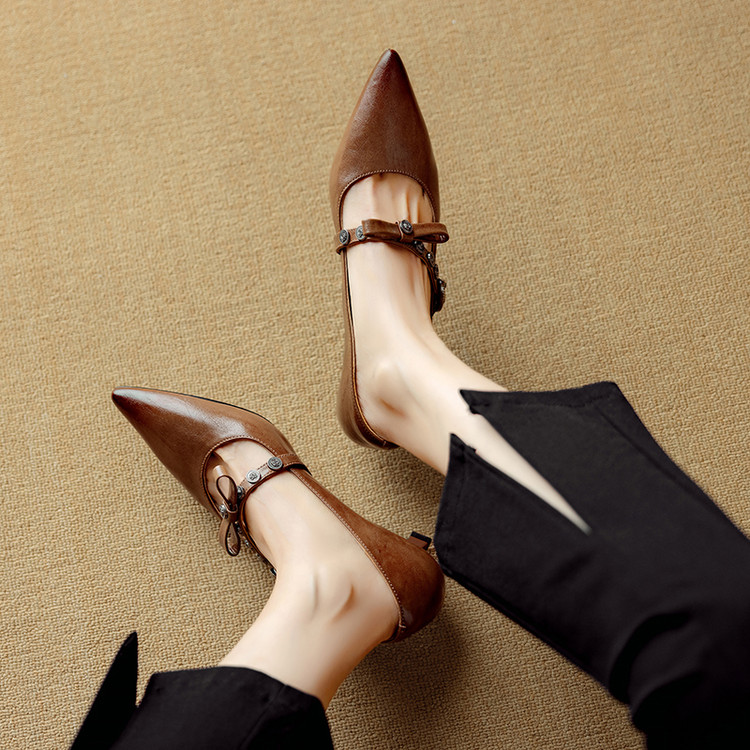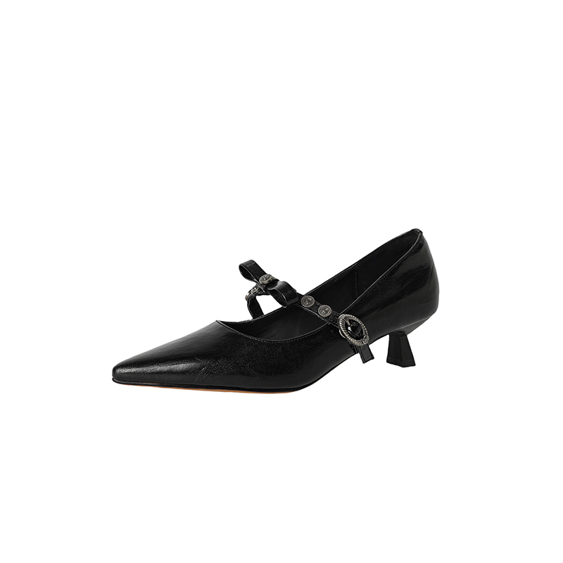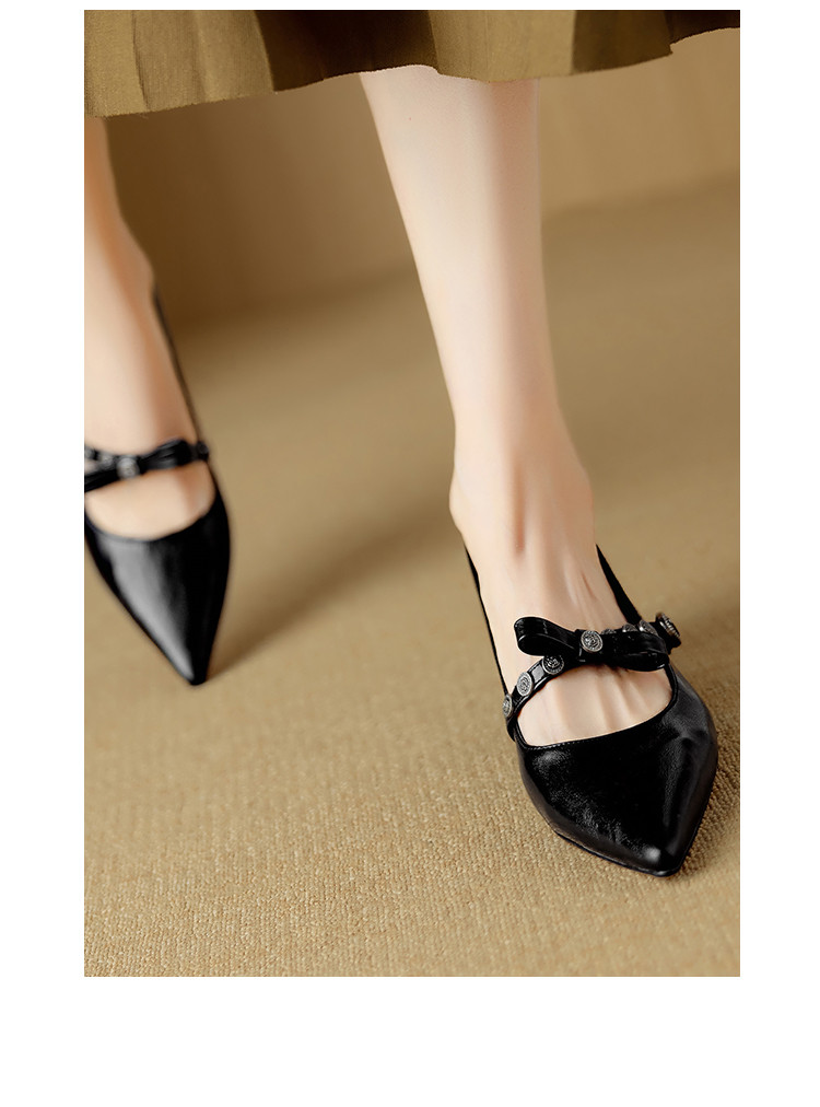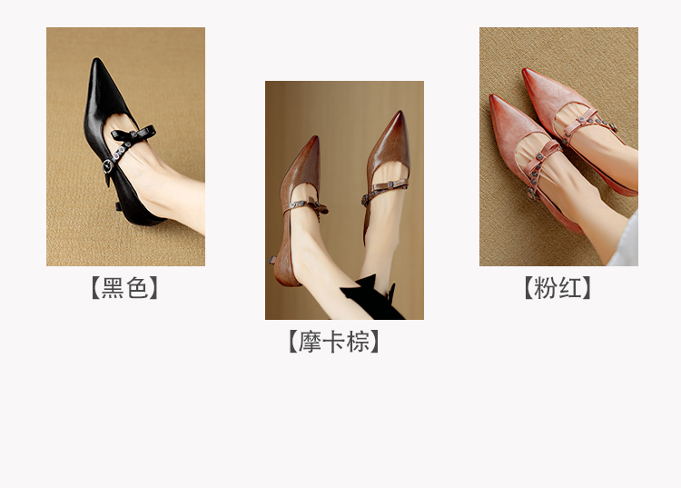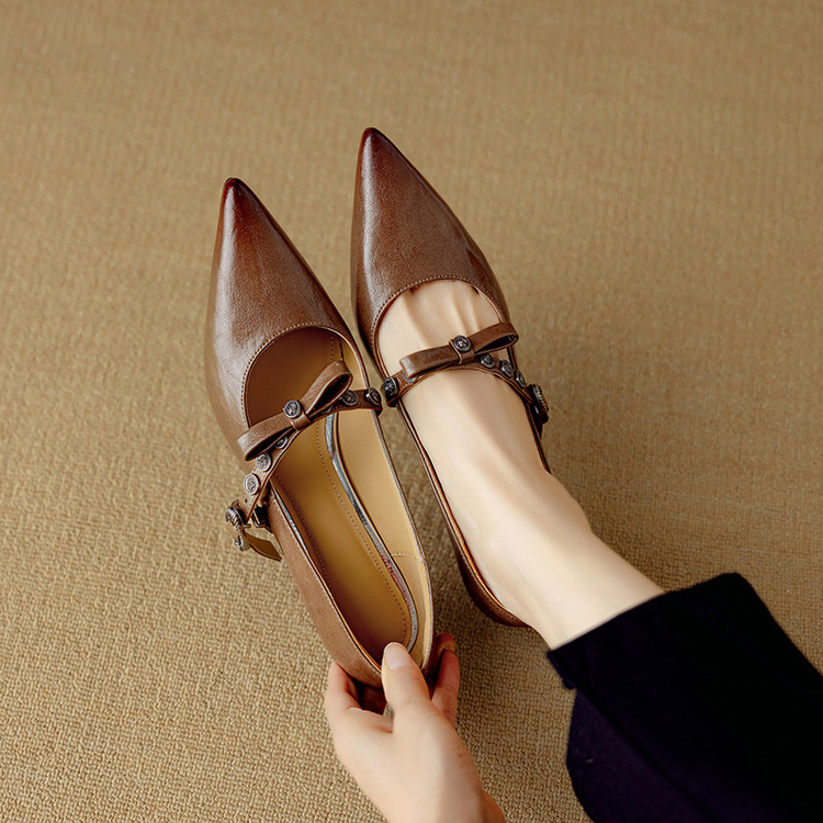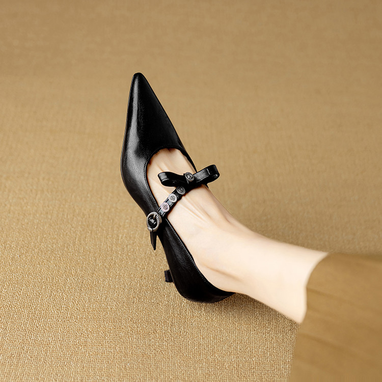 【预售5天】真皮气质尖头蝴蝶结高跟鞋粗跟法式玛丽珍鞋浅口单鞋女DB&M6208
