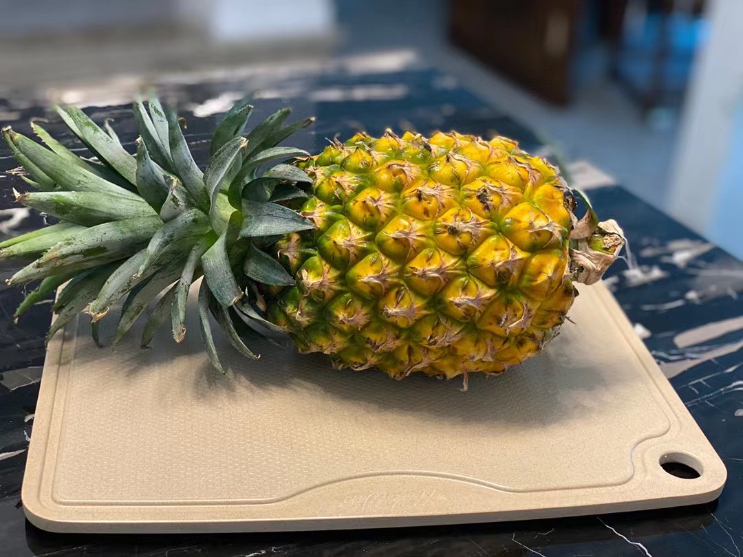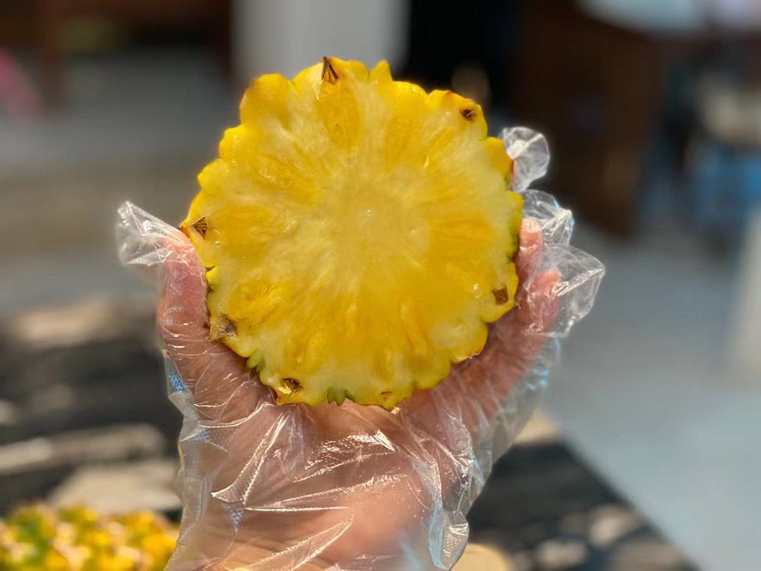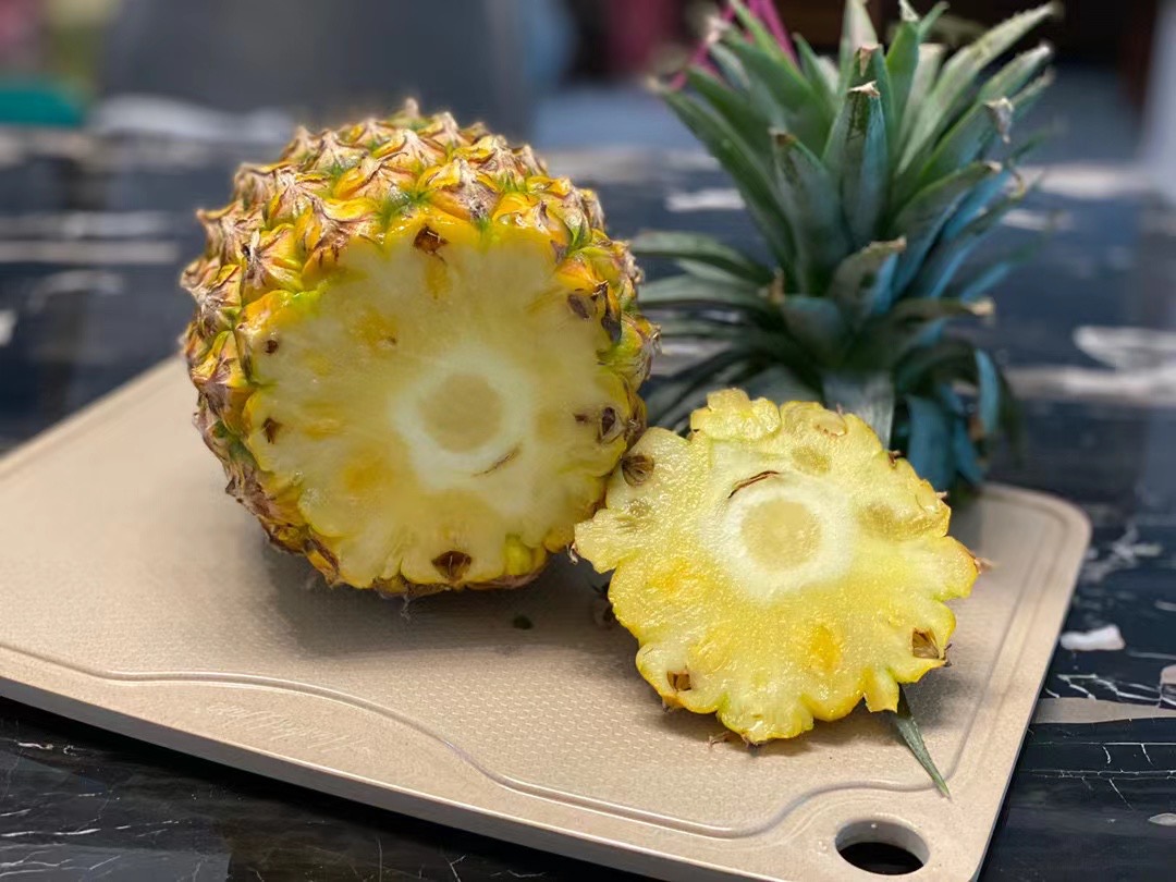 切开那薄薄的果皮,露出金黄色的果肉,空气中弥漫着凤梨醉人的清香味,充盈的汁水顺着果肉的切面流淌。