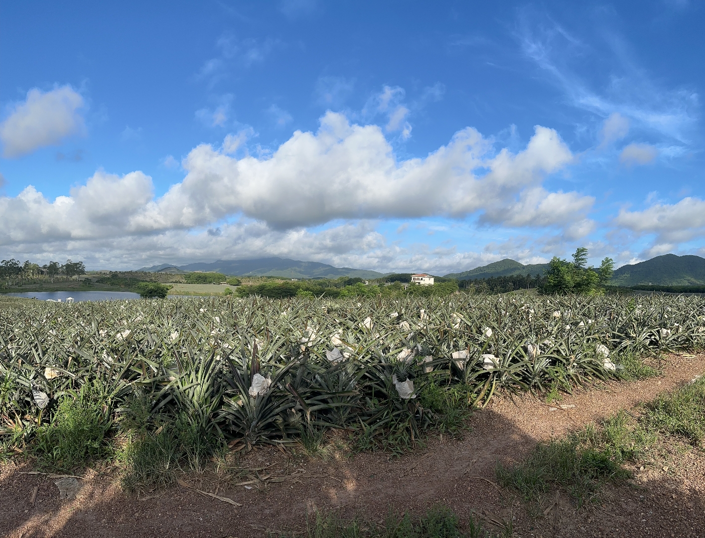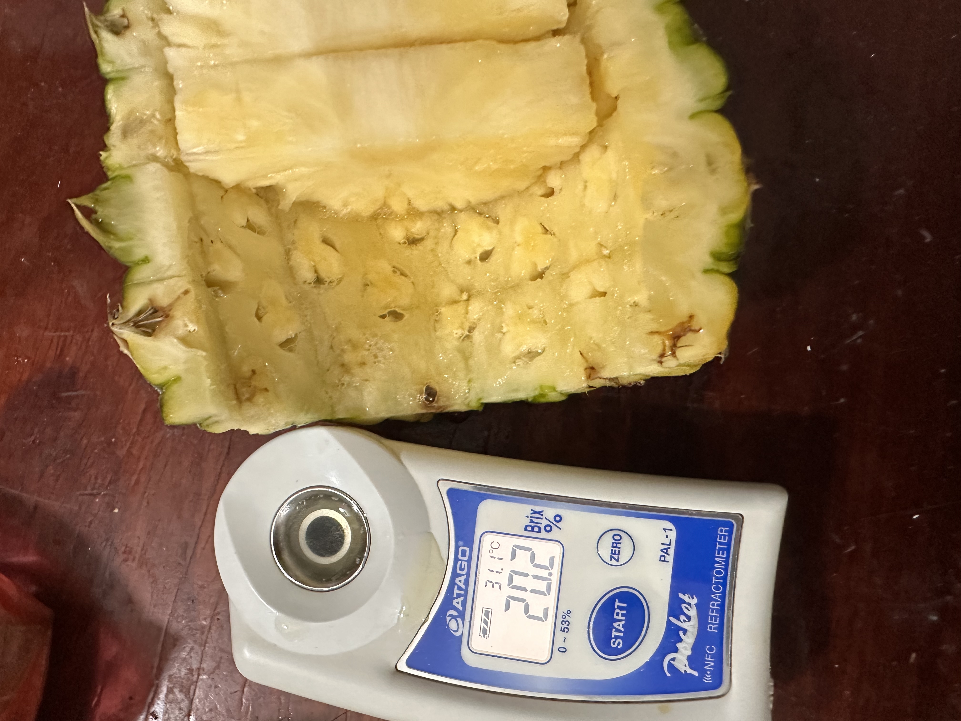 【关于产品】植株高, 叶长直立, 叶尖及基部常见零星小刺, 叶面草绿色但中轴呈紫红色; 果实略呈圆锥形, 平均单果重1.2 kg, 果目略突, 果肉金黄色, 纤维稍粗, 糖度15.7°BR, 酸度比约0.27 %,糖酸比58, 风味浓郁。产季为6 月下旬至7月中旬, 最佳生长期为8月至翌年2月。