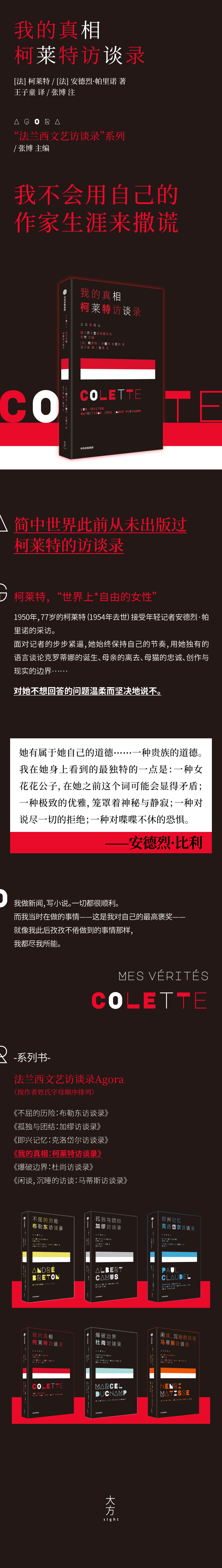 访谈内容跨越柯莱特的整个创作生涯,呈现出一个和她的作品一样——“其光芒不被任何文学批评的解释所束缚”——不被任何阐释和误解束缚的柯莱特。