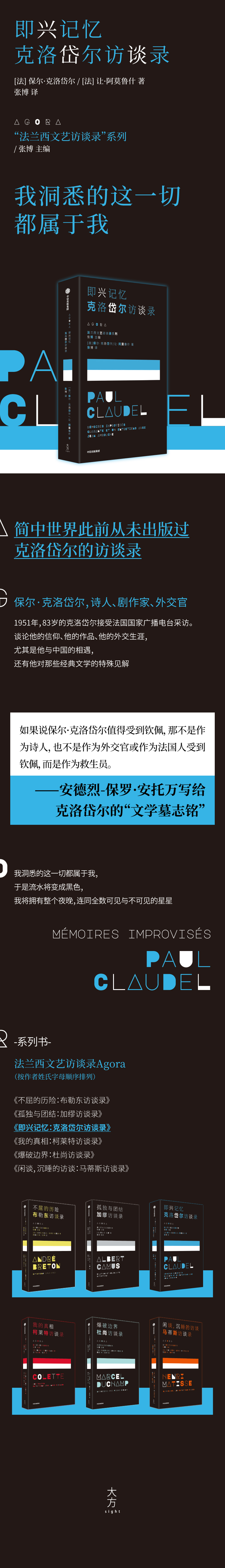《即兴记忆——克洛岱尔访谈录》保尔·克洛岱尔,法国象征主义后期诗人、剧作家,外交官,法兰西学院院士。作为诗人,保尔·克洛岱尔在法国诗坛举足轻重;作为剧作家,他的戏剧作品独树一帜;作为外交官,他曾在中国工作过十四年之久。克洛岱尔身上混合着复杂的多重身份令他的人生与艺术变得更加丰富多彩。