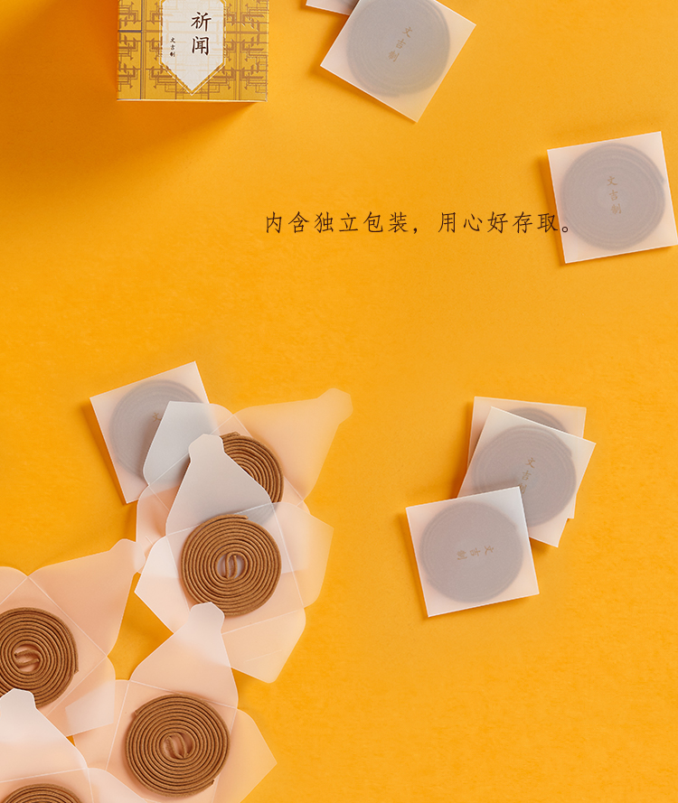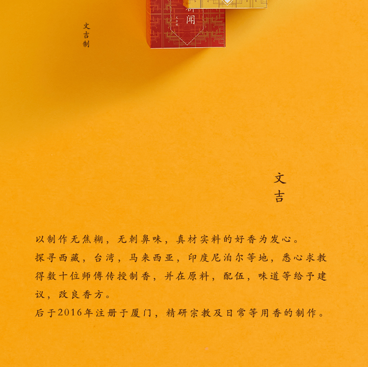 初有发心,以香为业;遂遍访诸地,觅学香方,得师授业,日日精学不辍,有所得;后,于闽地始作“文吉”。