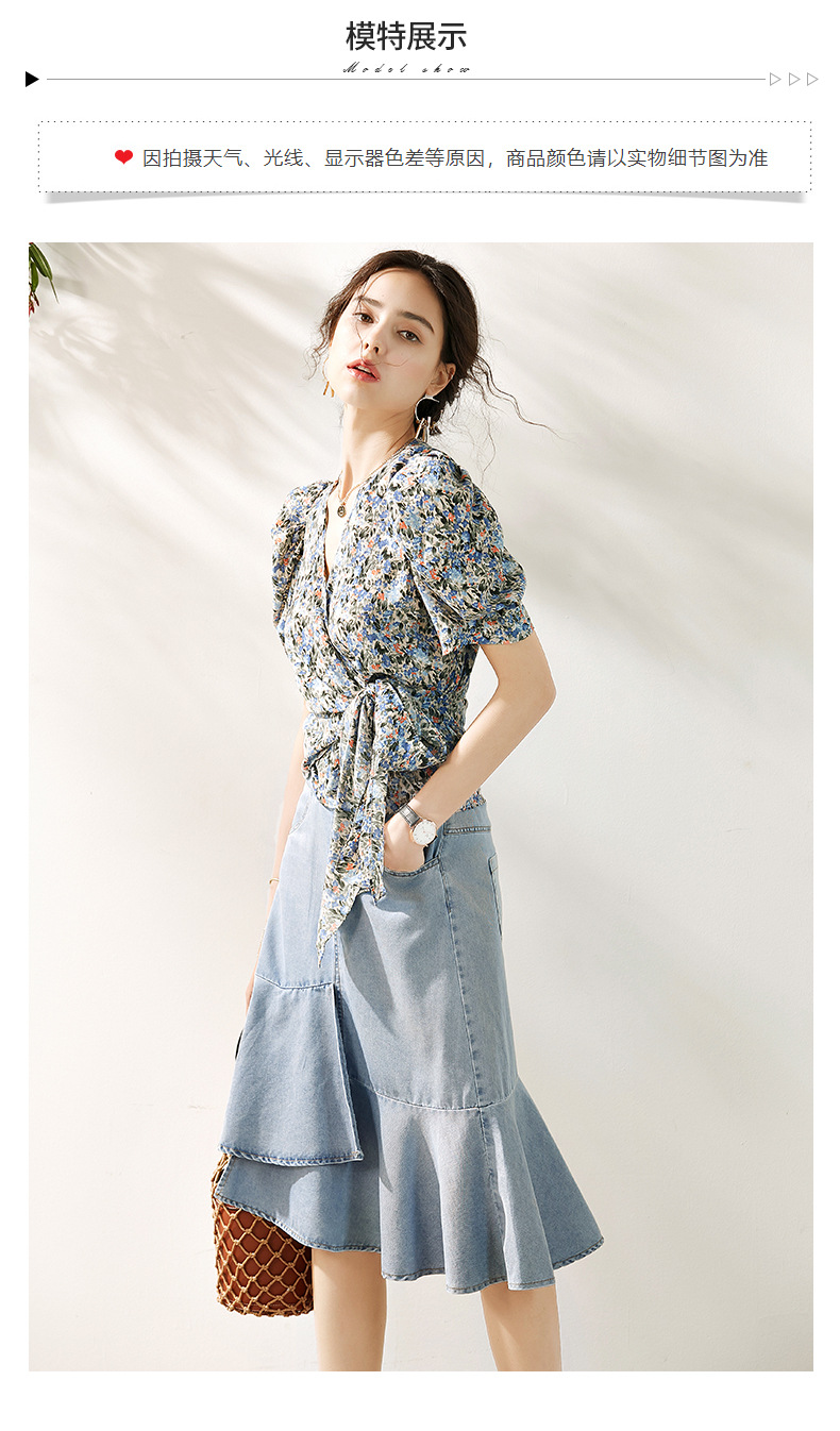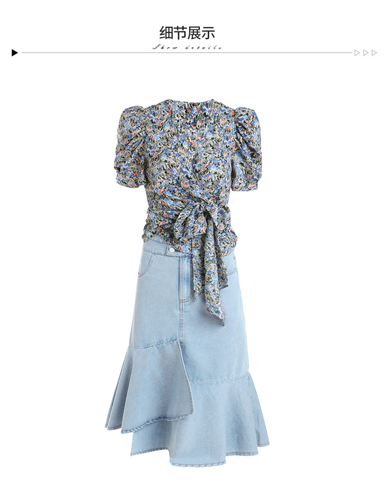 WLZD-2005204法式小众复古碎花绑带上衣+牛仔半身裙两件套装