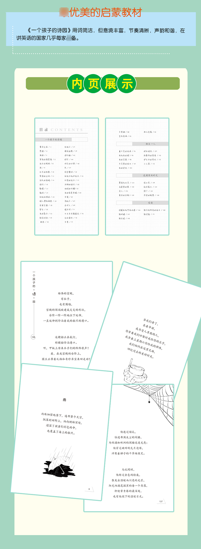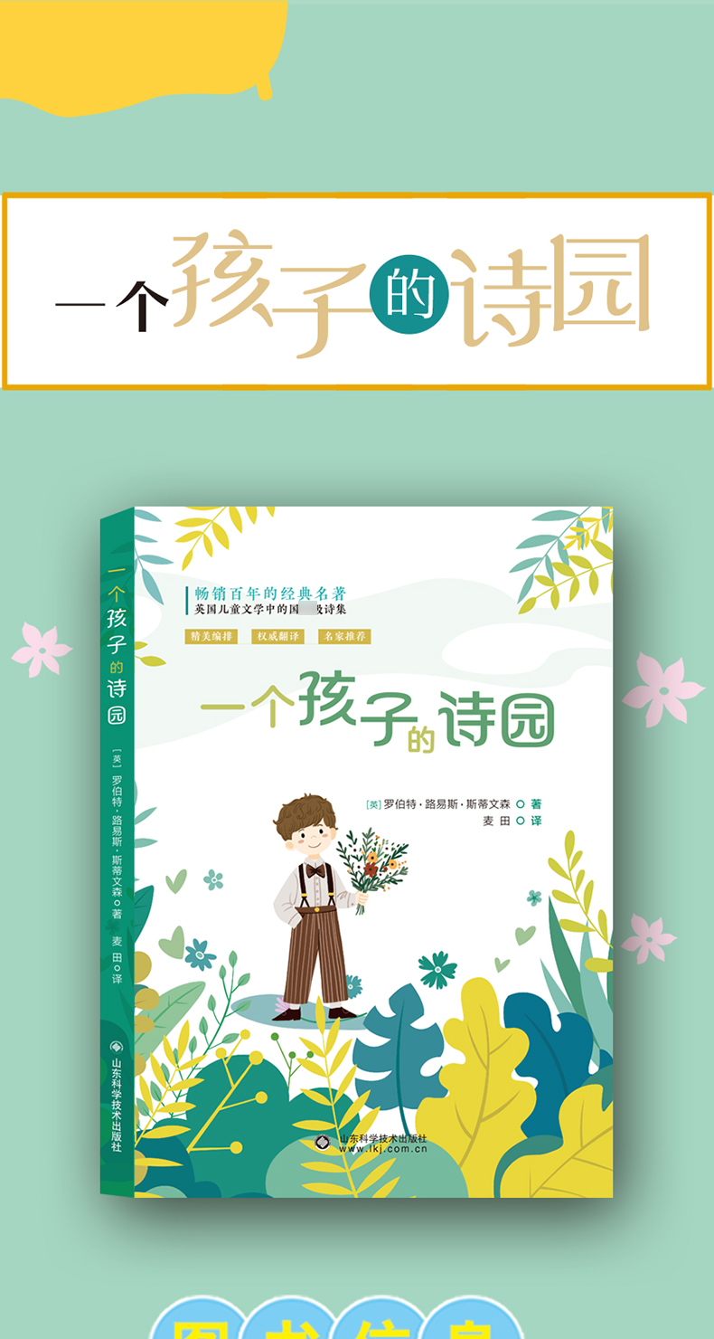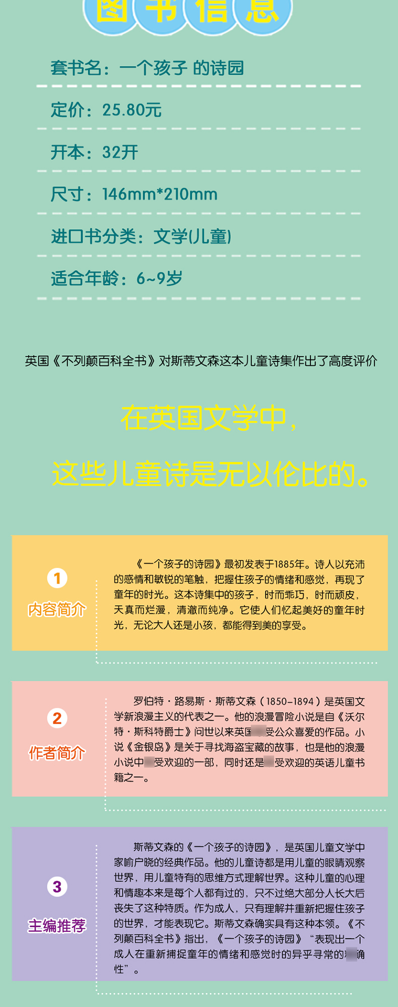 《一个孩子的诗园》最初发表于1885年。诗人以充沛的感情和敏锐的笔触,把握住孩子的情绪和感觉,再现了童年的时光。这本诗集中的孩子,时而乖巧,时而顽皮,天真而烂漫,清澈而纯净。它使人们忆起美好的童年时光,无论大人还是小孩,都能得到美的享受。