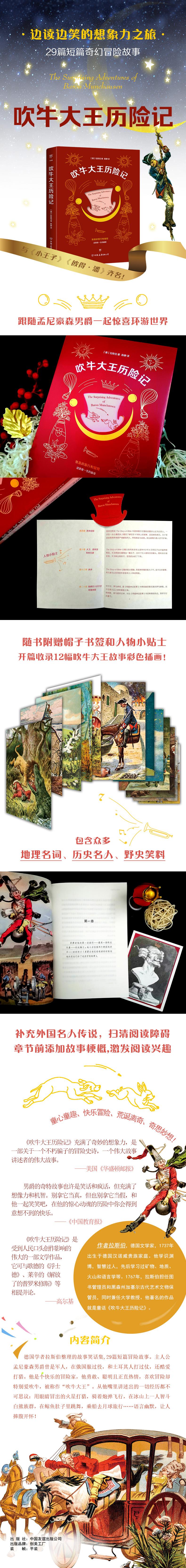 1.精美彩图典藏版,天马行空的德国百年经典,爱说大话的神秘男爵,妙趣横生的历险故事!边读边笑,来一场想象力之旅! 2.德文原版直译!与《小王子》《彼得·潘》齐名的奇趣故事! 3.高级超感封面纸,镂空烫彩金工艺,内文典雅白云双胶纸,彩色插图,装帧精美,是您书架上的颜值担当! 4.开篇收录12张精美插图,提升阅读乐趣! 5.随书附赠封面同款帽子书签和“人物小贴士”折页,补充外国名人传说,扫清阅读障碍! 6.29篇短篇冒险故事,包含众多地理名词、历史名人、野史笑料,跟随孟尼豪森男爵一起惊喜环游世界。 7.章节前添加故事梗概,层次分明,引人入胜!更好的激发阅读兴趣! 8.童心童趣、快乐冒险、荒诞离奇、奇思妙想!我喜欢旅行和冒险,这是我一生的最爱! 9.一个冒险家的幻想传奇,满怀童心的传世杰作;19世纪儿童文学的瑰宝,讽刺文学的不朽丰碑! 10.《吹牛大王历险记》充满了奇妙的想象力,是一部关于一个不朽骗子的冒险史诗,一个伟大故事讲述者的伟大故事。 ——美国《华盛顿邮报》 11.男爵的奇特故事也许是笑话和疯话,但充满了想像力和机智。别拿它当真,但也别拿它当假,和他一起笑笑吧,在他的惊心动魂的历险中你会得到意想不到的快乐。 ——《中国教育报》 12.《吹牛大王历险记》是受到人民口头创作影响的伟大的一部文学作品,它可与歌德的《浮士德》、莱辛的《解放了的普罗米修斯》等相提并论。 ——高尔基