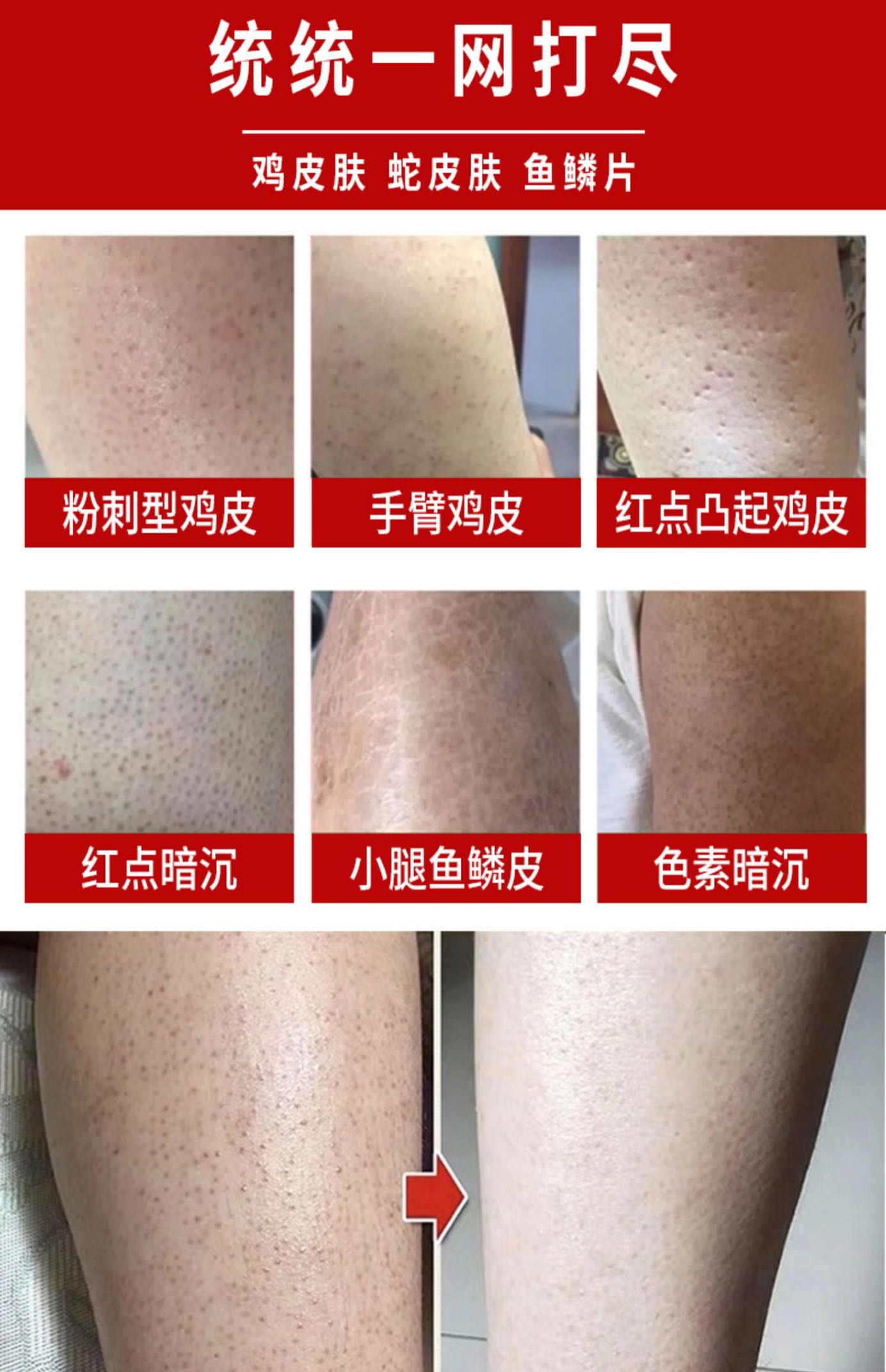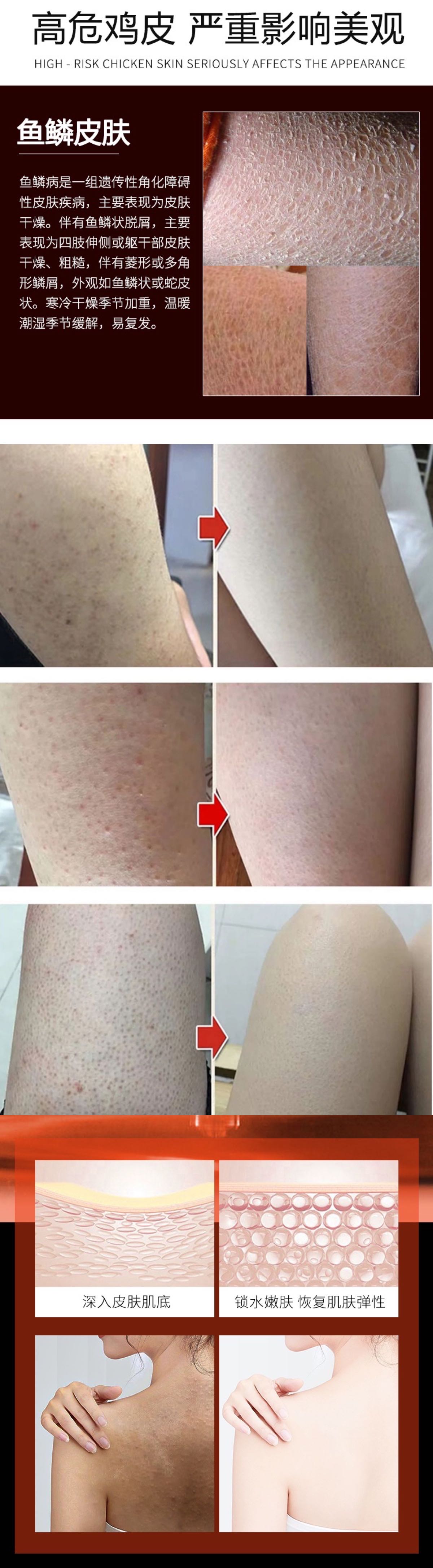 3、渗透皮肤层软化角质,改善因干燥毛孔堵塞引起的各类鱼鳞皮肤,蛇皮肤和鸡皮肤。