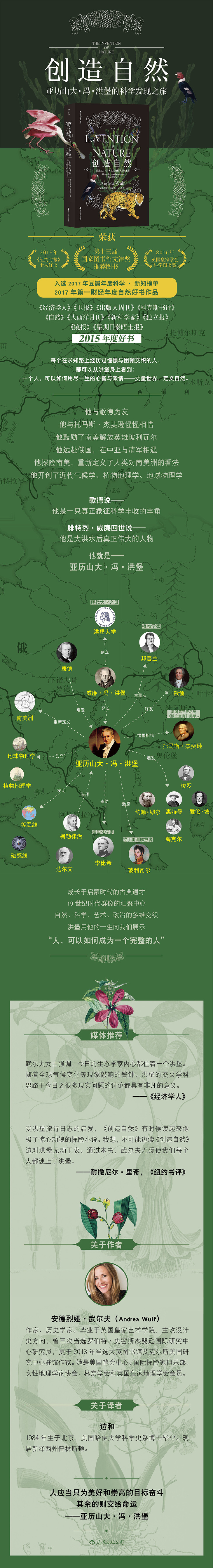 安德里娅·武尔夫著作丰富,成绩斐然,常见于《纽约时报》畅销榜单。她的《园艺兄弟》(Brother Gardeners)曾入选2008年萨缪尔·约翰逊奖长名单,并于2010年荣获美国园艺学会年度图书奖。从伦敦的英国皇家学会到美国的纽约公共图书馆,武尔夫的演讲足迹遍布世界各地,她积极投身地理学与植物探索历史的公共普及教育,并于2016年荣获英国皇家地理学会颁发的内斯奖章。
