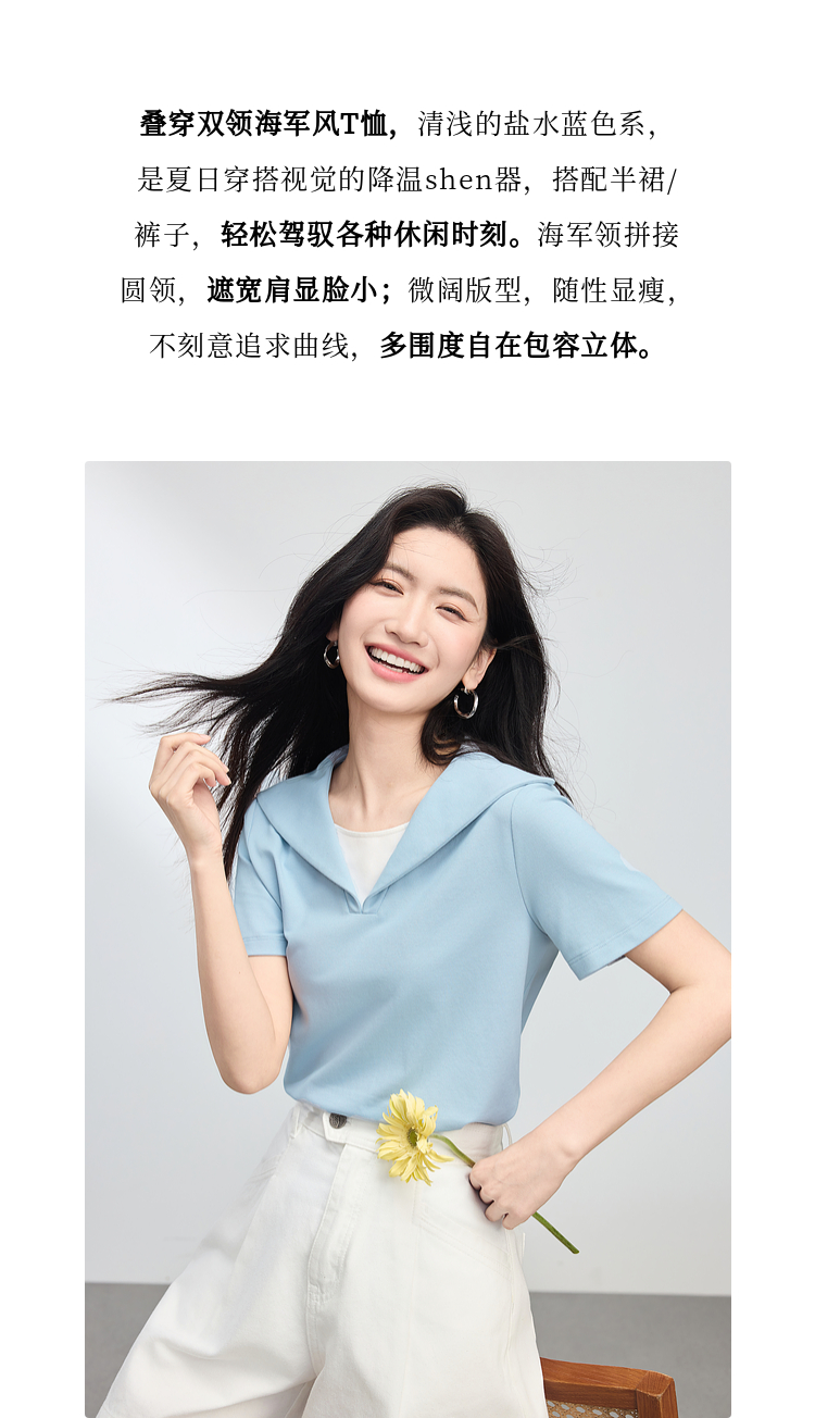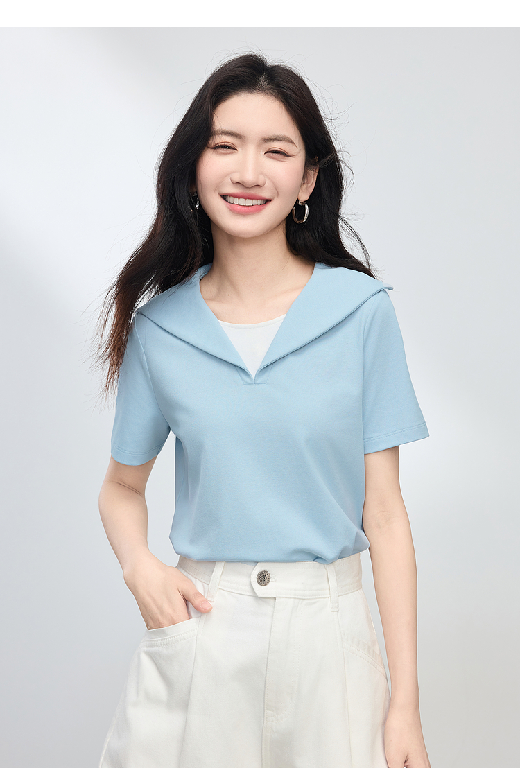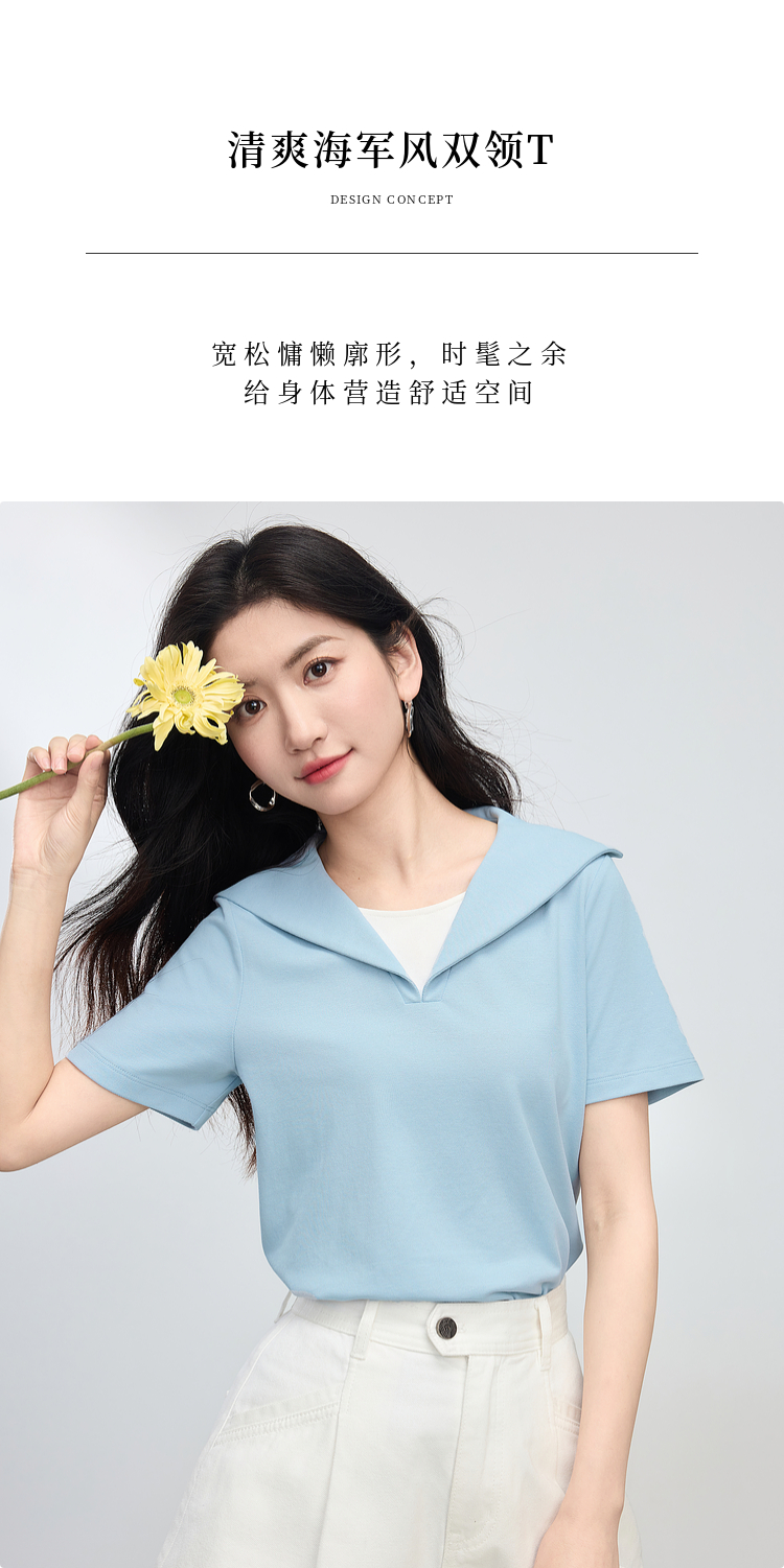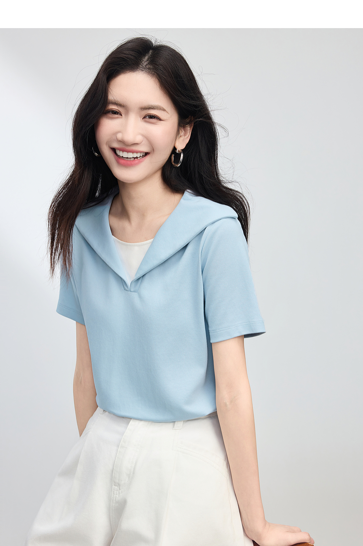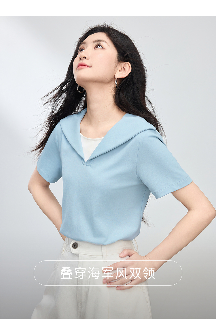 【周四狂欢价】熙世界海军领短袖T恤女夏季新款设计感独特别致蓝色体恤正肩上衣