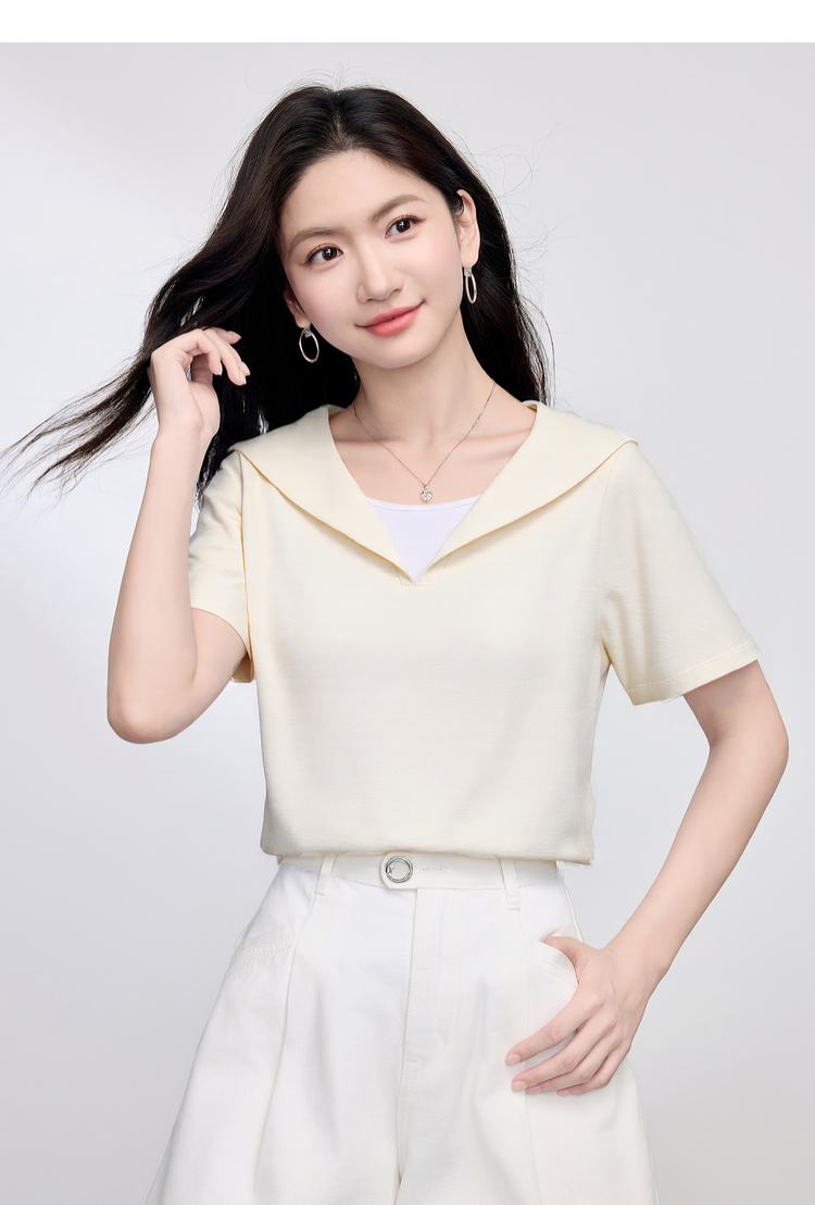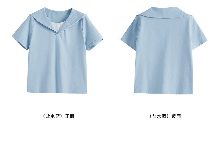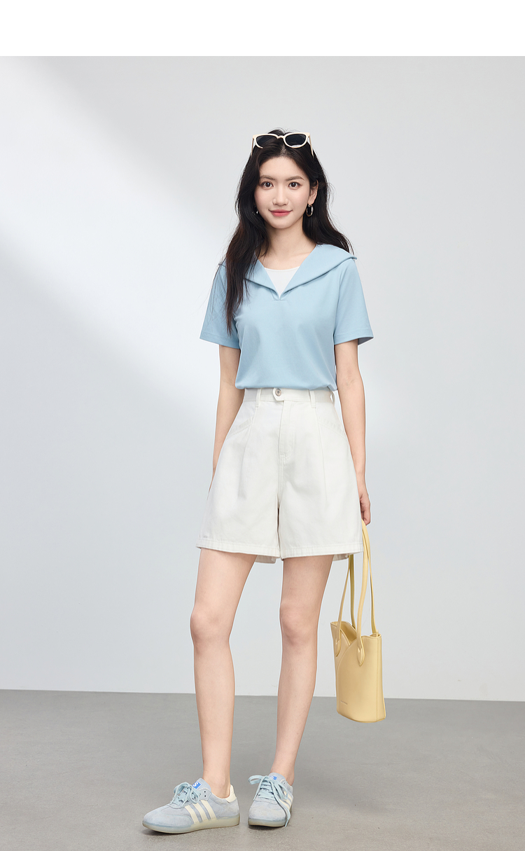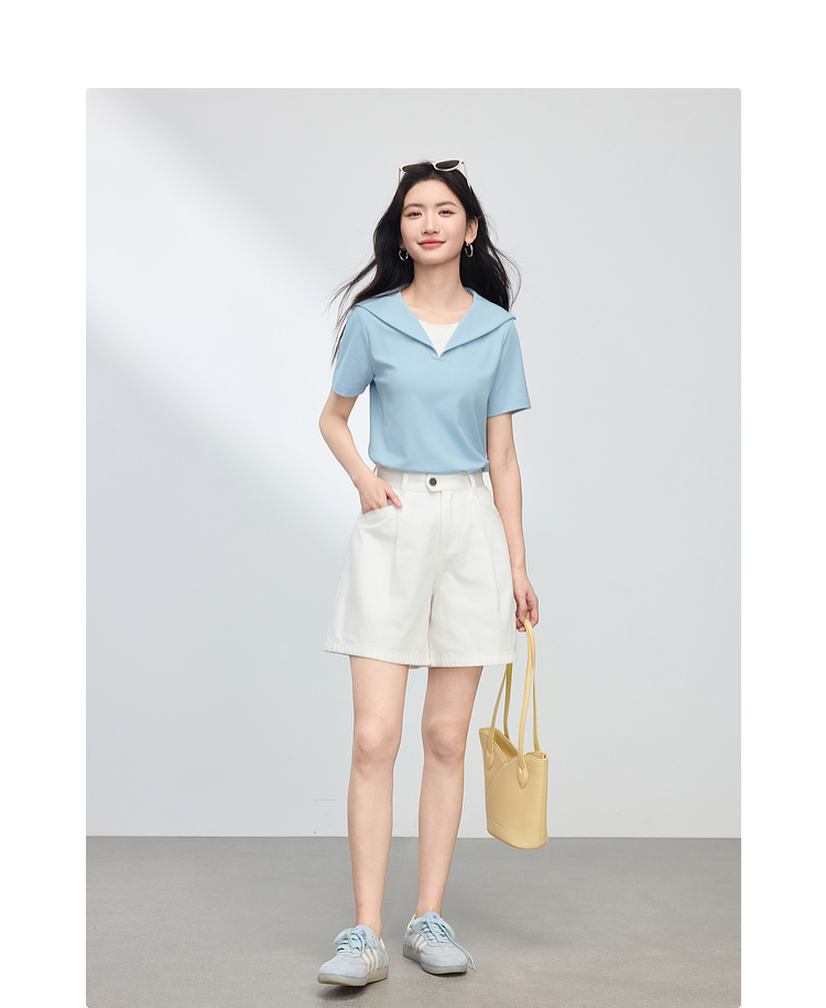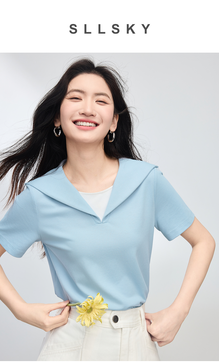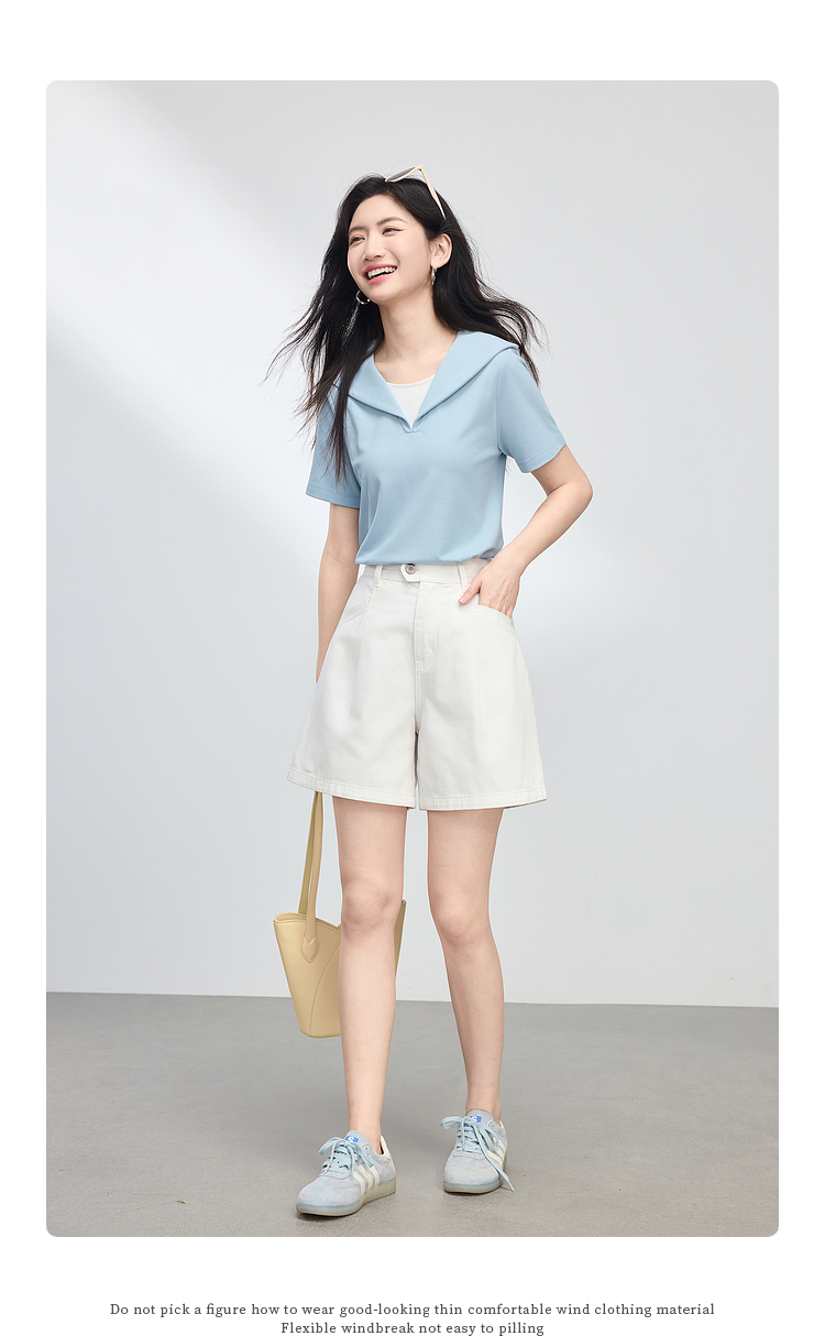 【周四狂欢价】熙世界海军领短袖T恤女夏季新款设计感独特别致蓝色体恤正肩上衣
