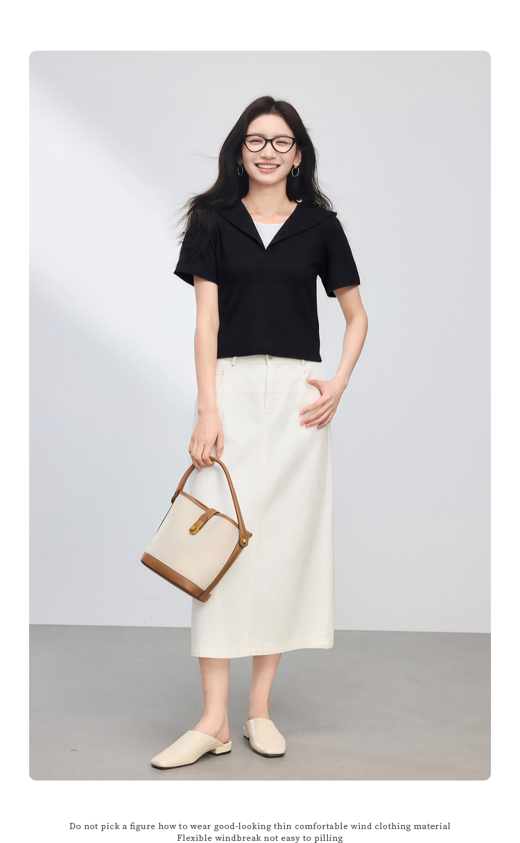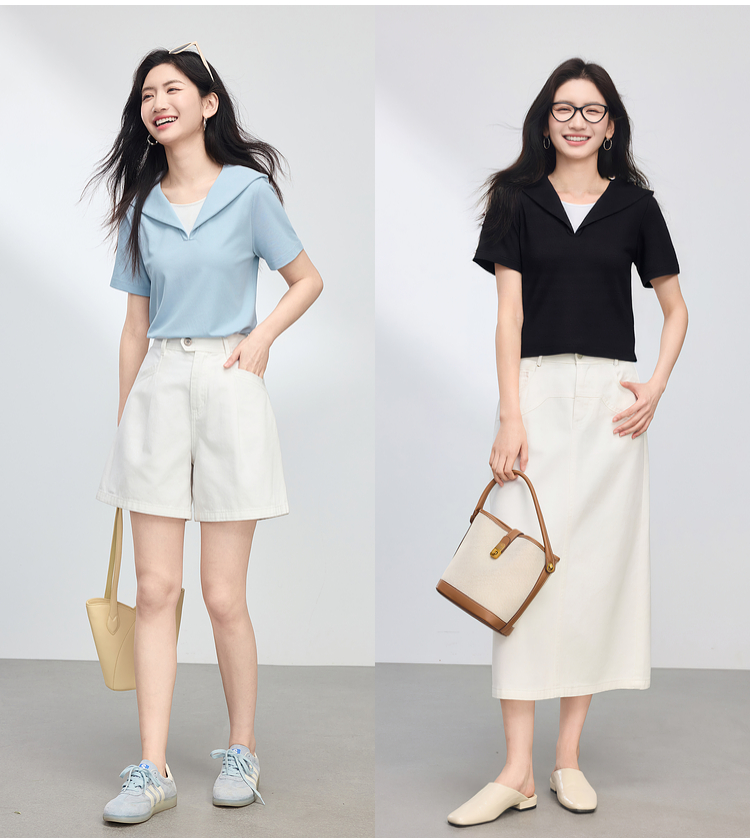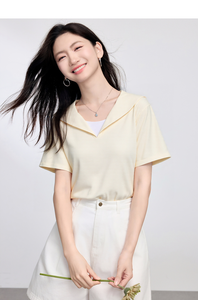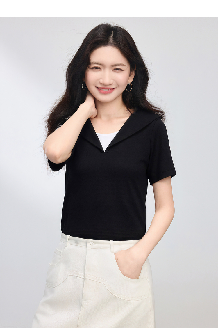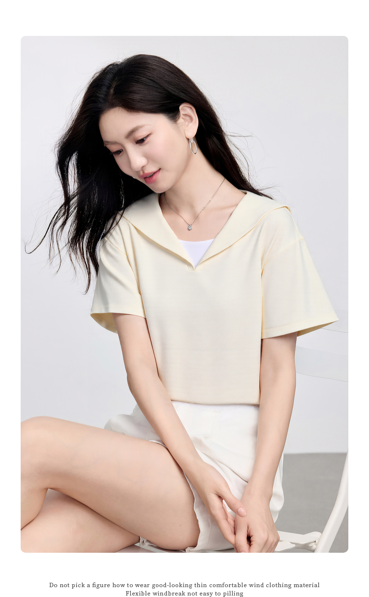 【周四狂欢价】熙世界海军领短袖T恤女夏季新款设计感独特别致蓝色体恤正肩上衣