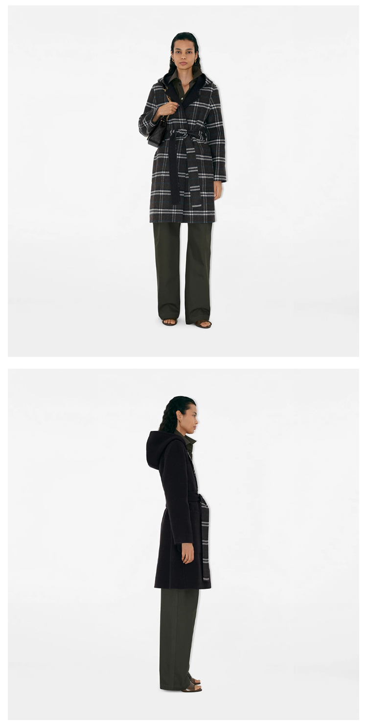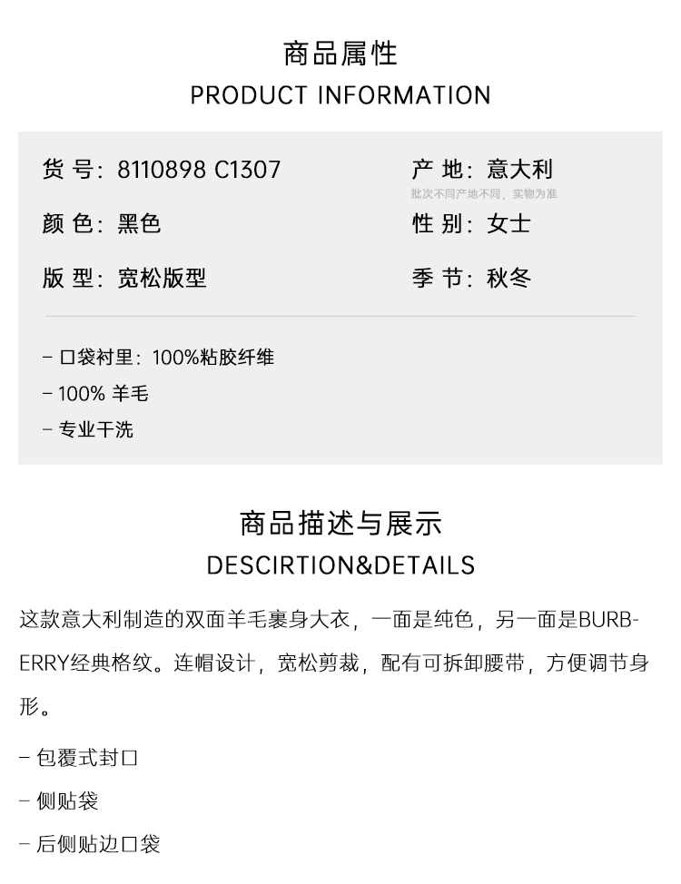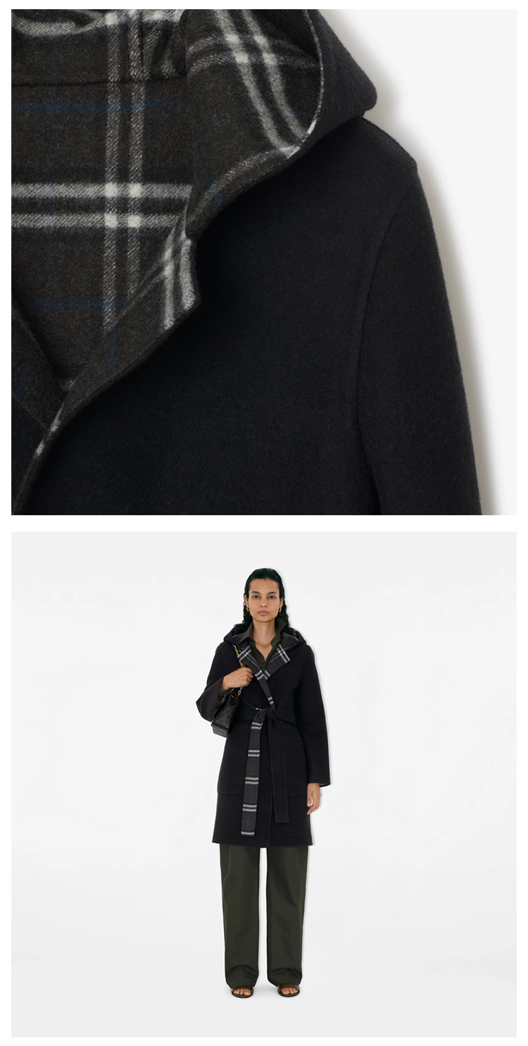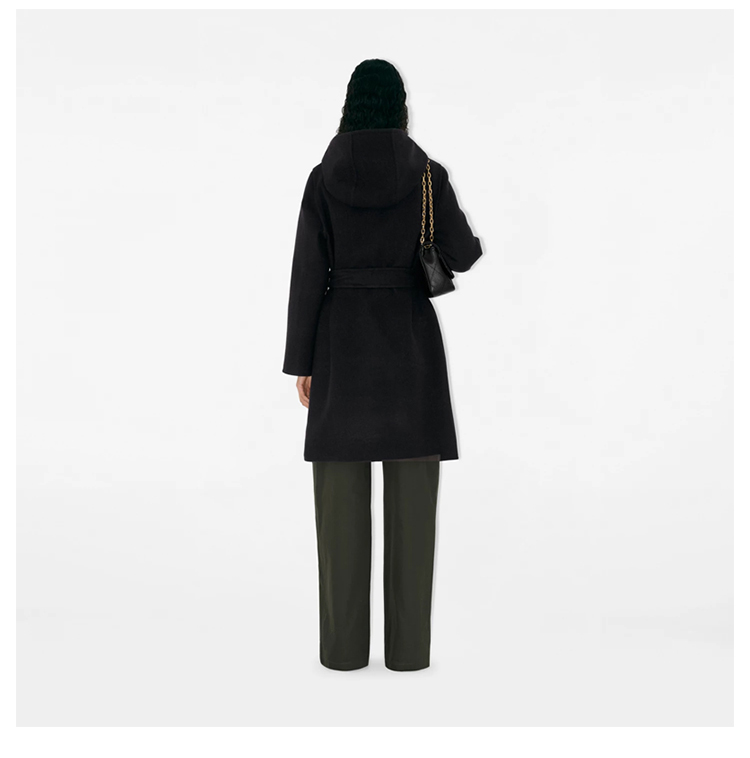BURBERRY 巴宝莉 女士双面羊毛连帽裹身大衣 黑色 8110898 C1307
