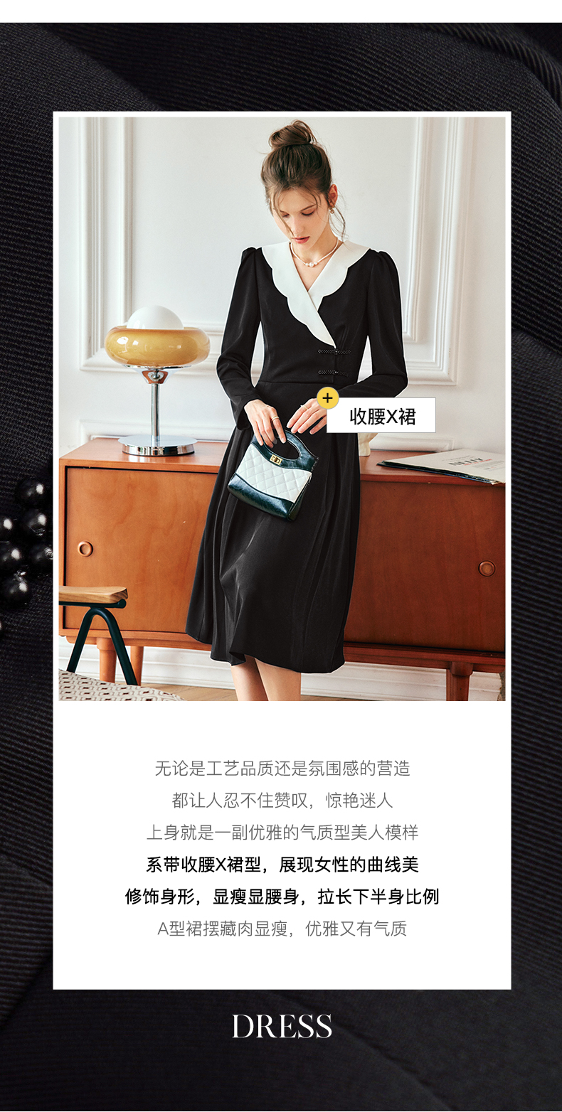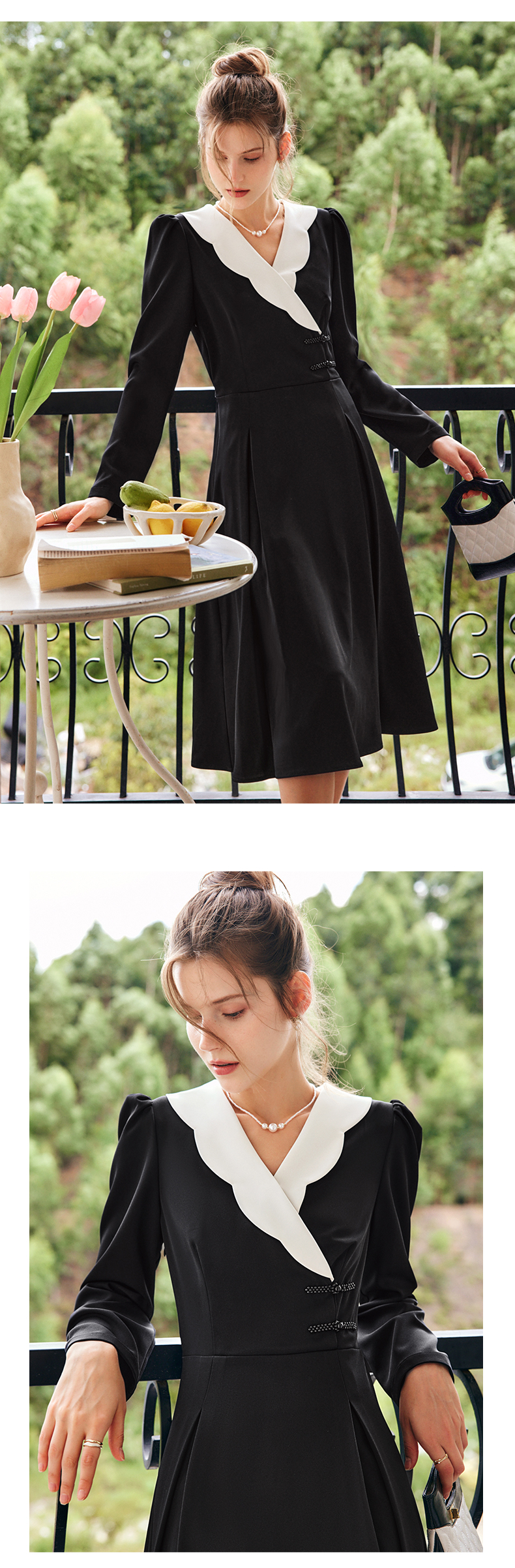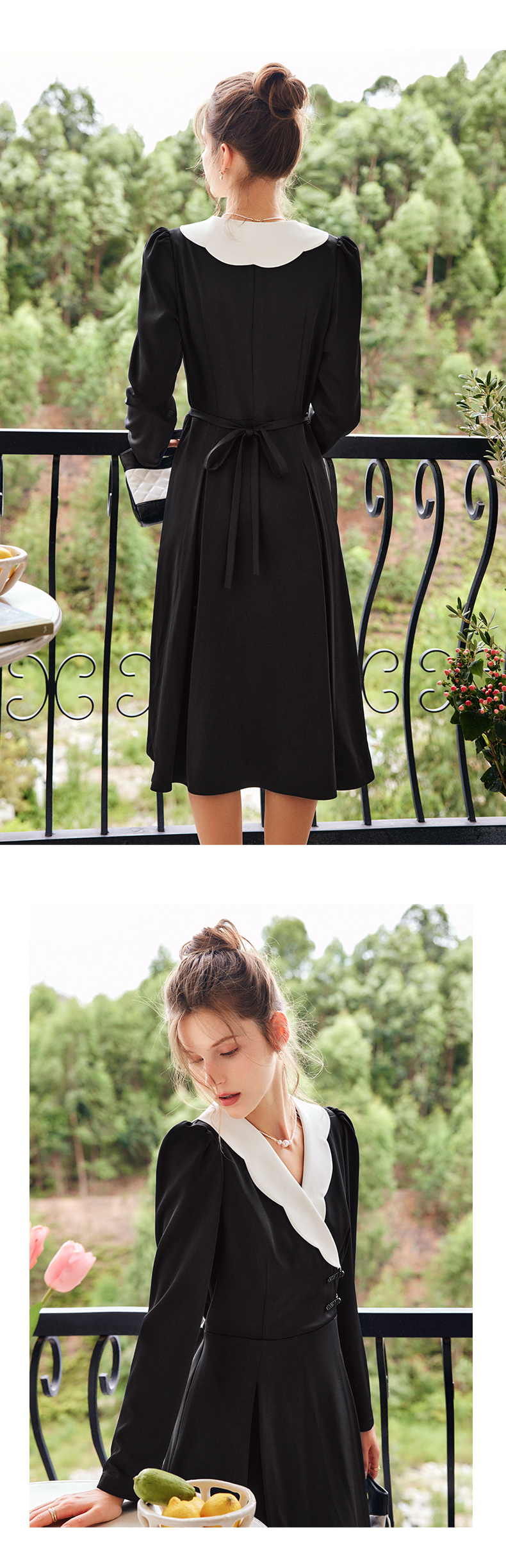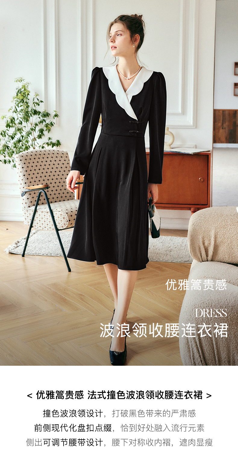 OLrain法式黑色连衣裙女早秋2022年新款显瘦设计感波浪领撞色裙子