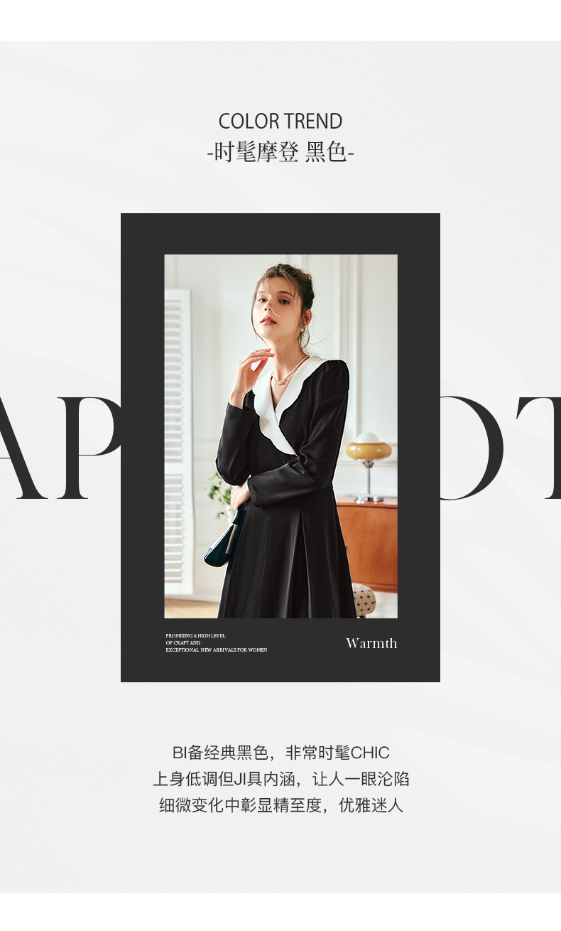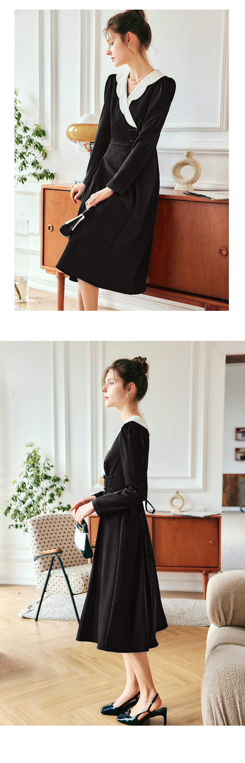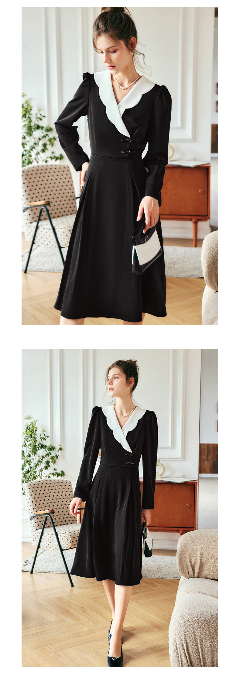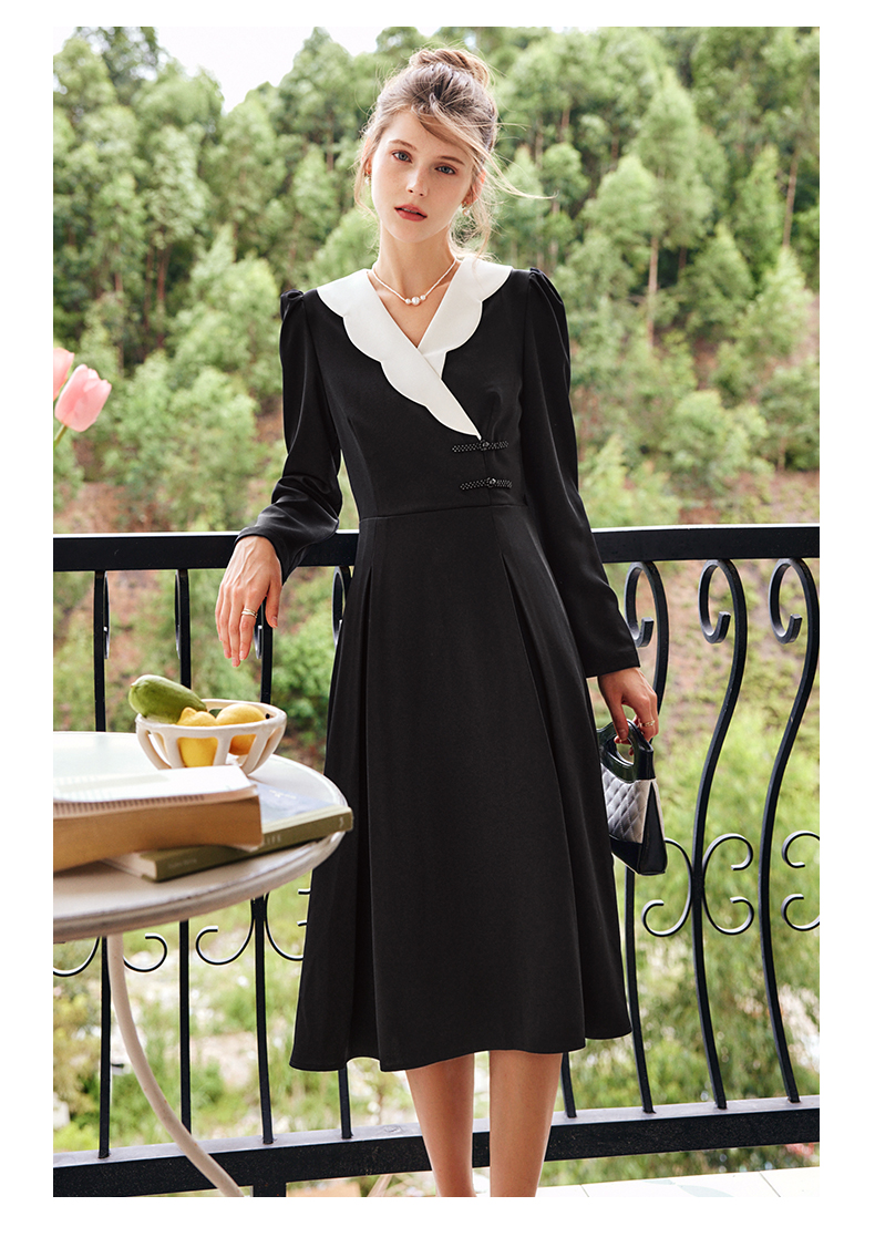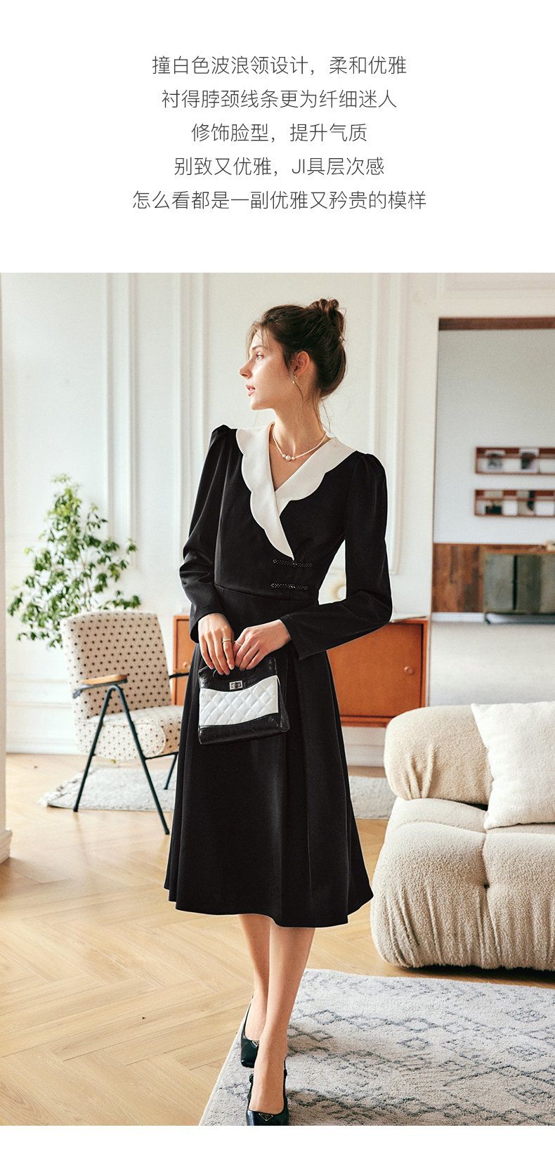 OLrain法式黑色连衣裙女早秋2022年新款显瘦设计感波浪领撞色裙子