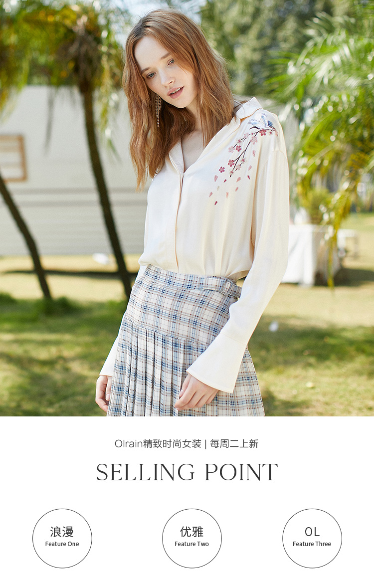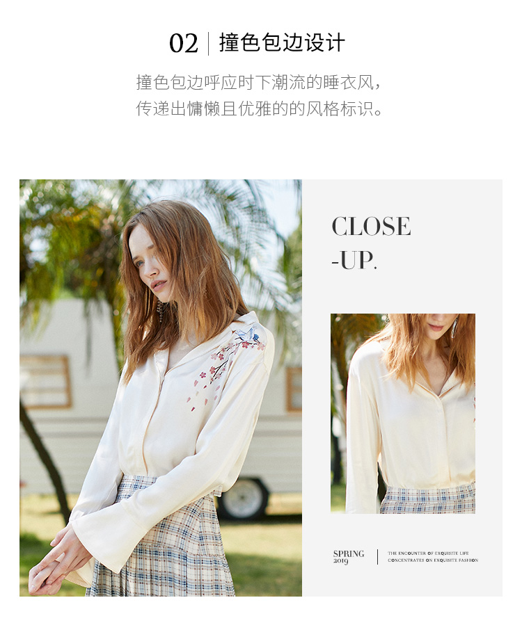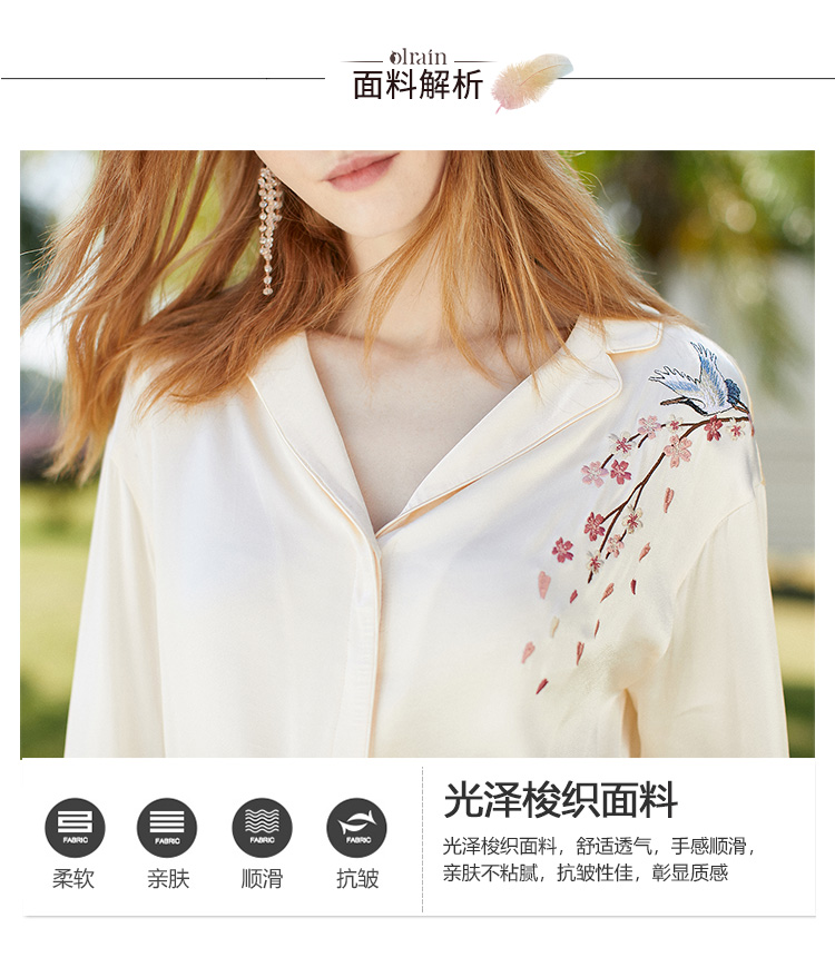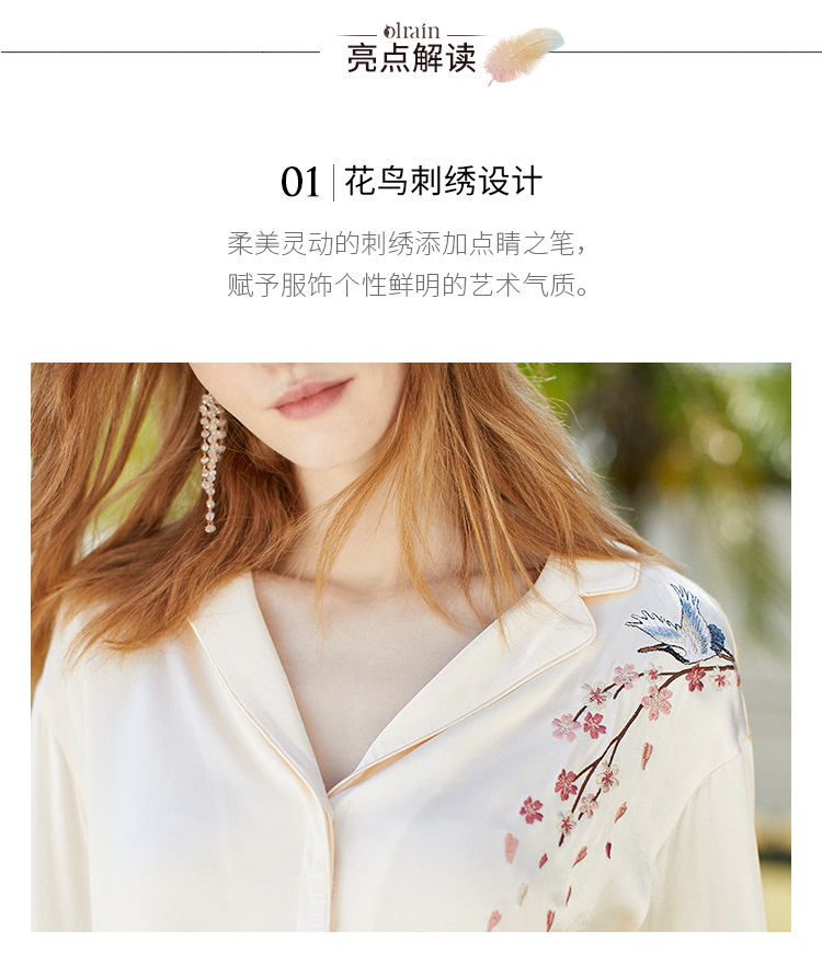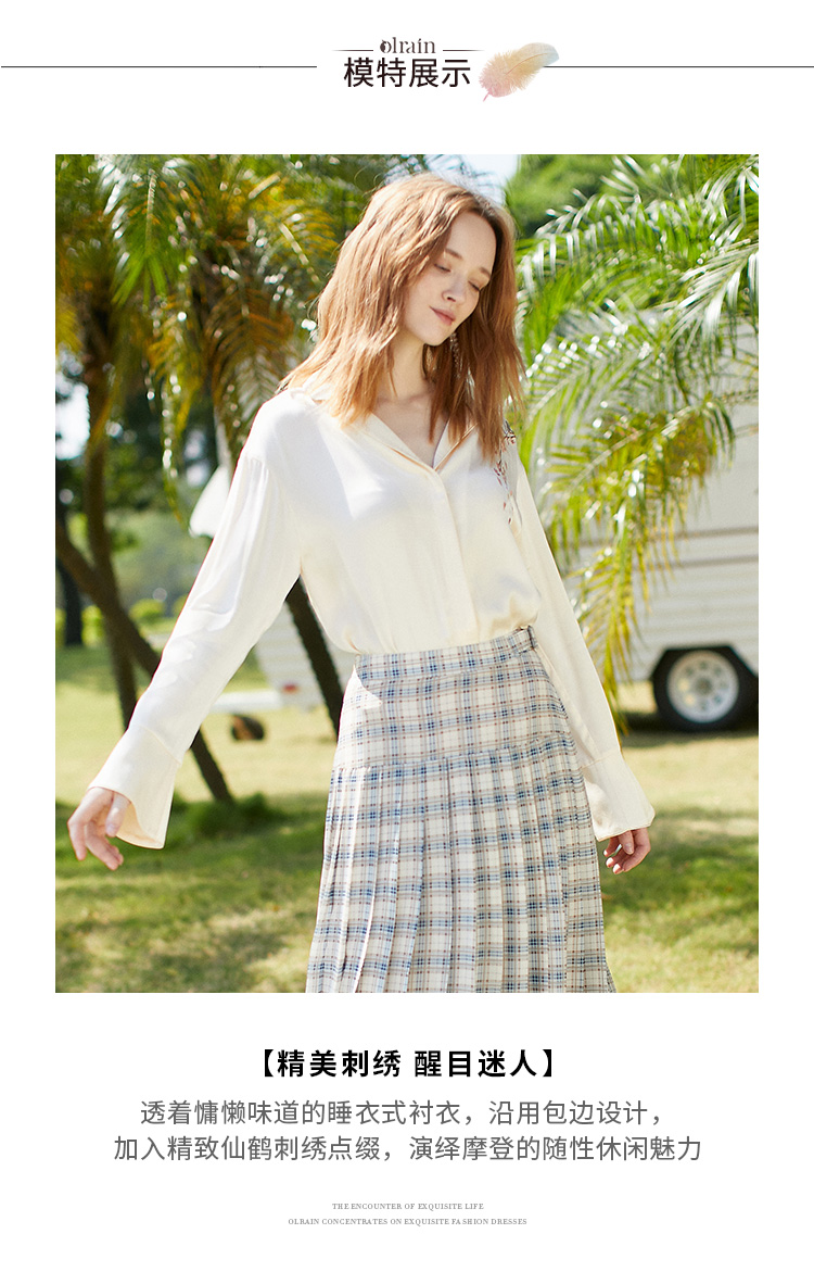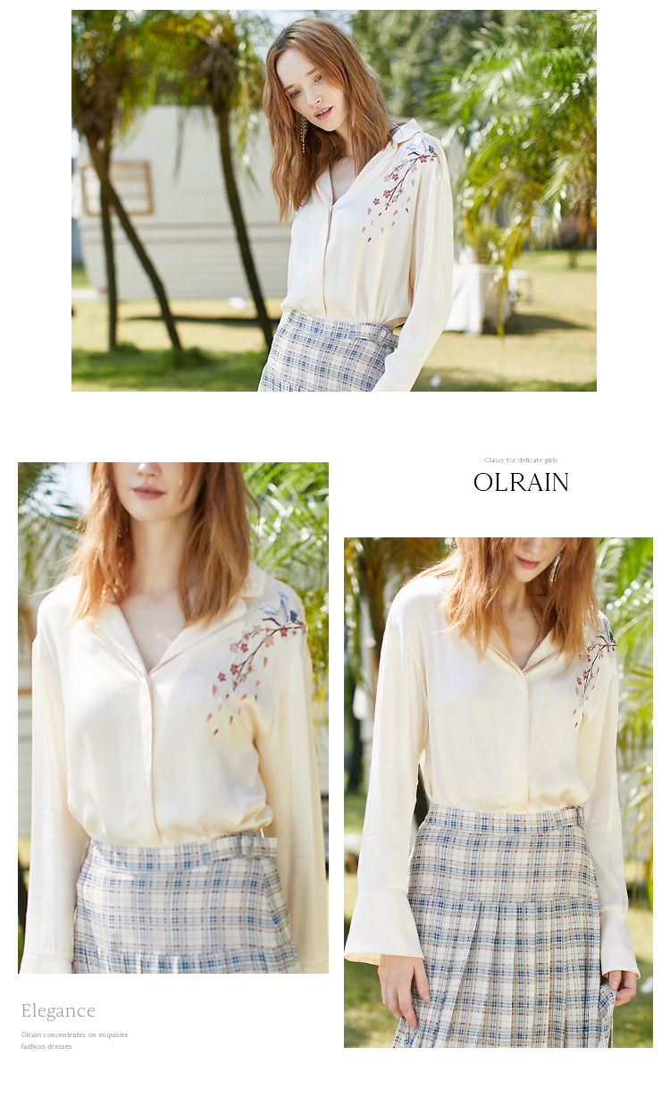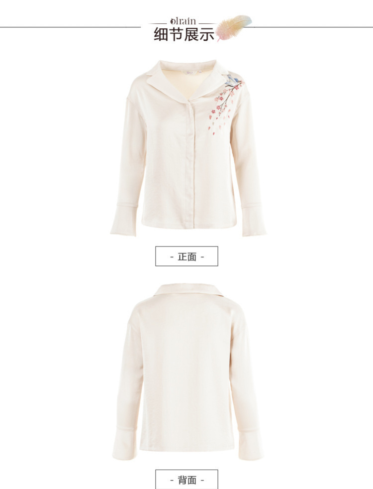 欧芮儿2022春装新款喇叭袖睡衣风刺绣衬衫女 复古百搭米白色衬衣