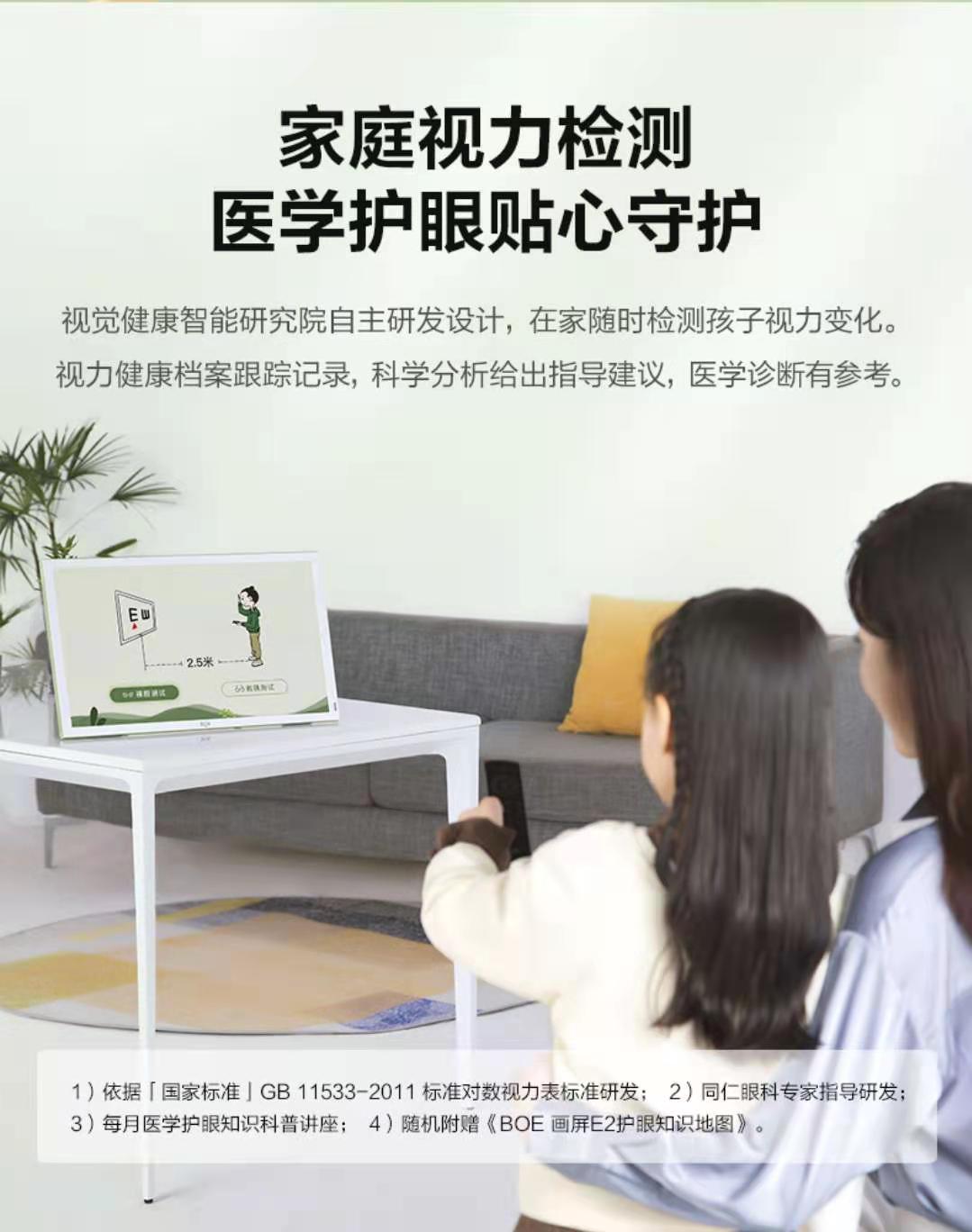 定制化显示设计,满足儿童网课学习多样化、个性化护眼需求。 【标注】:科学用眼保护视力,记得“202020 护眼法则”哦~更多详见《BOE 画屏护眼知识地图》。4. 标题:家庭视力检测,医学护眼贴心守护