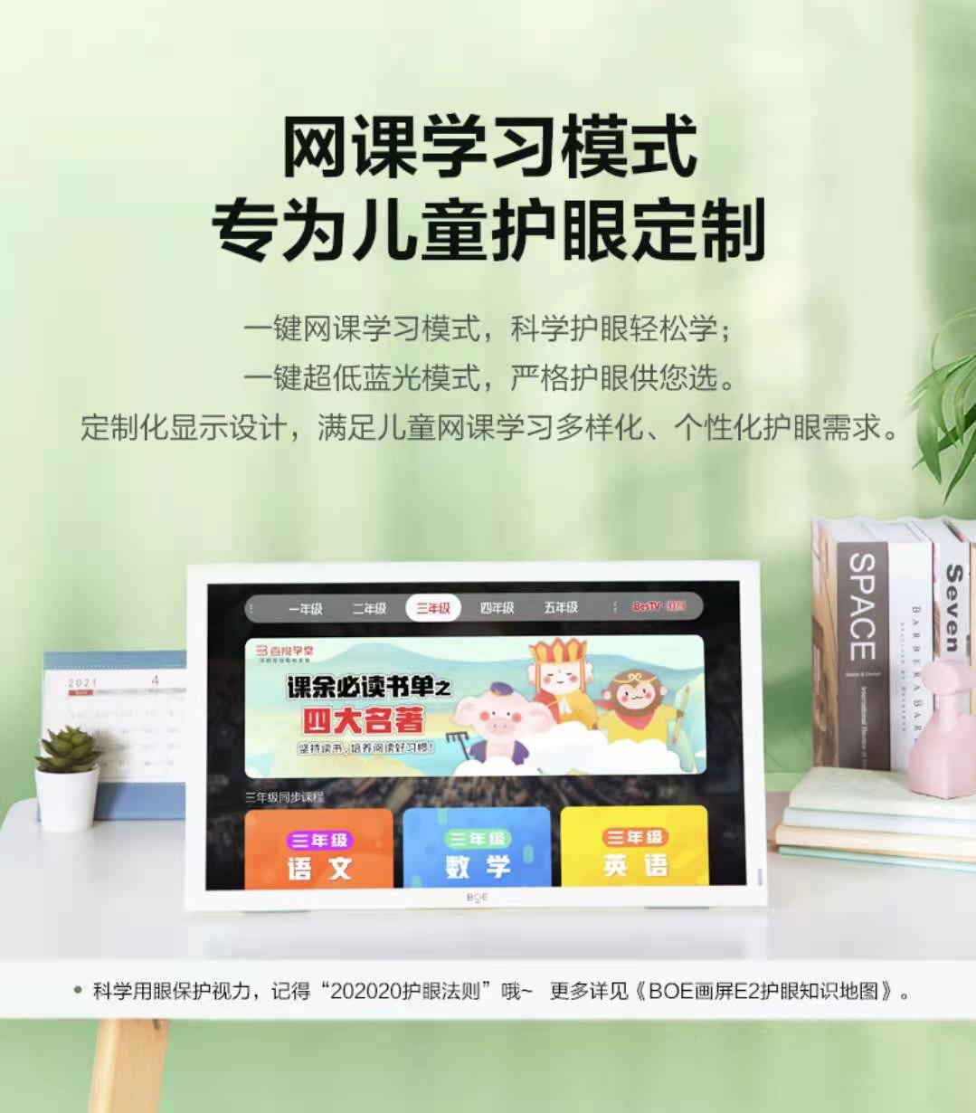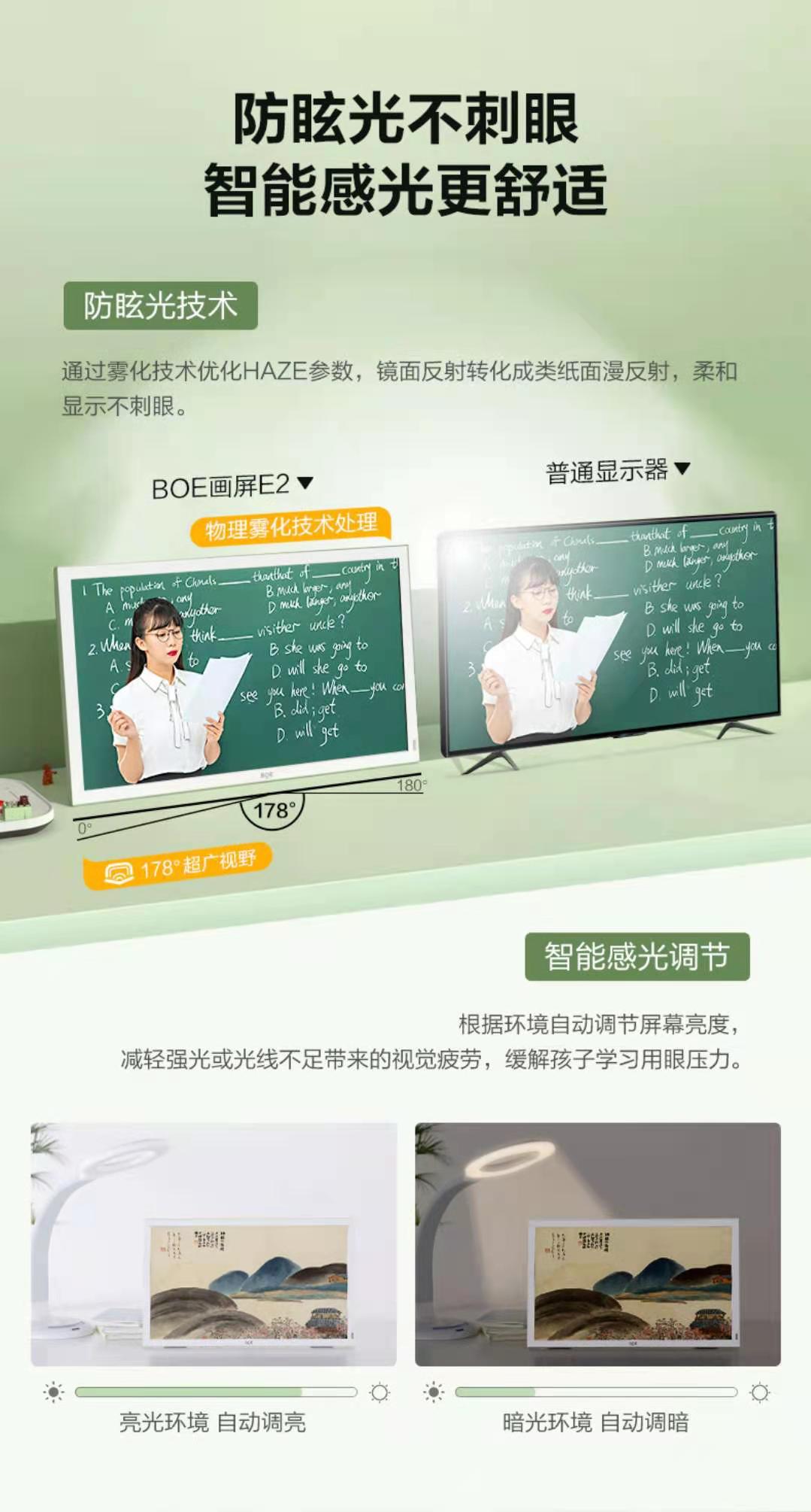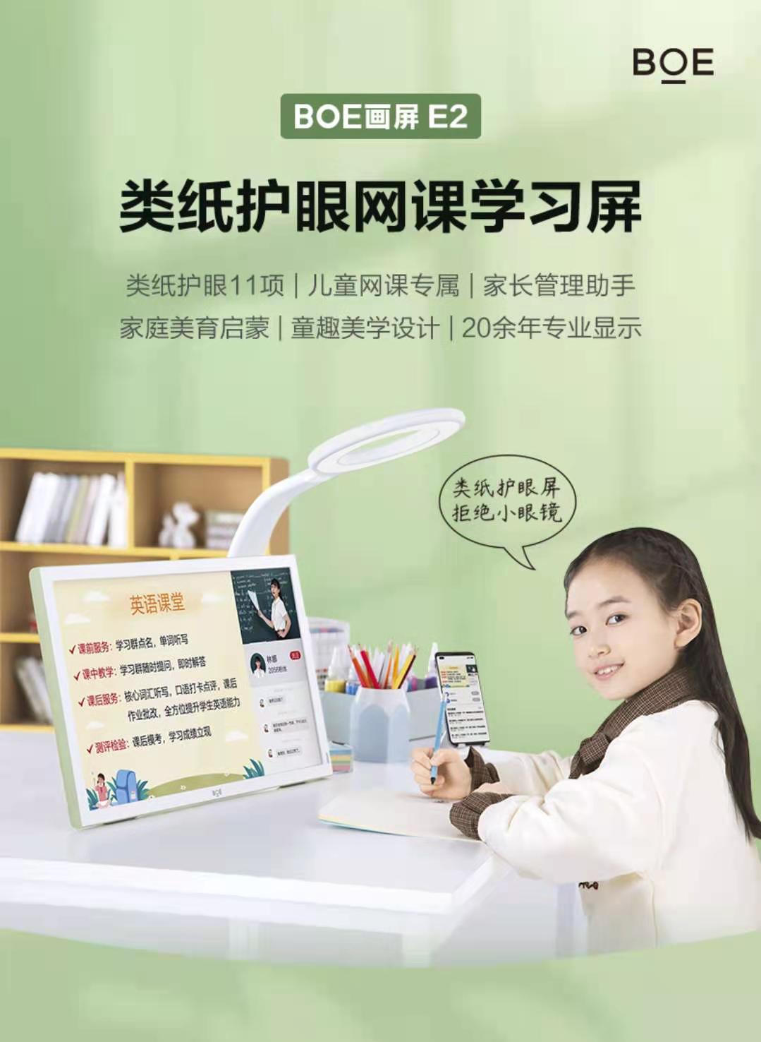 BOE 画屏 E2,类纸护眼网课学习屏。依托全球半导体显示产业龙头企业--京东方技术实力创新研 发,专为 3~15 岁儿童网课学习场景设计;其凭借独有的类纸护眼显示技术,解决蓝光、频闪、眩光等 因素易造成儿童视力损伤的问题;辅助医学护眼方法,通过用眼时长提醒、视力随时检测、视力健康档 案、用眼习惯养成等方式,守护儿童网课用眼健康。更有一键网课投屏、家长管理助手、百视通少儿教 育定制内容,打造纯净学习环境,让孩子专注学,高效学。