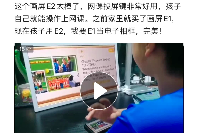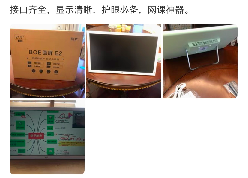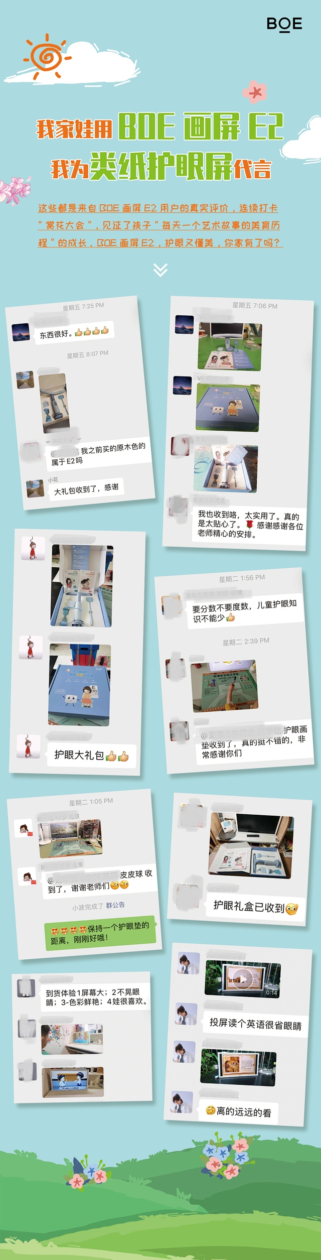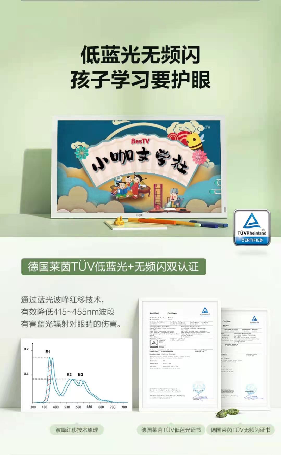 BOE 画屏 E2,类纸护眼网课学习屏。依托全球半导体显示产业龙头企业--京东方技术实力创新研 发,专为 3~15 岁儿童网课学习场景设计;其凭借独有的类纸护眼显示技术,解决蓝光、频闪、眩光等 因素易造成儿童视力损伤的问题;辅助医学护眼方法,通过用眼时长提醒、视力随时检测、视力健康档 案、用眼习惯养成等方式,守护儿童网课用眼健康。更有一键网课投屏、家长管理助手、百视通少儿教 育定制内容,打造纯净学习环境,让孩子专注学,高效学。