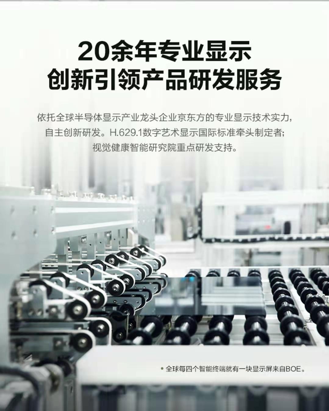依托全球半导体显示产业龙头企业京东方的专业显示技术实力,自主创新研发。 H.629.1数字艺术显示国际标准牵头制定者;视觉健康智能研究院重点研发支持。 【小字:】全球每四个智能终端,就有一块显示屏来自 BOE。