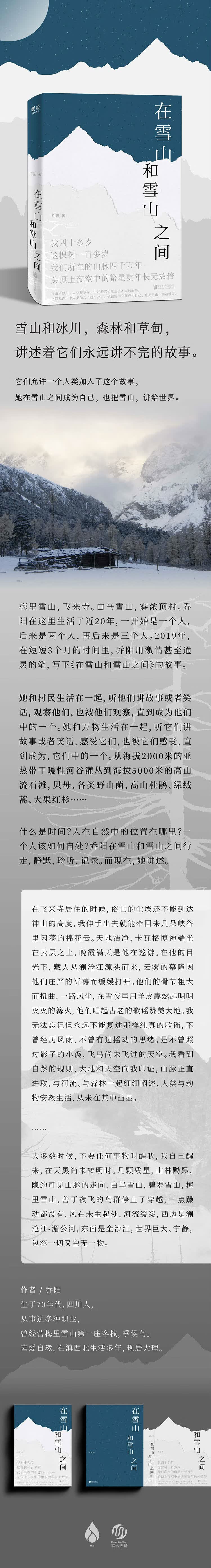 《在雪山和雪山之间》是作者乔阳在云南德钦的雾浓顶村生活了近二十年后写的随笔。她与雪山、与雾浓顶村的村民相处了近二十年。她与北美的自然摄影师威廉博士、滇西植物权威潘老师一同行走与白马雪山、碧罗雪山和梅里雪山之间,在海拔2000米与5000米之间观察植物与树木之美,思考人与人之间的关系、人在天地间和自然中的位置。这二十年的时间里,她观雪山,发现雪山周边与雪山之间的植物世界,植物物种的兴衰与人类的日常活动、以及经济收益之间的关系。随笔的文字诚实、性情、且美。