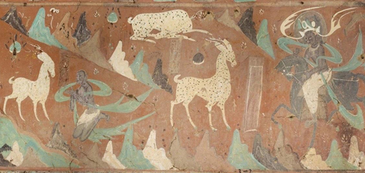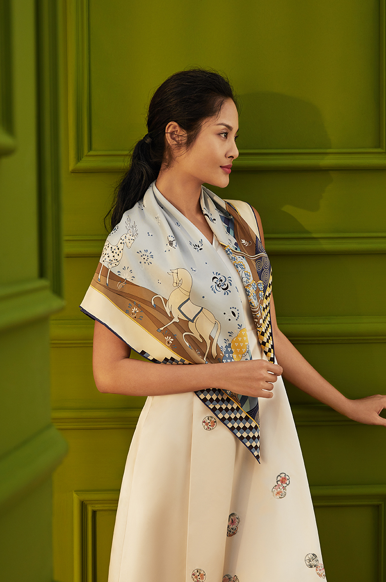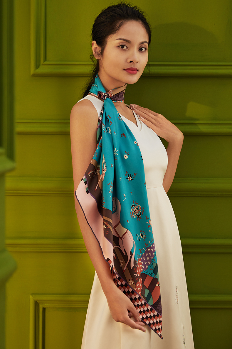 灵感源自敦煌莫高窟北魏257窟壁画,该壁画以长卷式连环画展现了《鹿王本生》的故事。故事中九色鹿是真善美的化身,具有非凡的象征意义,象征着爱、勇气和智慧。丝巾以九色鹿配以青绿山水,并点缀寓意吉祥的花卉、忍冬等纹样,表达美好及福禄之意。