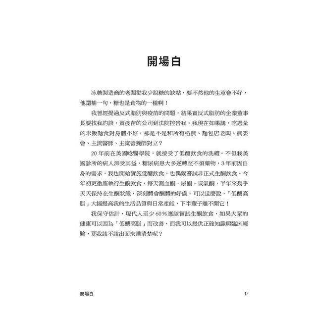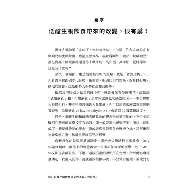 但陳俊旭博士發現,有很多人的作法錯誤,甚至以訛傳訛形成偏見,反而危害健康。他花費將近半年時間徹底親身實踐,將個人體驗加上歐美發展出來的學理寫成本書,帶大家了解,生酮和低醣、高醣飲食的差別,找到適合自己的健康飲食法。