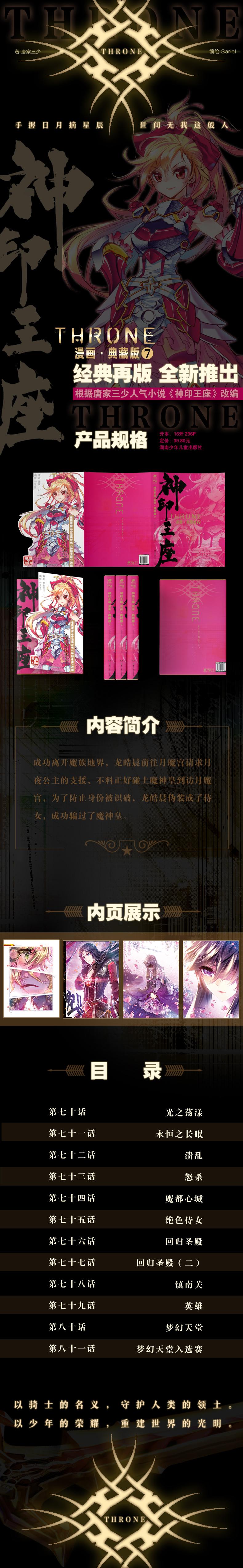根据网络作家之王唐家三少《神印王座》同名小说改编! 十年热血 经典再版 --------------------------------------------------------------------------- 唐家三少:中国作家协会全国委员会委员,起点中文网白金作家,网络小说很好名家,以平均一年一部超长篇、高质量的作品书写传奇。每部作品均赚得过亿点击、千万收藏推荐、百家媒体关注。“中国作家富豪榜网络作家之王”得主,连续两年蝉联“中国网络作家富豪榜”冠军宝座。2013,荣获中国UGC传播大奖“年度网络奇幻文学奖”。2014,荣登福布斯中国名人榜。代表作:《光之子》、《狂神》、《斗罗大陆》、《神印王座》、《冰火魔厨》、《生肖守护神》《斗罗大陆Ⅱ绝世唐门》等。 Sariel:A-Soul漫画工作室人气漫画家,创作作品《神印王座》。 --------------------------------------------------------------------------- 画面与情节的完美呈现 适合所有有爱、有梦想、爱漫画、爱小说的读者群 --------------------------------------------------------------------------- ◆ 魔族强势,在人类即将被灭绝之时,六大圣殿崛起,带领着人类守住最后的领土。一名少年,为救母加入骑士圣殿,奇迹、诡计,不断在他身上上演。在这人类六大圣殿与魔族七十二柱魔神相互倾轧的世界,他能否登上象征着骑士优选荣耀的神印王座? ◆ 主角龙皓晨先天光明之子体质,勤奋努力又自强不息,坚韧不拔的积极正能量深深感动着广大读者。有趣的故事,加上健康向上的内容,让青少年有兴趣去阅读,并从中得到教益。原作在市场上取得了很大的成功,相信我们的漫画也能在取得社会效益的同时,创造很好的经济效益。