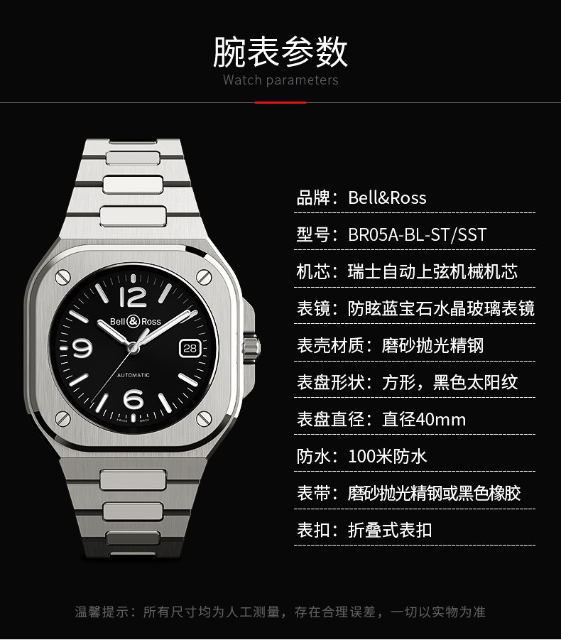 Bell&Ross 柏莱士 瑞士表机械手表自动腕表都市商务男士款轻奢风 BR05A-BL-ST/SST