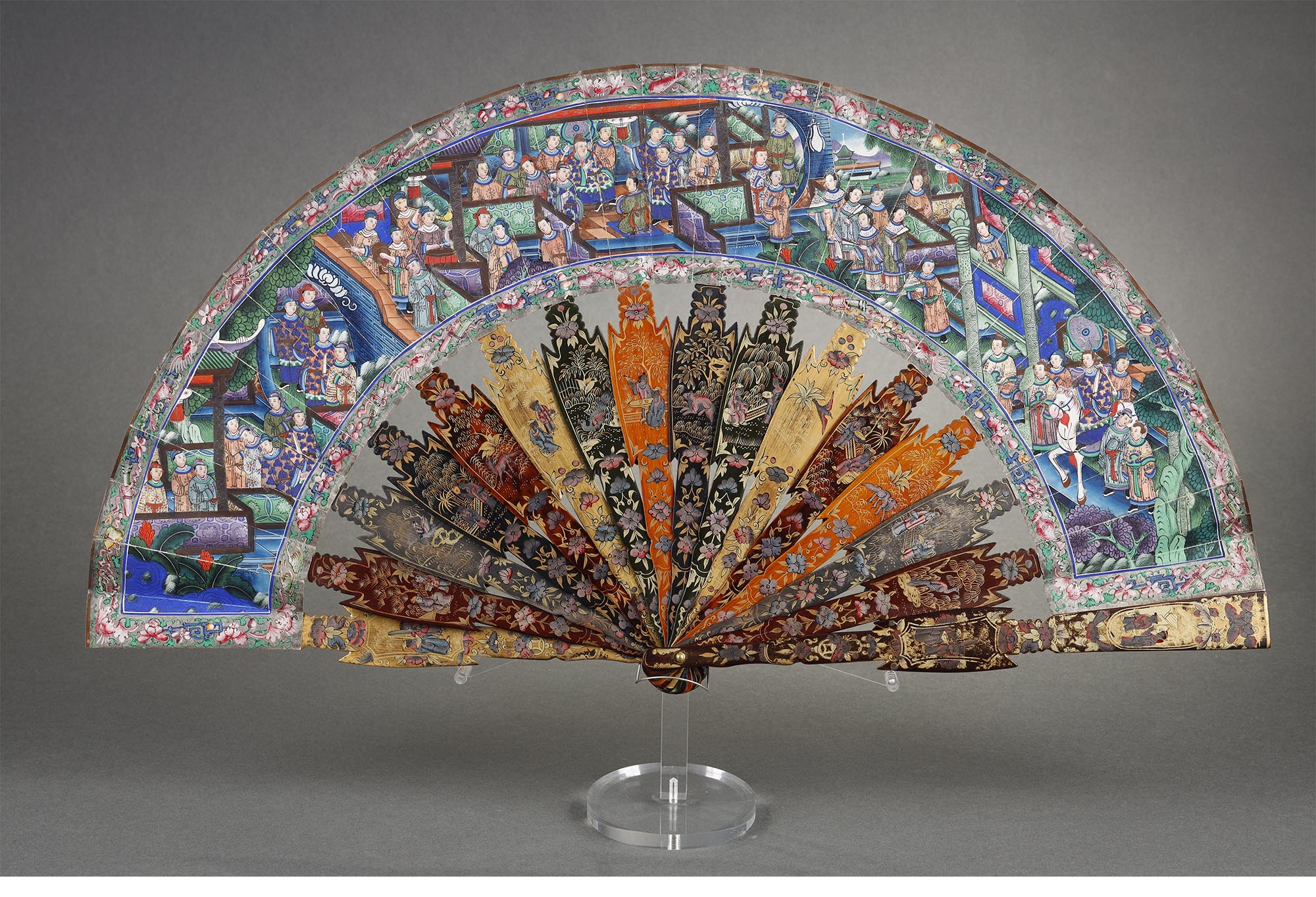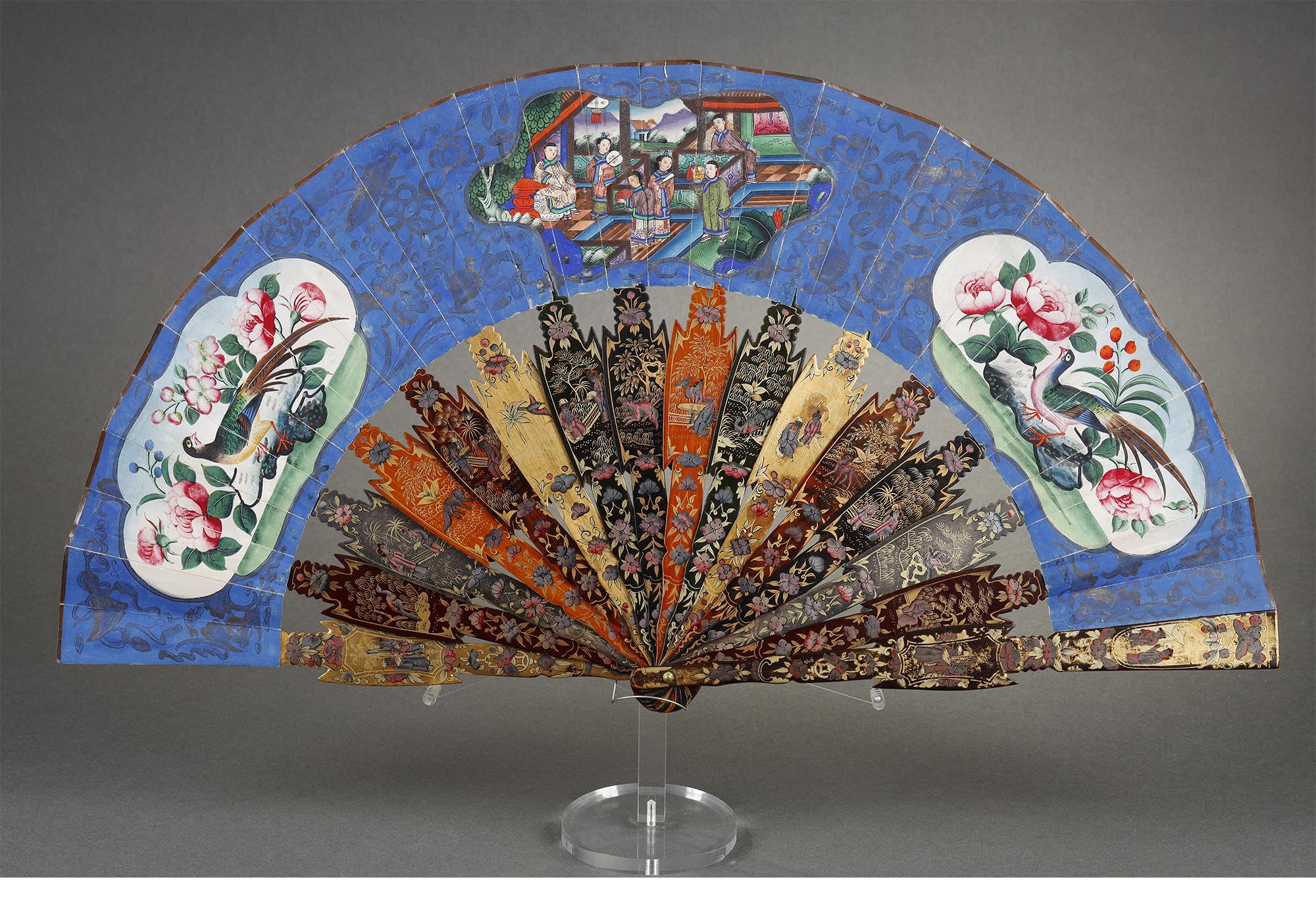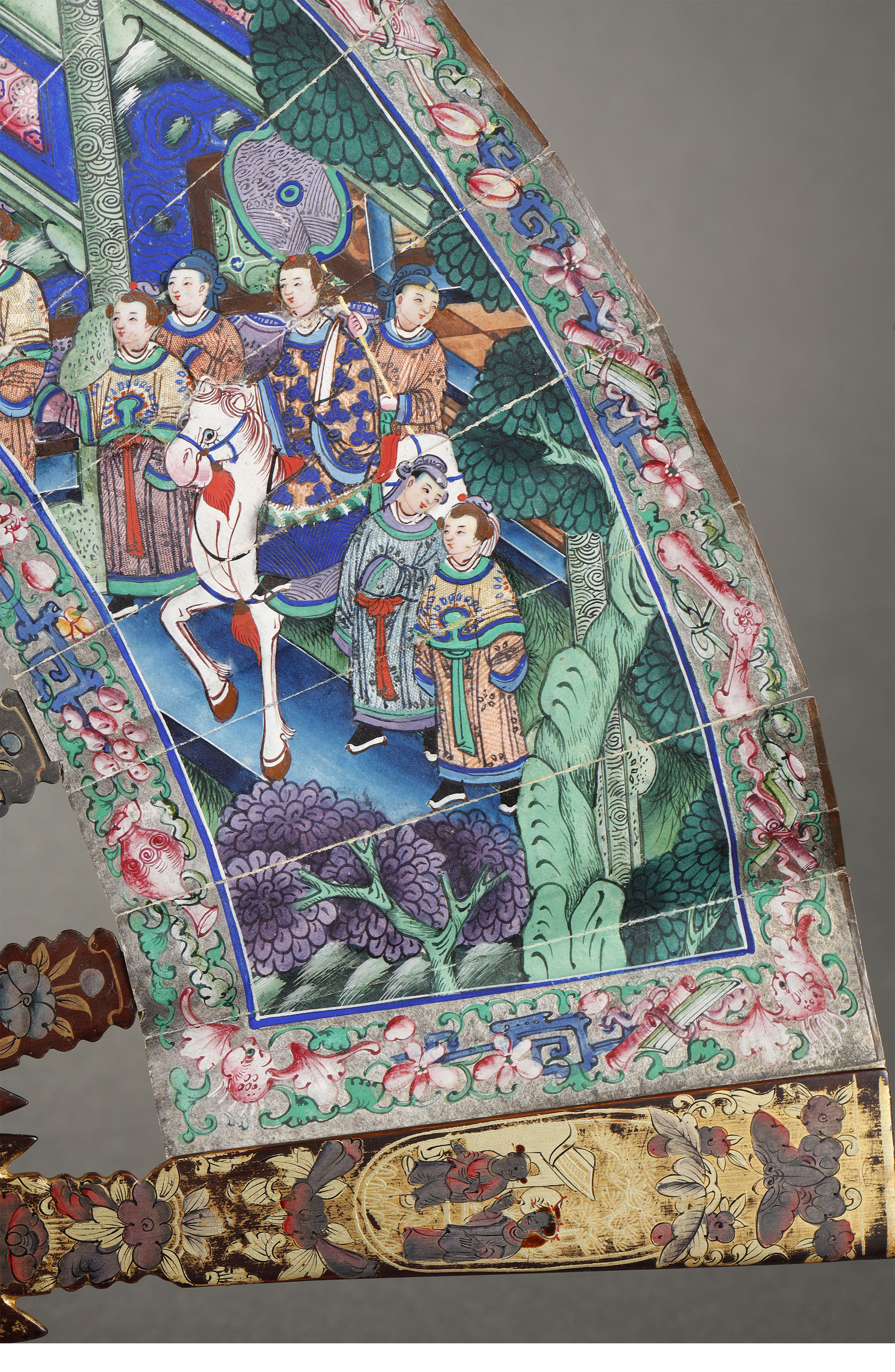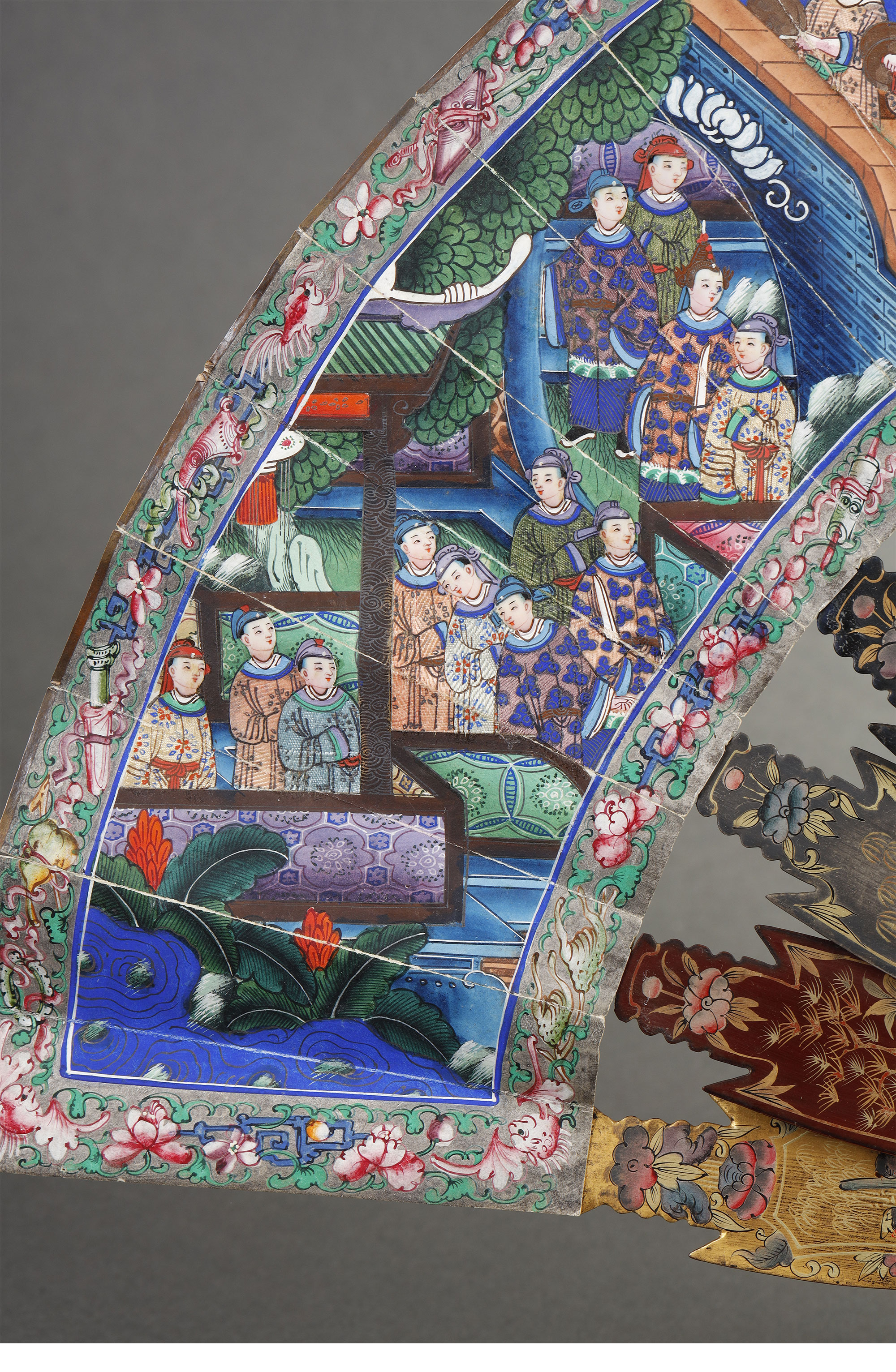 清代晚期十三行出品纸本彩绘「郭子仪拜寿图」髹漆描金骨折扇