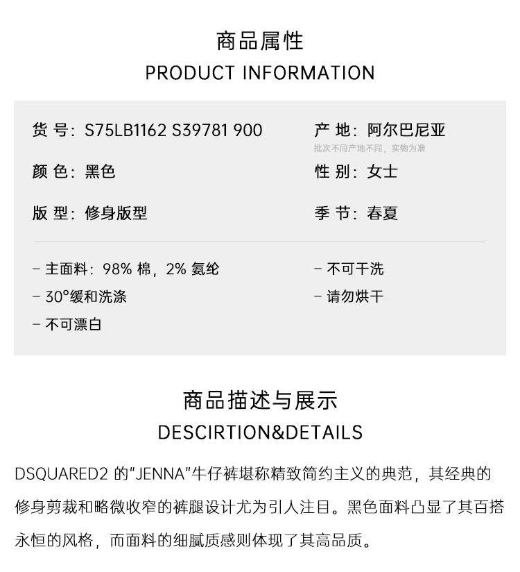 DSQUARED2 女士 Jenna 修身牛仔裤 黑色 S75LB1162 S39781 900