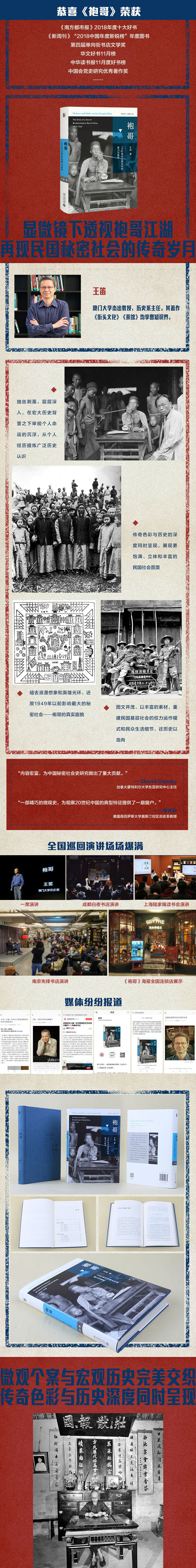 我对袍哥的兴趣,开始于 1980 年代,并持之以恒地收集有关的记载。在 1993 年出版的关于长江上游的社会史《跨出封闭的世界》中, 我对这个组织有一个比较初步的描述,后来在《街头文化》一书中, 我讨论了袍哥和街头政治的关系,在《茶馆》的研究中,我分析了袍哥 “吃讲茶”在地方权力和控制中的作用。