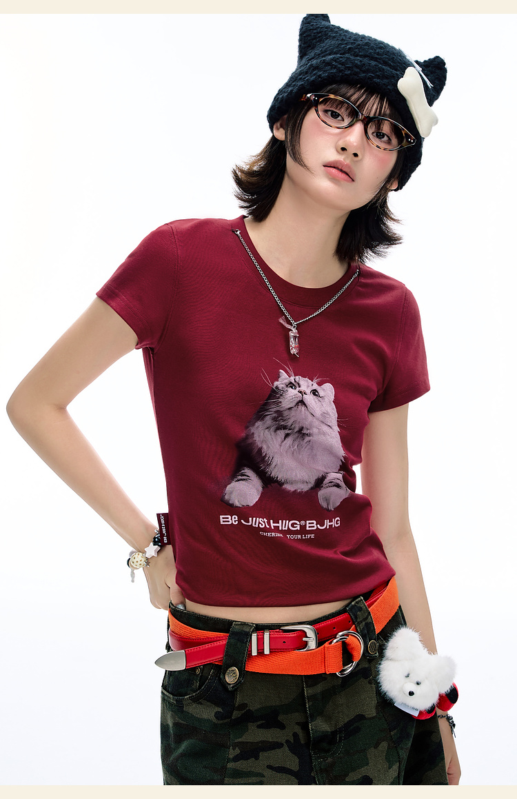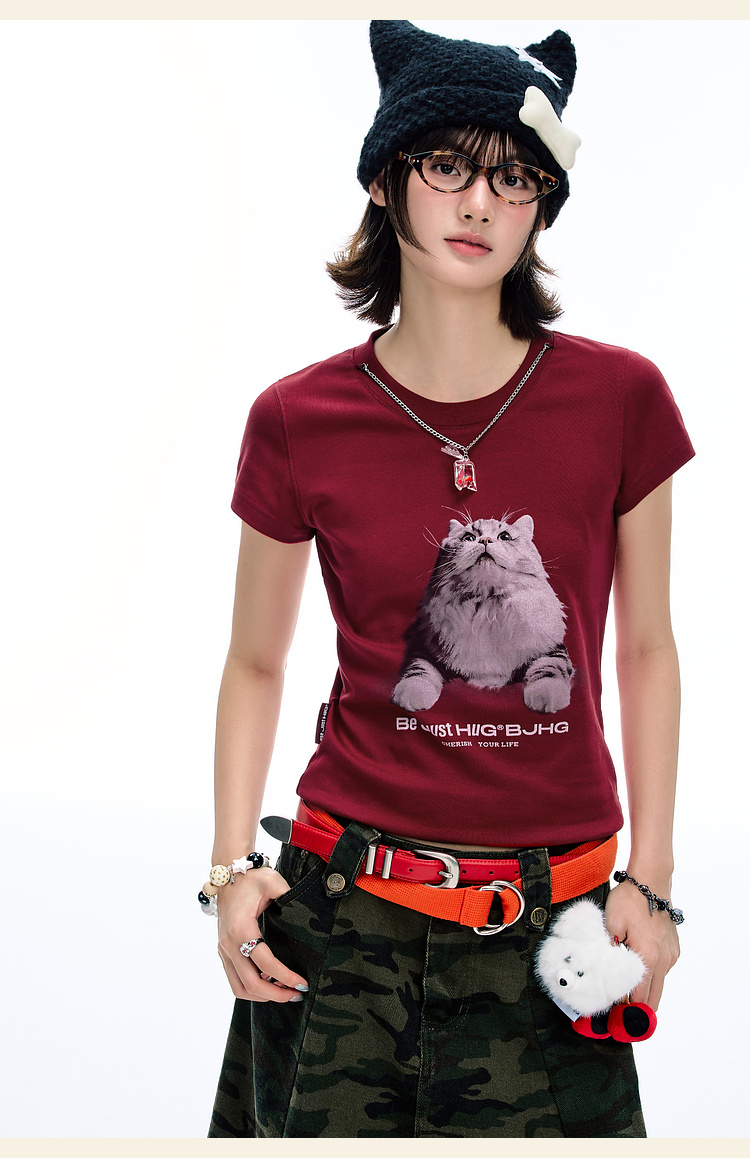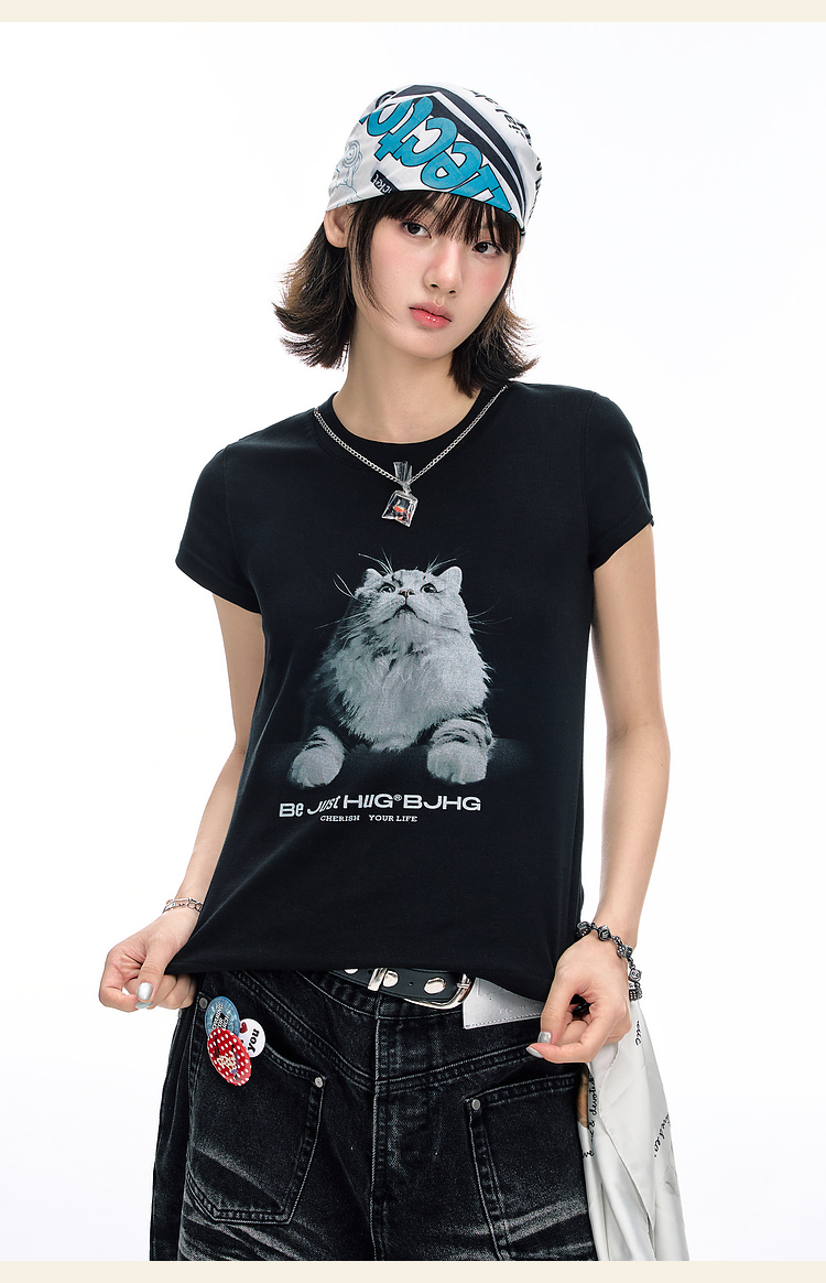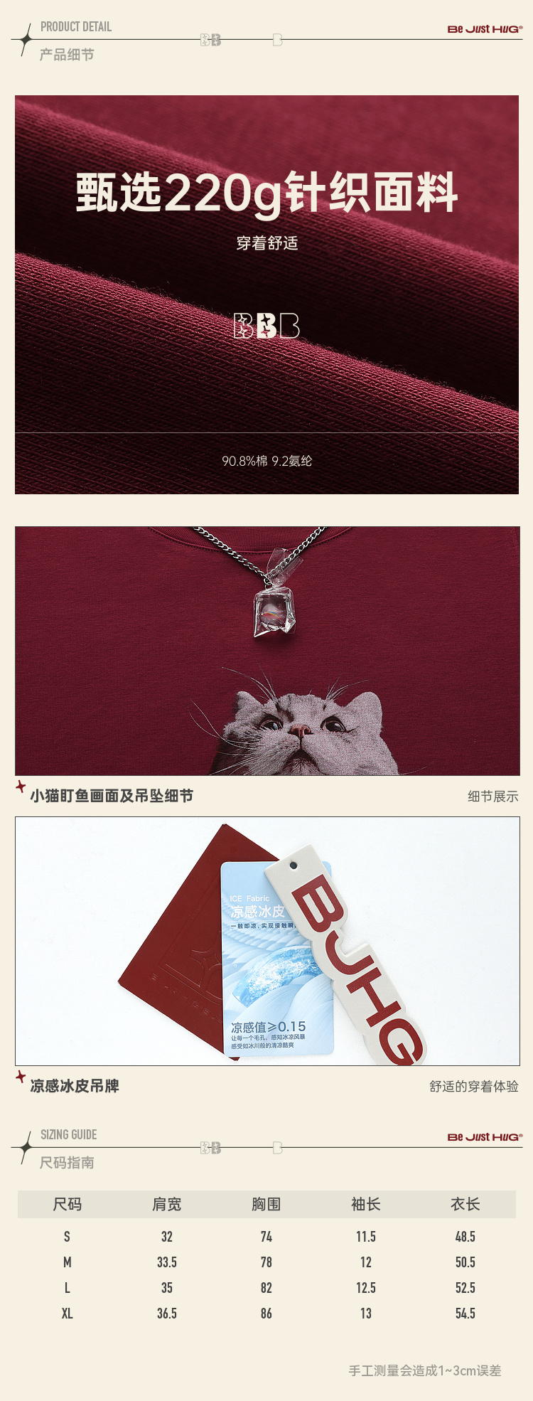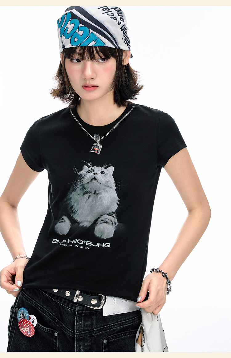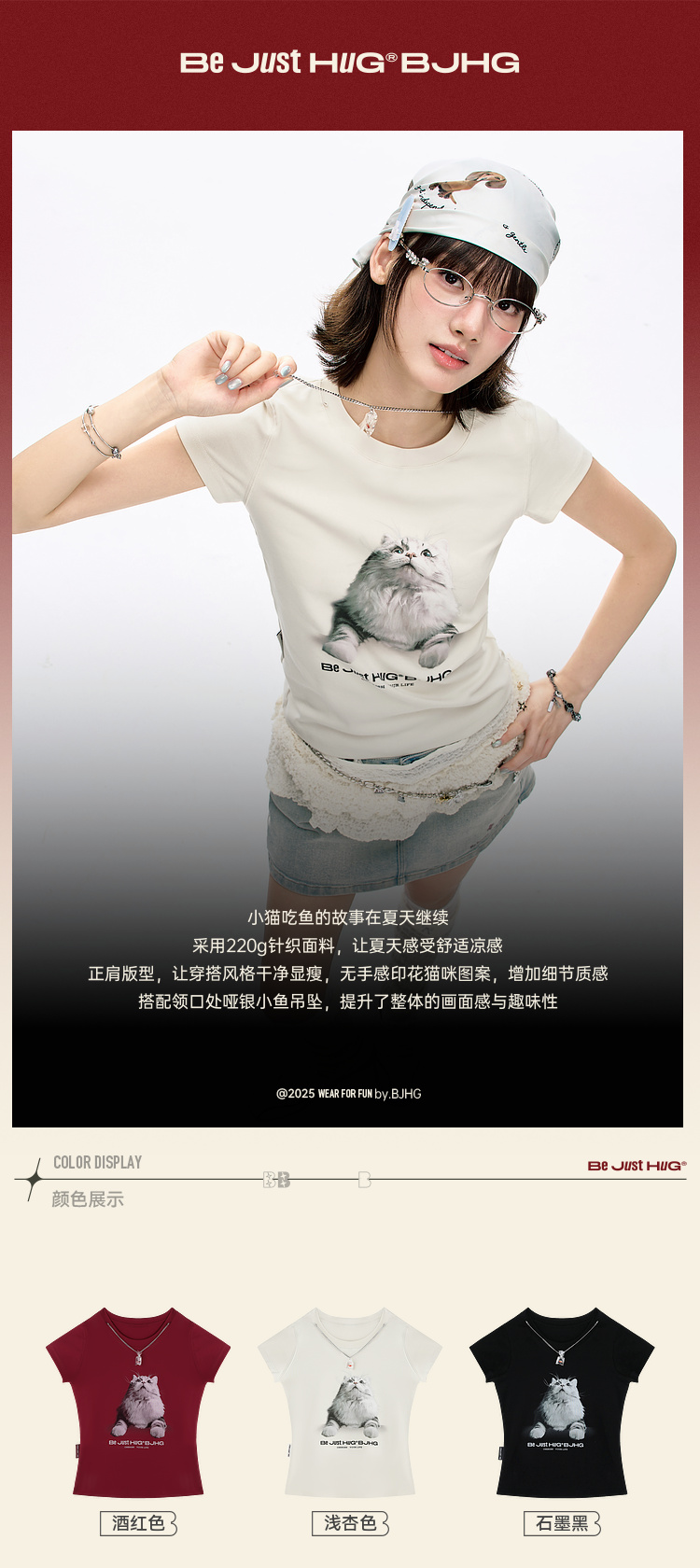 BJHG不计后果小猫抓鱼T恤短袖女款夏季微弹修身半袖凉感正肩T恤女