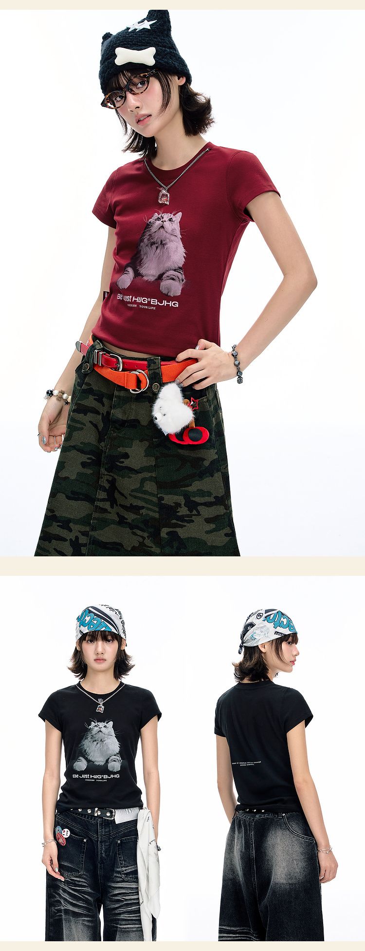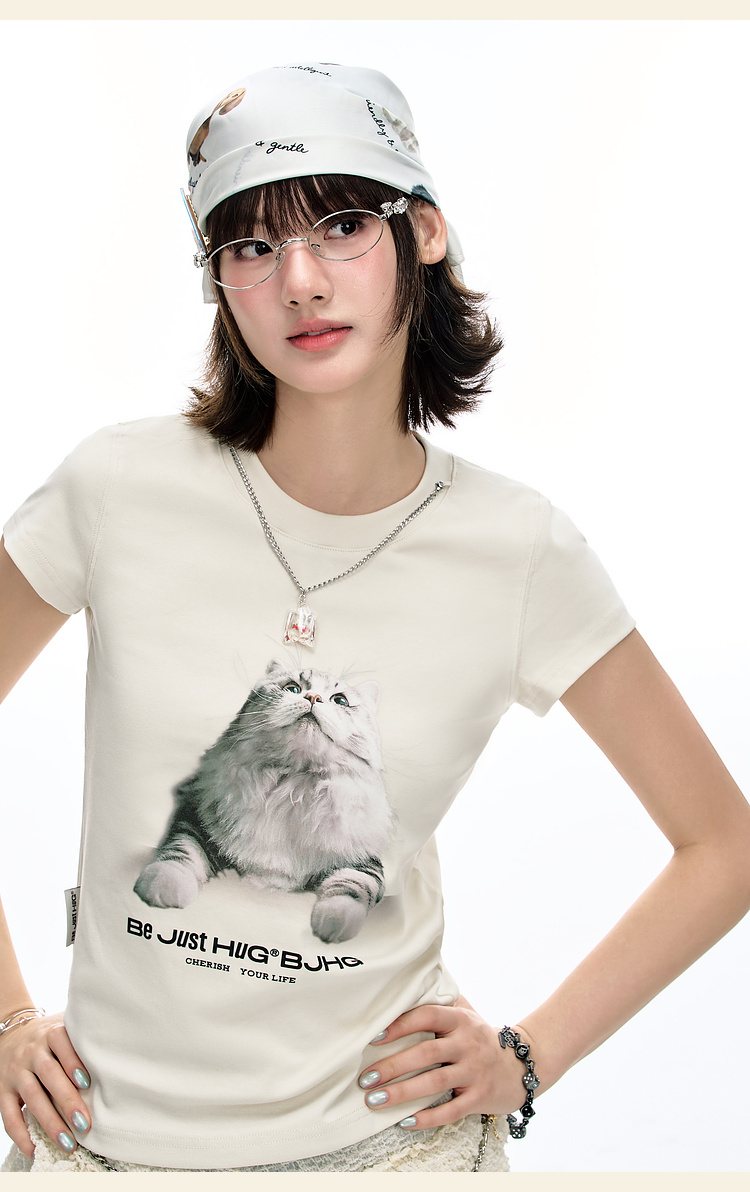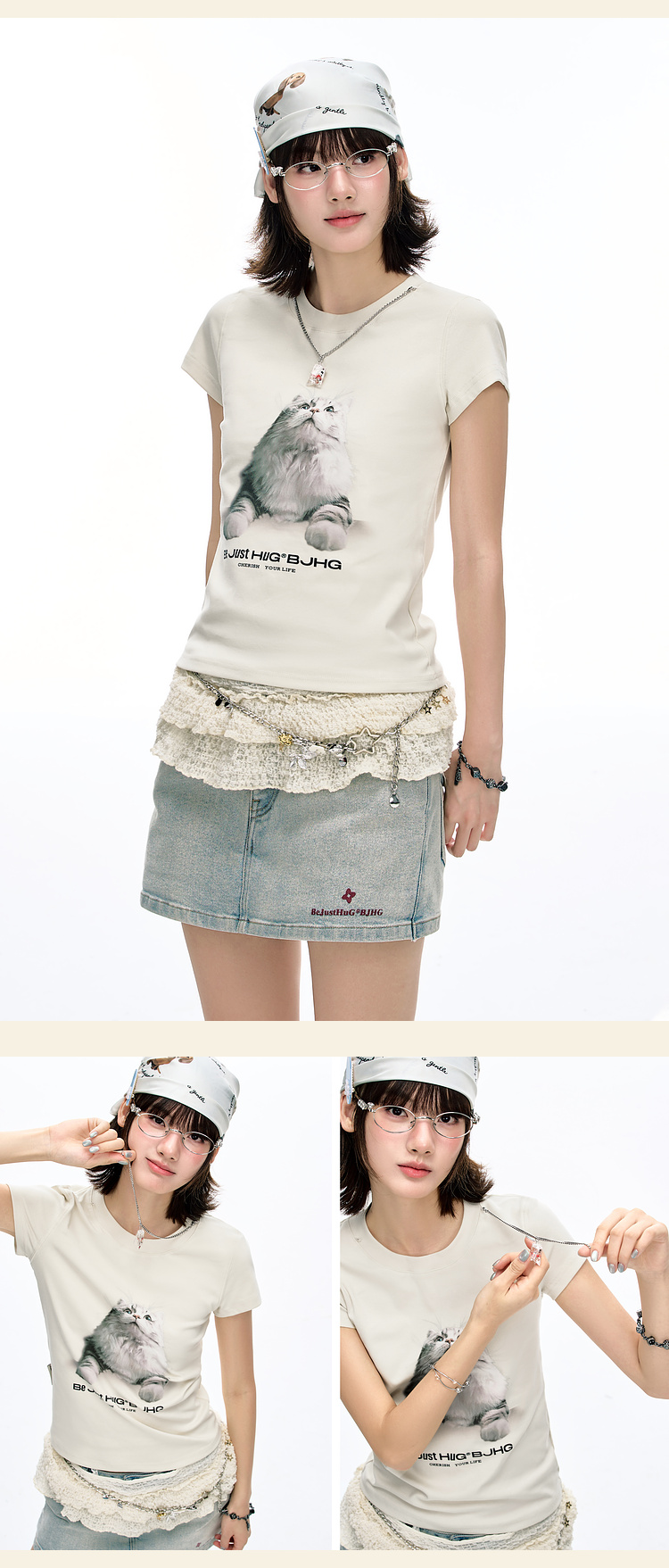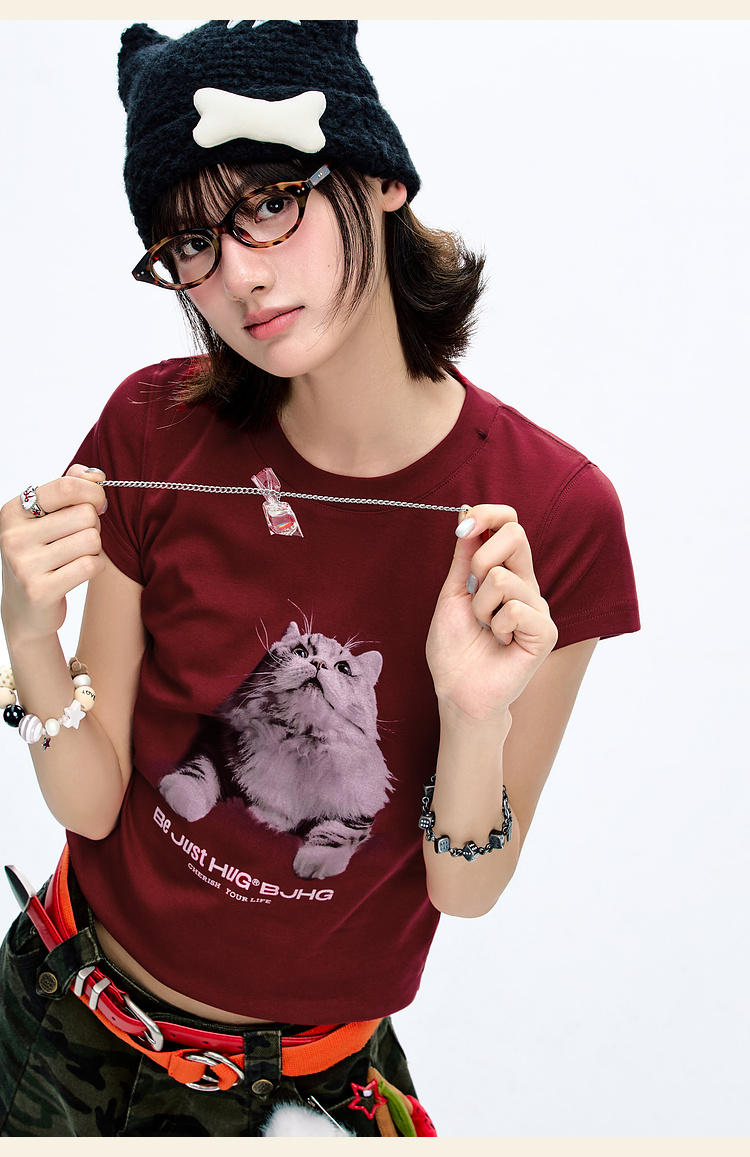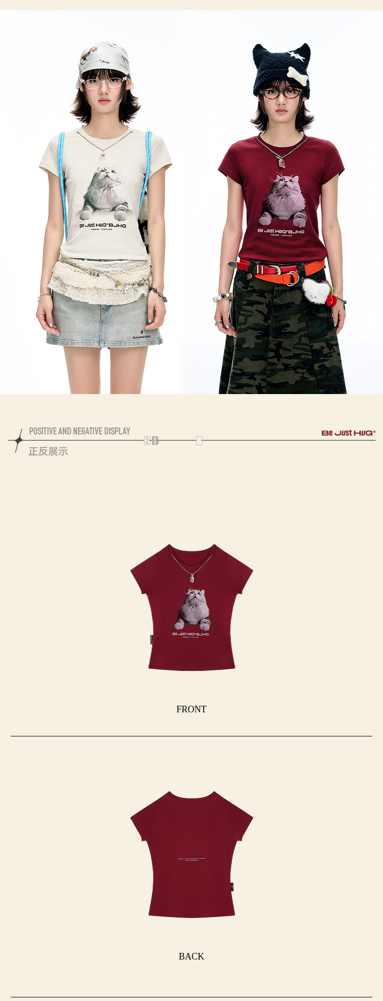BJHG不计后果小猫抓鱼T恤短袖女款夏季微弹修身半袖凉感正肩T恤女