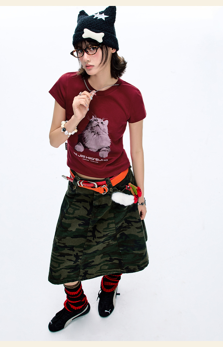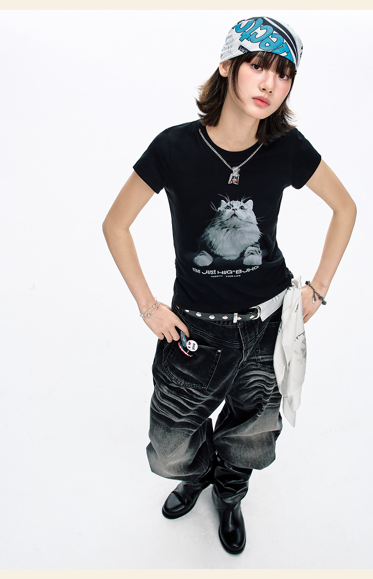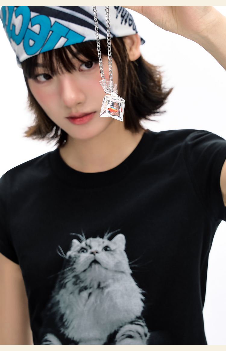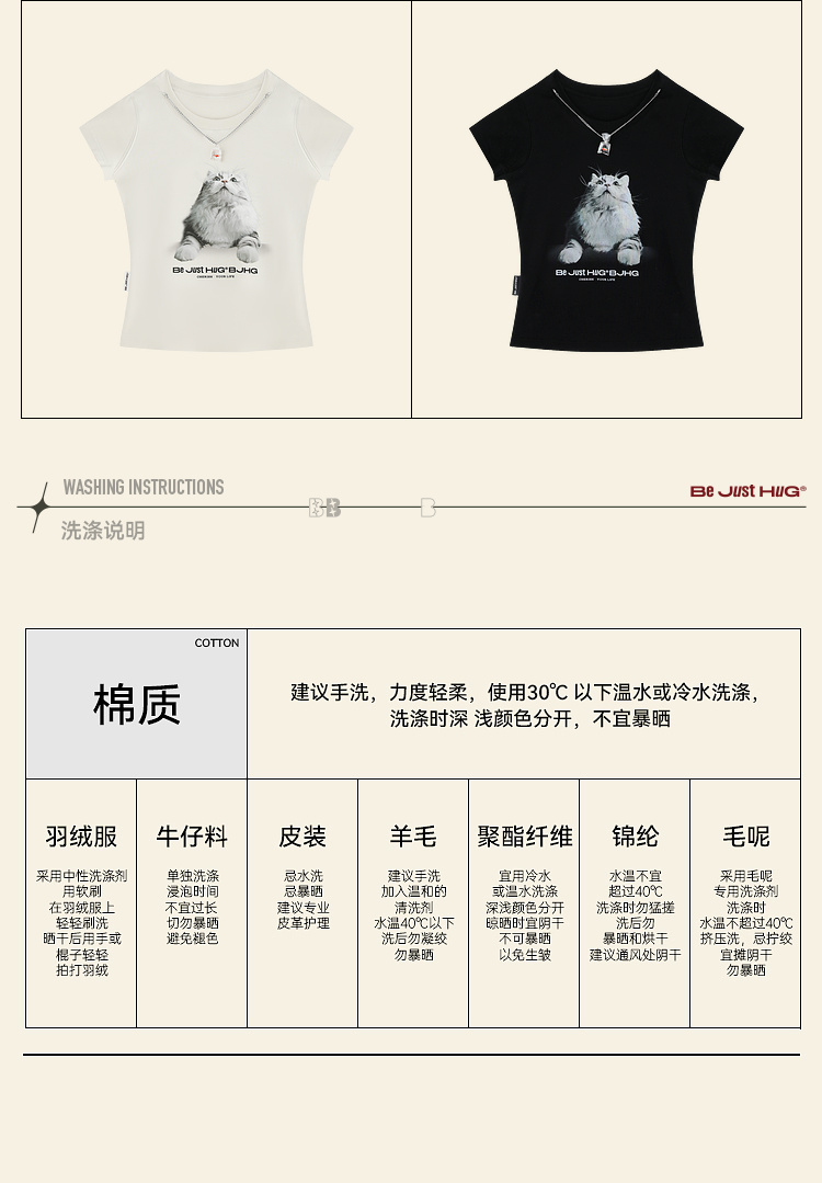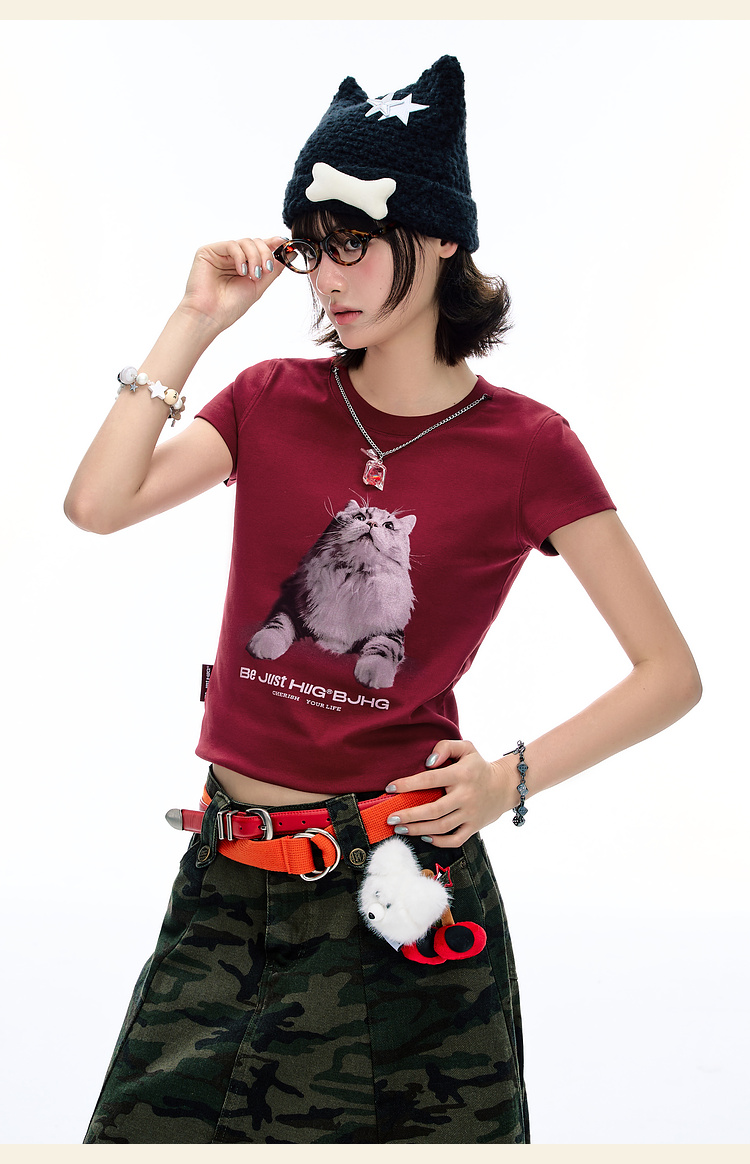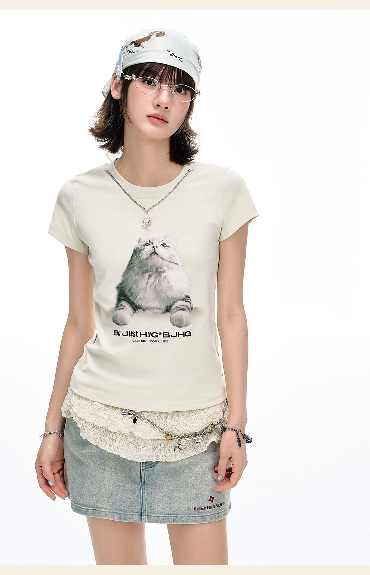 BJHG不计后果小猫抓鱼T恤短袖女款夏季微弹修身半袖凉感正肩T恤女