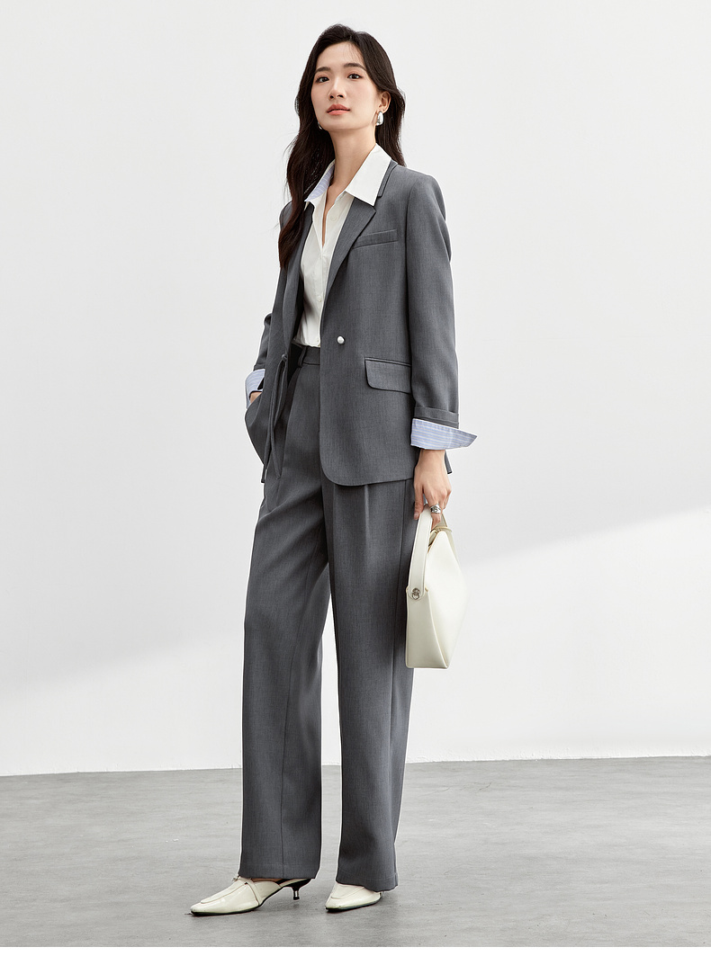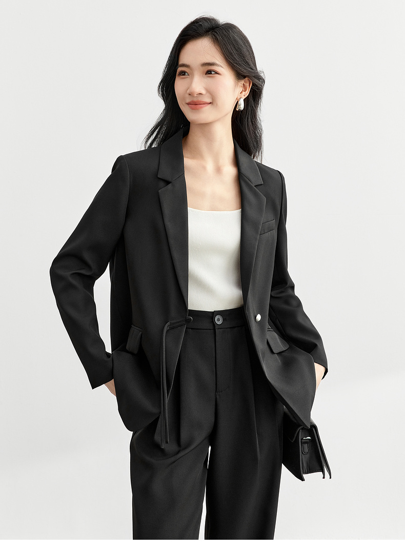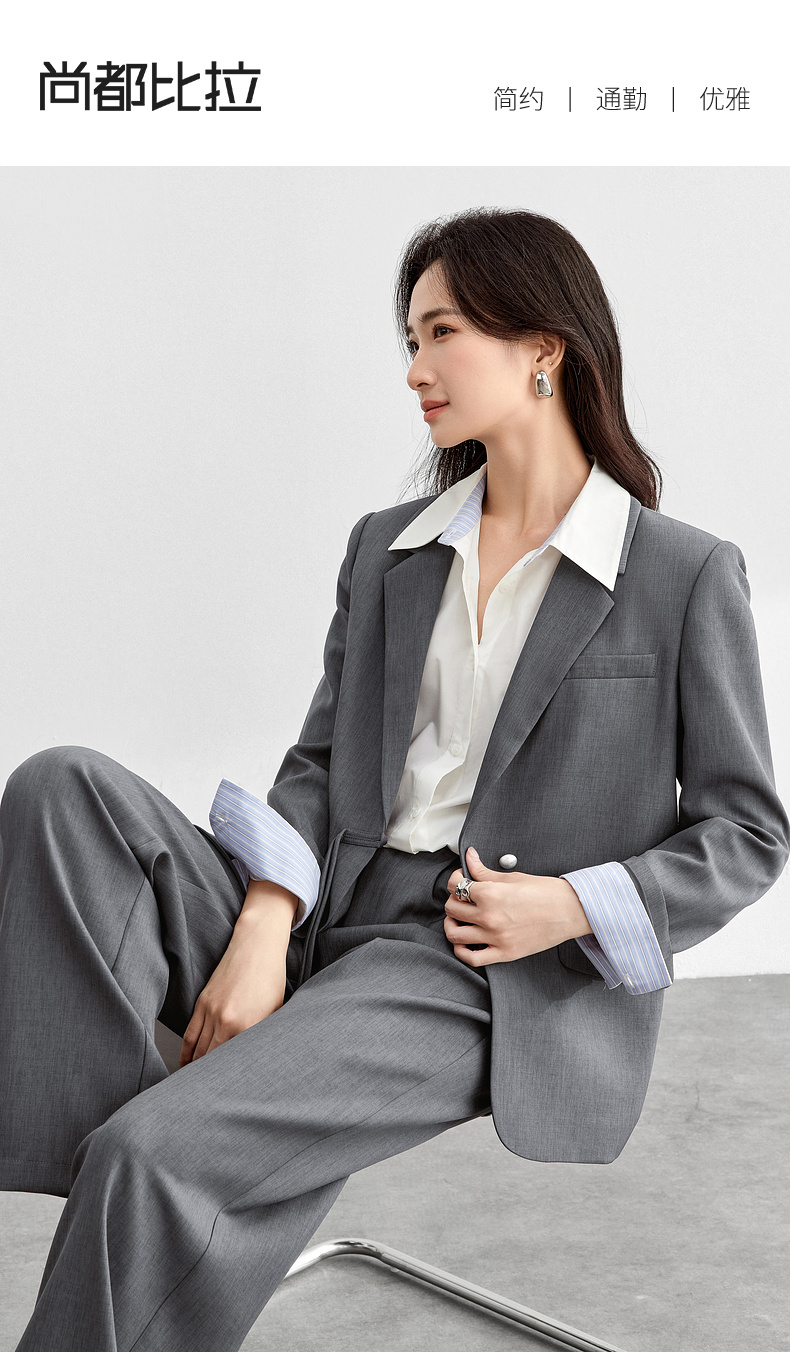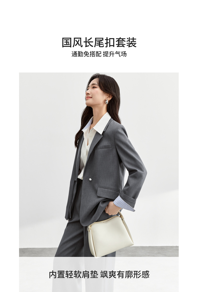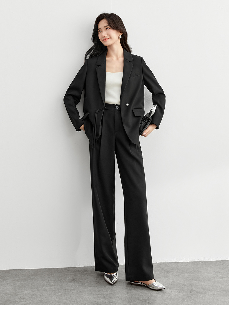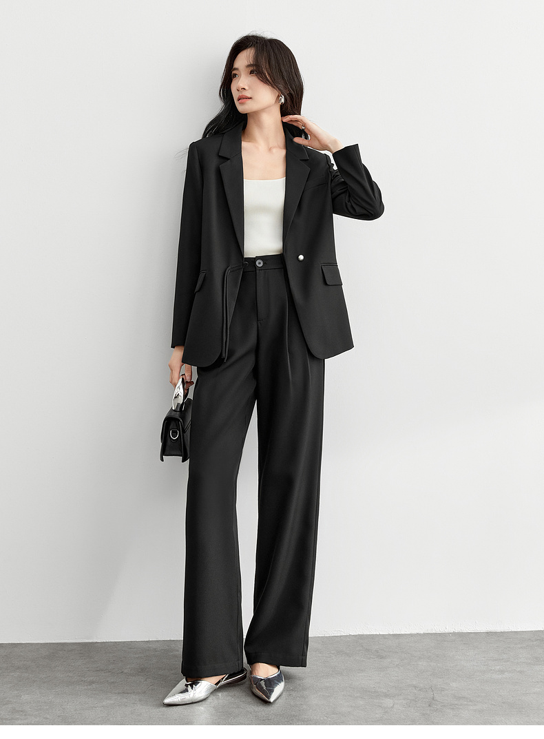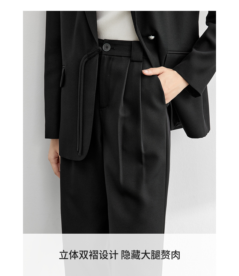 【尚都比拉】通勤国风长尾一粒扣肩垫西装外套立体双褶后腰松紧垂感长裤套装-151Z58367
