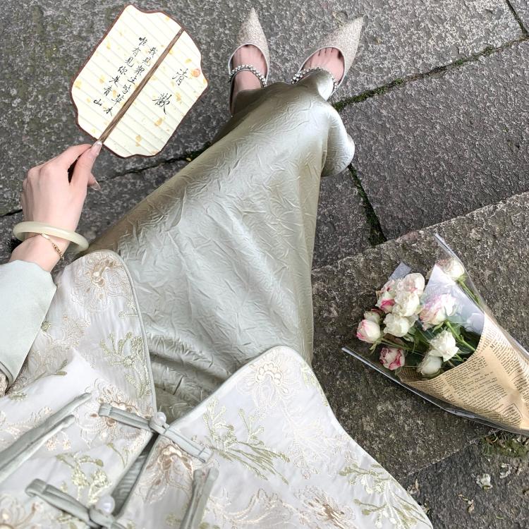 金蘑菇菇 虞美人/3D解构斜裁 醋酸暗纹吊带连衣裙